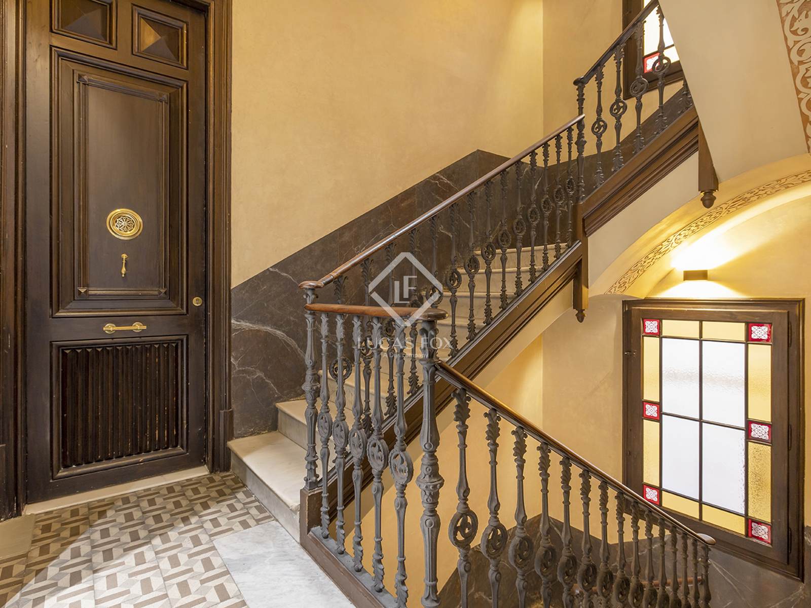 A casa recém-renovada está localizada em um lindo edifício modernista do século XX com uma entrada espetacular.