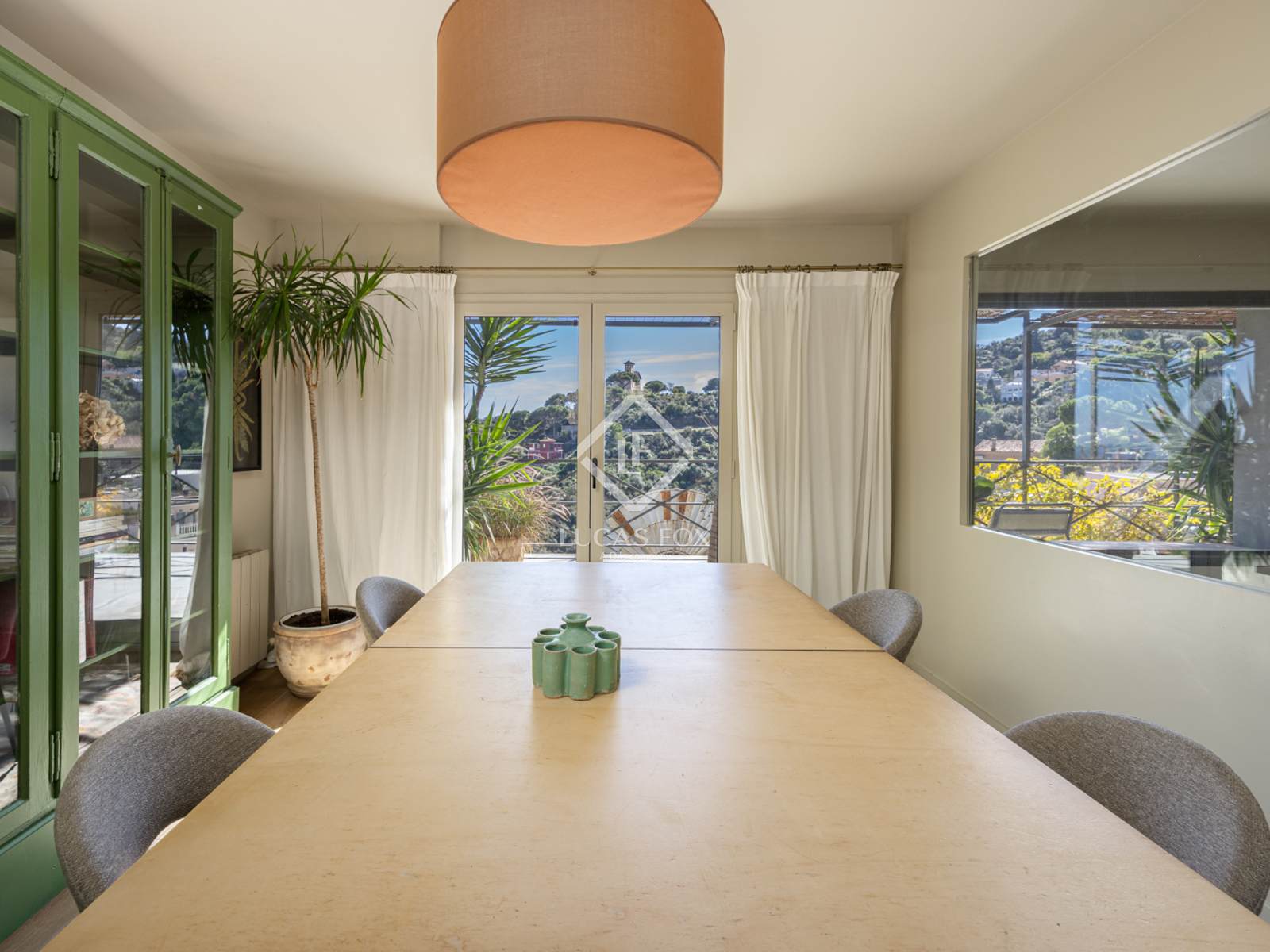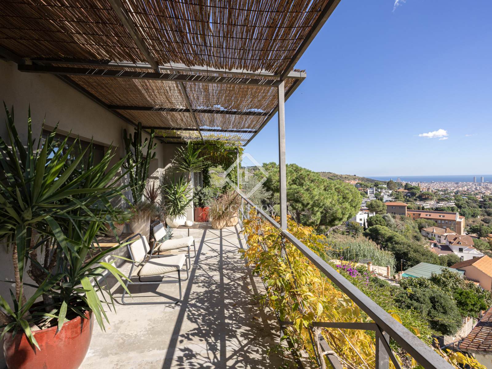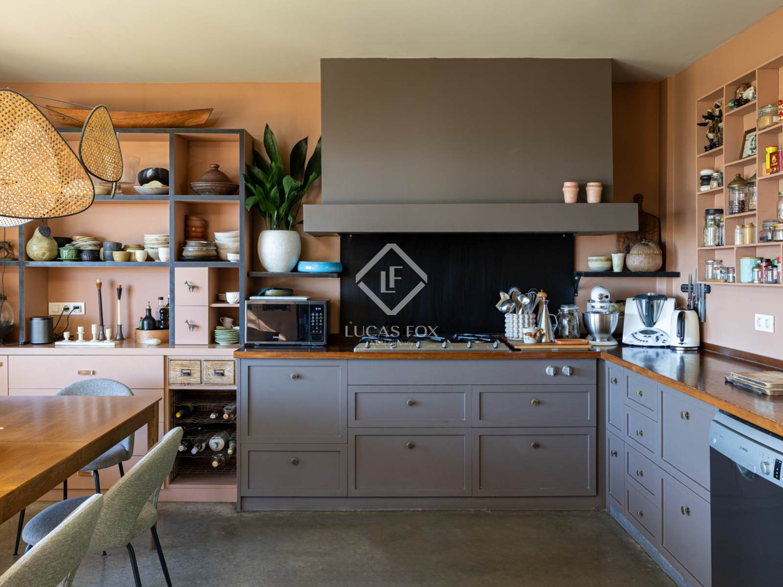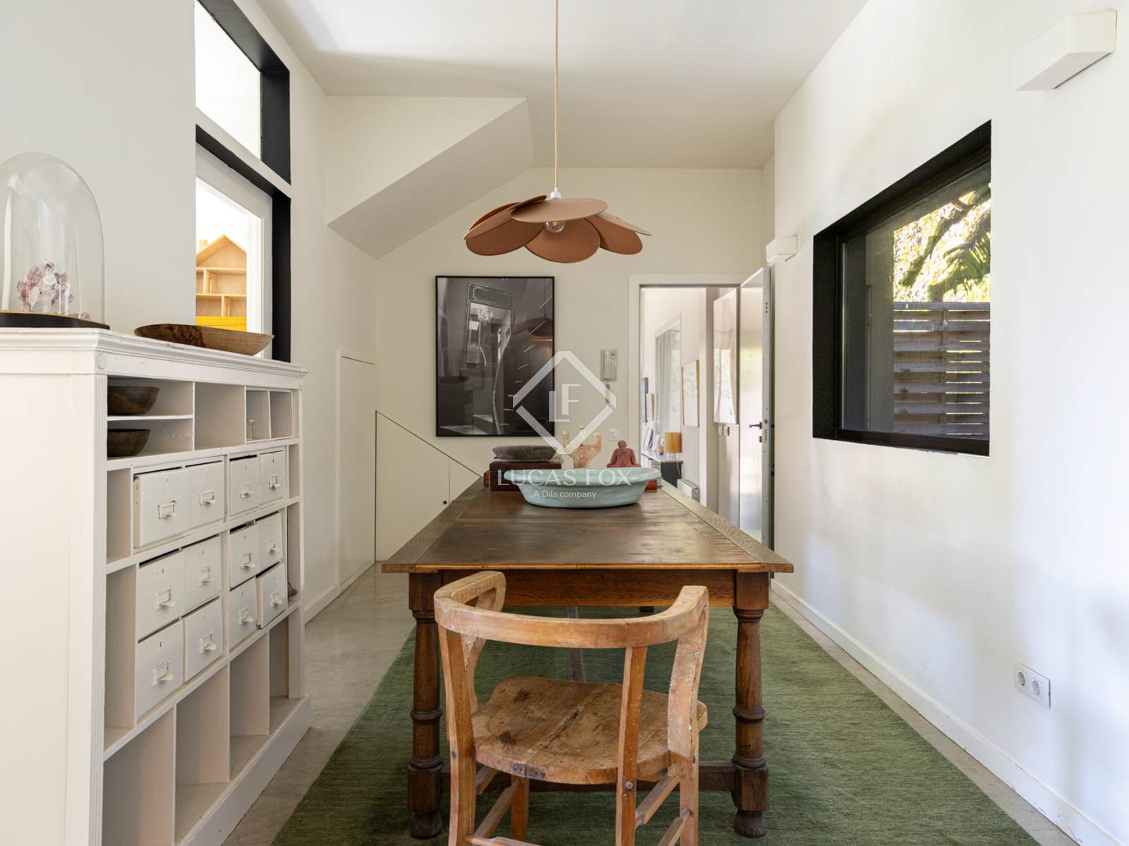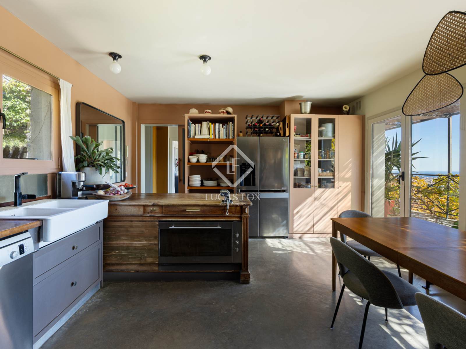 Ao entrar na casa, encontramos duas vagas de estacionamento cobertas. Uma vez lá dentro, há uma cozinha linda e aconchegante com móveis de madeira, ideal para os amantes da culinária, e acesso ao terraço de 47 m² ao longo da fachada principal. Neste mesmo andar, há uma espaçosa sala de jantar com vista para o jardim e para Barcelona, além de uma suíte com banheiro privativo.