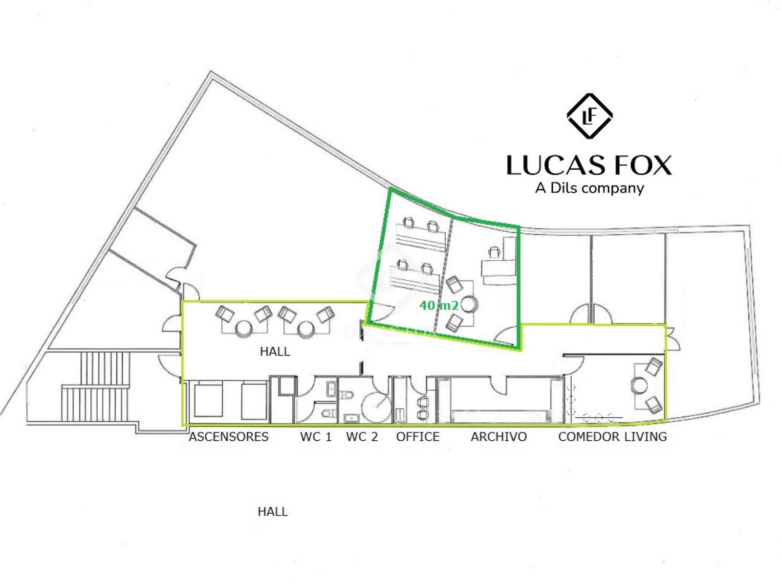 Além disso, existem 128 m² de áreas comuns, compartilhadas com os outros três escritórios, incluindo uma área de recepção, dois banheiros, um escritório, um arquivo e uma sala de estar ou sala de jantar.
