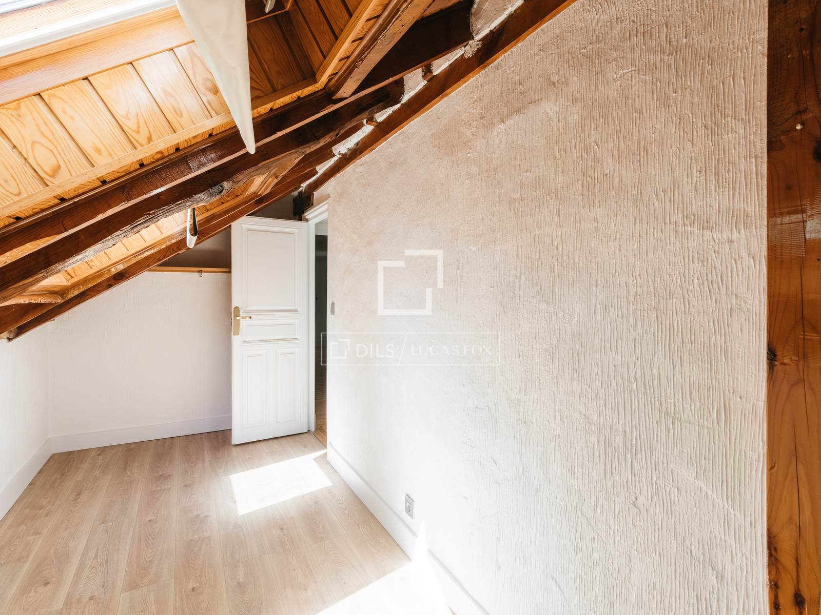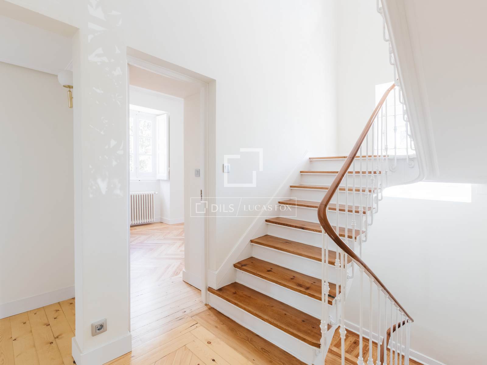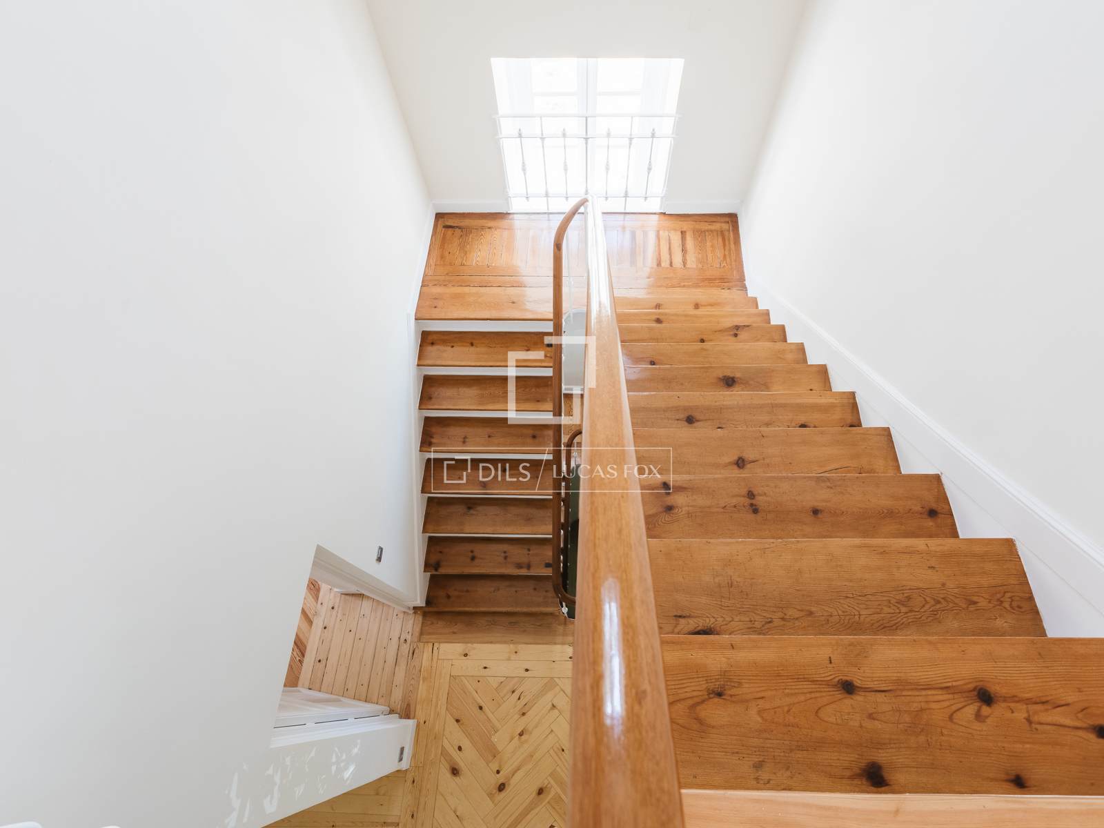 No piso principal, encontra-se um quarto versátil que pode ser usado como escritório ou closet, uma espaçosa sala de estar separada com área de jantar e uma cozinha totalmente equipada. O primeiro andar abriga a suíte principal com terraço privativo e banheiro privativo, além de outro quarto de casal, também com banheiro privativo, e dois quartos adicionais. O último andar, sob o telhado inclinado, conta com um quarto com banheiro privativo, ideal como suíte de hóspedes ou espaço de trabalho, além de áreas de armazenamento.