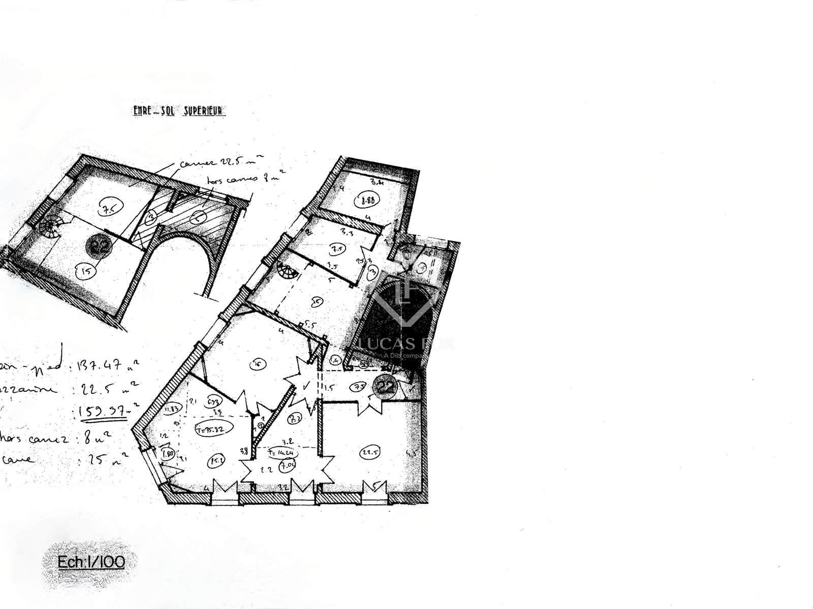 Os seus 160 m² (segundo a lei Carrez) distribuem-se da seguinte forma: hall de entrada/sala de espera com armários, 4 escritórios burgueses grandes, 4-5 escritórios mais pequenos, WC separado e uma arrecadação.