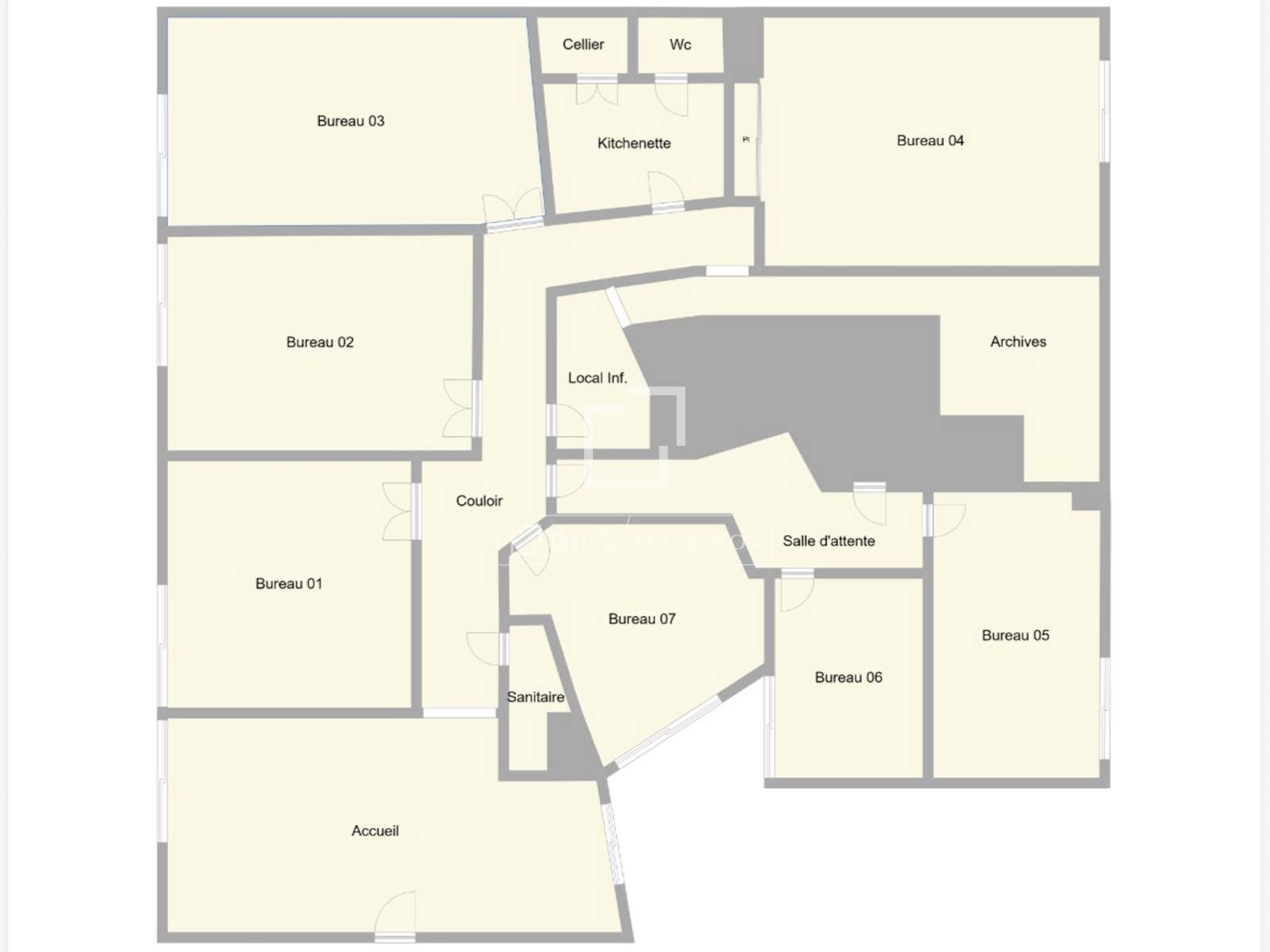 A configuração atual é a seguinte: recepção/entrada espaçosa, banheiro separado para clientes, 7 escritórios, incluindo 3 muito grandes e 4 de tamanho padrão, uma cozinha, banheiro, diversas áreas de armazenamento, uma sala de arquivo/arquivos atuais e sala de informática com painel de conexão.