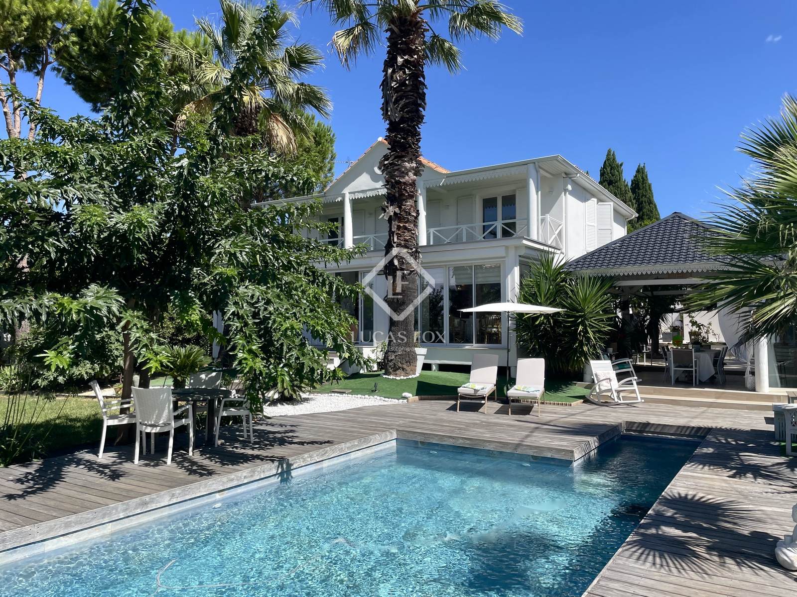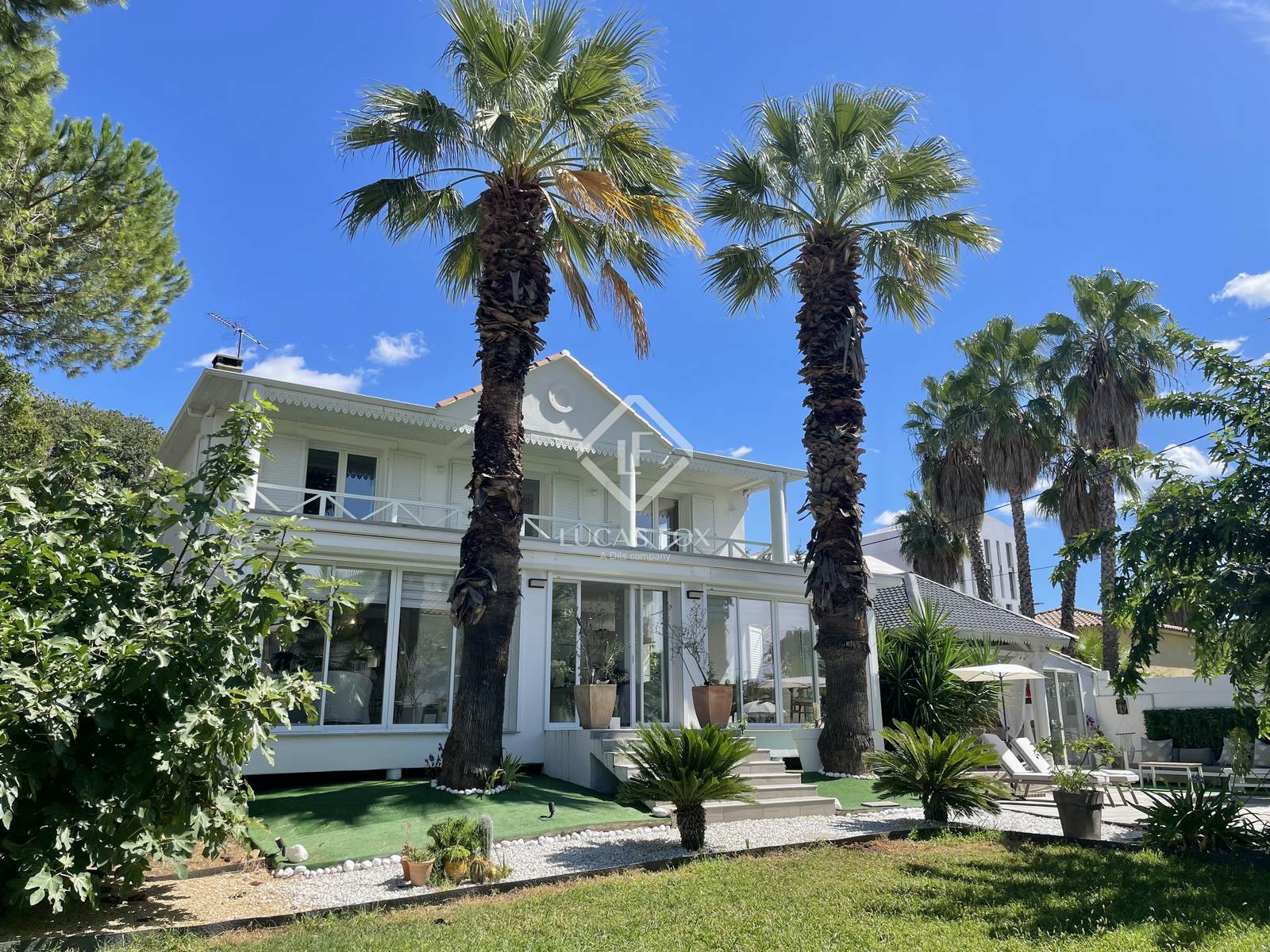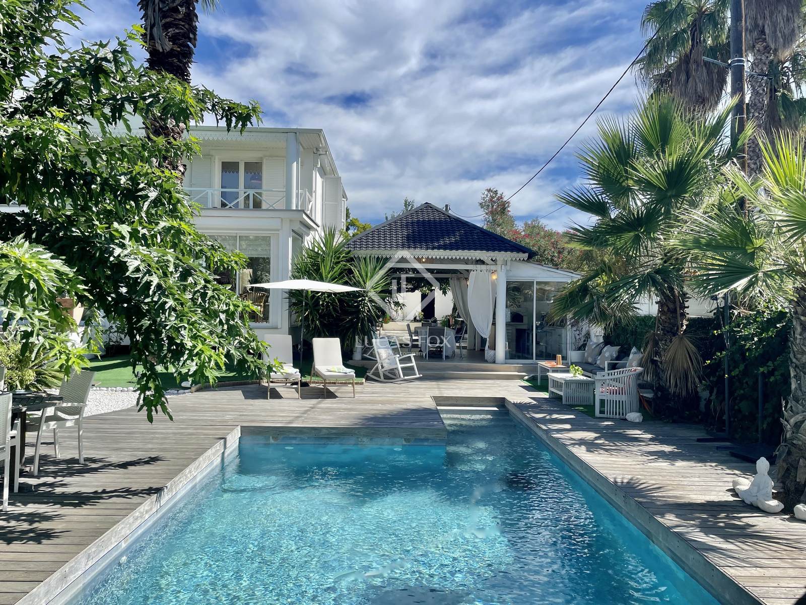 Em um nível, uma ampla sala de estar de 115 m² inclui uma soberba cozinha americana totalmente equipada com seus diversos espaços de armazenamento, sua lavanderia, uma sala de jantar e uma sala de estar com vista para o jardim, além de outra sala de TV com lareira. Todos os cômodos se abrem para o jardim e para uma casa de piscina de madeira com cozinha de verão, incluindo um magnífico forno de pizza. Diretamente conectada, a piscina (9 m x 4 m) em pedras de Bali e seu terraço, bem como um magnífico jardim com árvores frutíferas. Uma suíte com closet, banheiro e lavabo completam o nível do jardim.