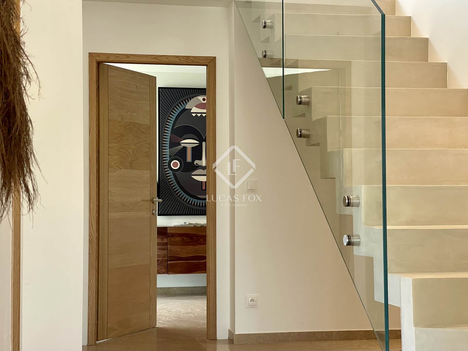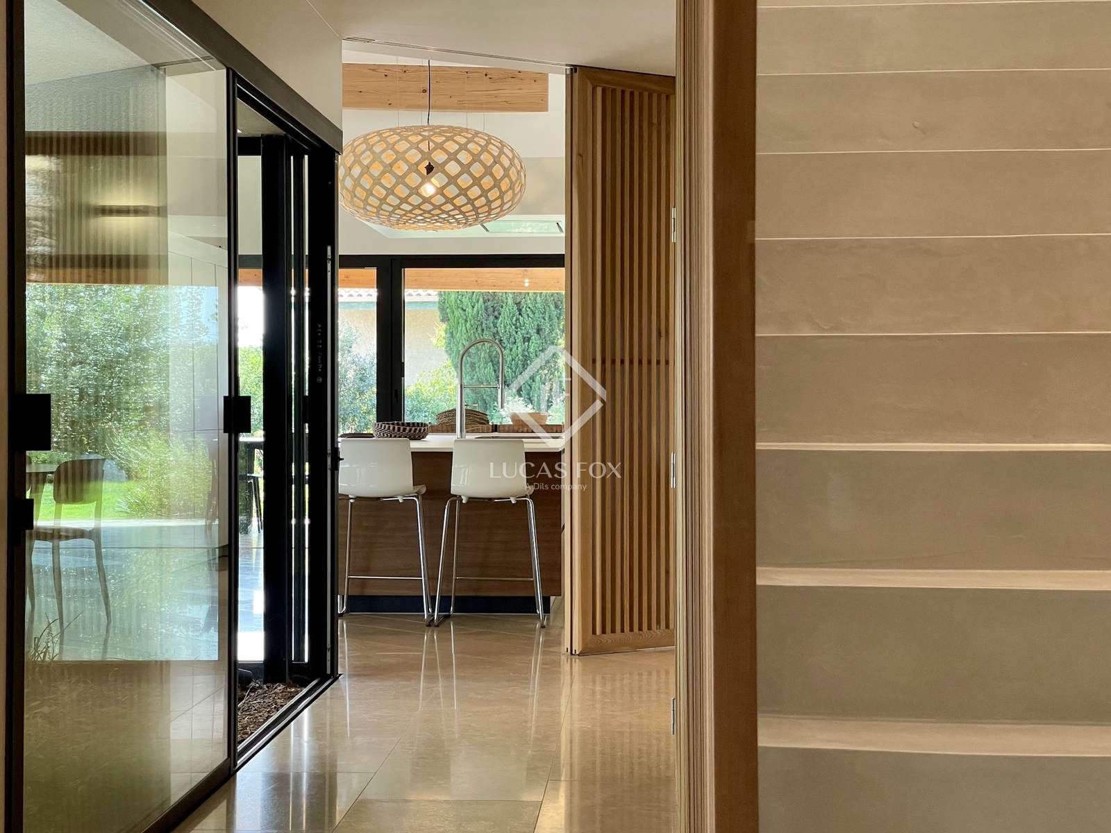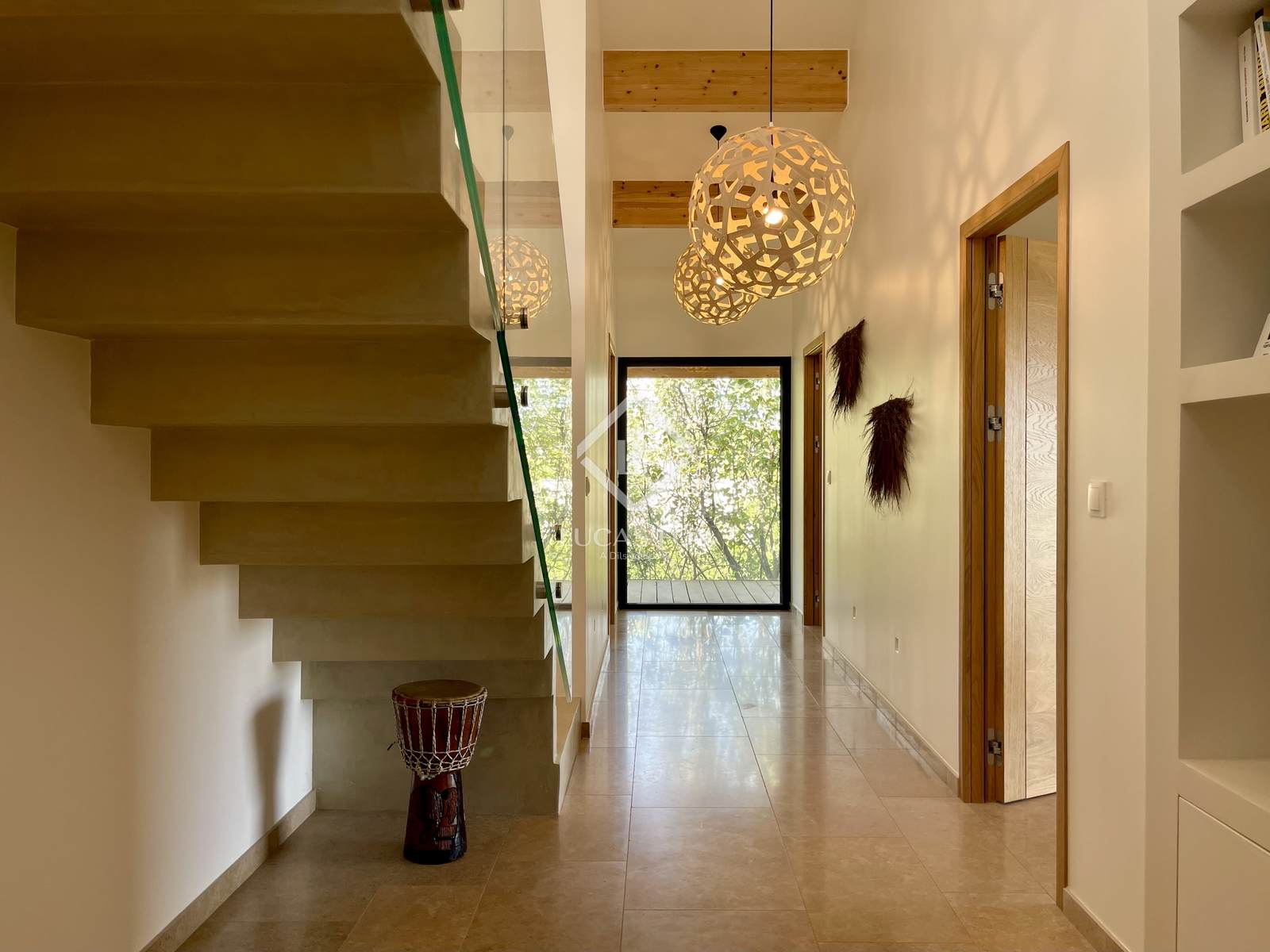 É composto por hall de entrada com vestiário, sala de estar, sala de jantar, ampla cozinha Leicht com ilha, despensa/lavandaria, WC separado, ala parental com quarto, casa de banho, escritório e WC. A outra ala da casa tem mais três quartos, uma grande casa de banho e WC separado. No piso superior encontra-se um 5º quarto com casa de banho, WC e terraço, uma sala de biblioteca e uma sala de relaxamento. Na cave, o imóvel dispõe de uma ampla garagem com 100 m² e vários locais para home cinema, sala de música com isolamento acústico completo e adega.