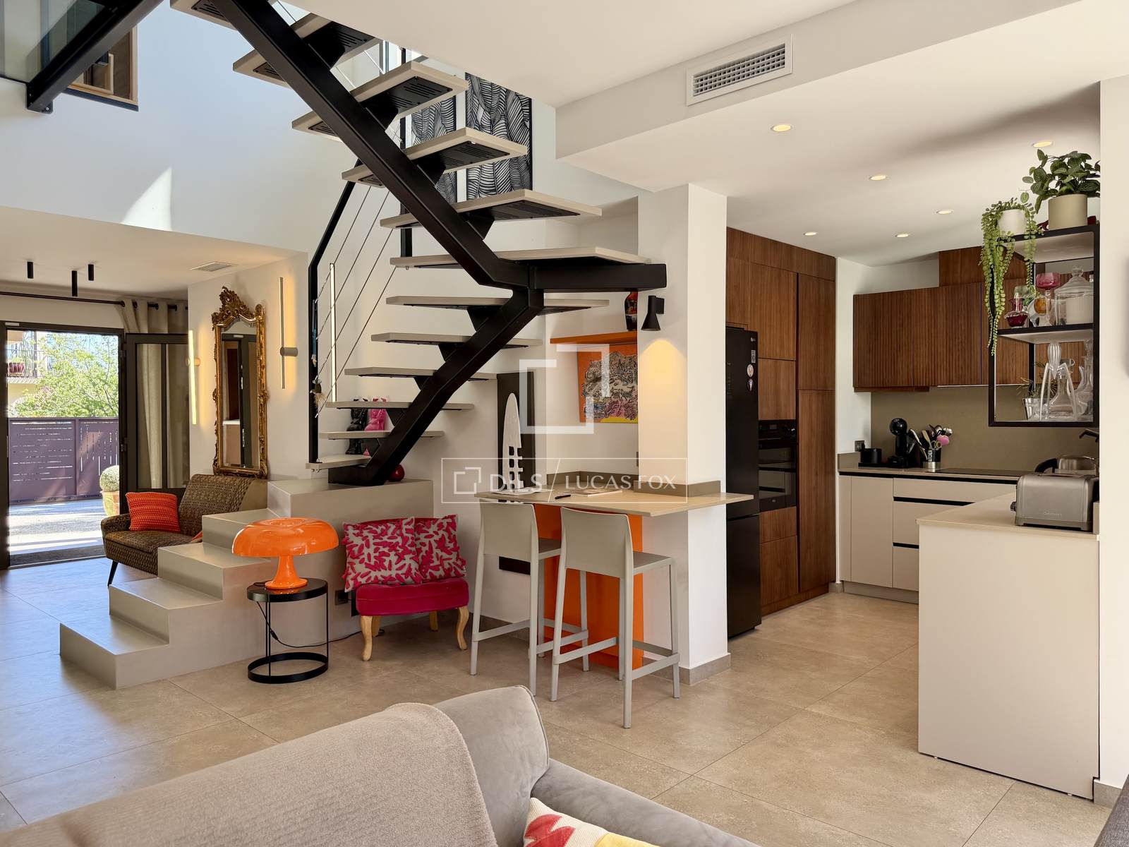 O jardim complementa os espaços de convivência com um ambiente mediterrâneo magnífico. Ao lado da cozinha, encontra-se uma área de jantar sob uma pérgola e uma churrasqueira. A piscina e seu terraço se estendem a partir da sala de estar. Espaços de armazenamento facilitam o armazenamento de móveis de jardim.