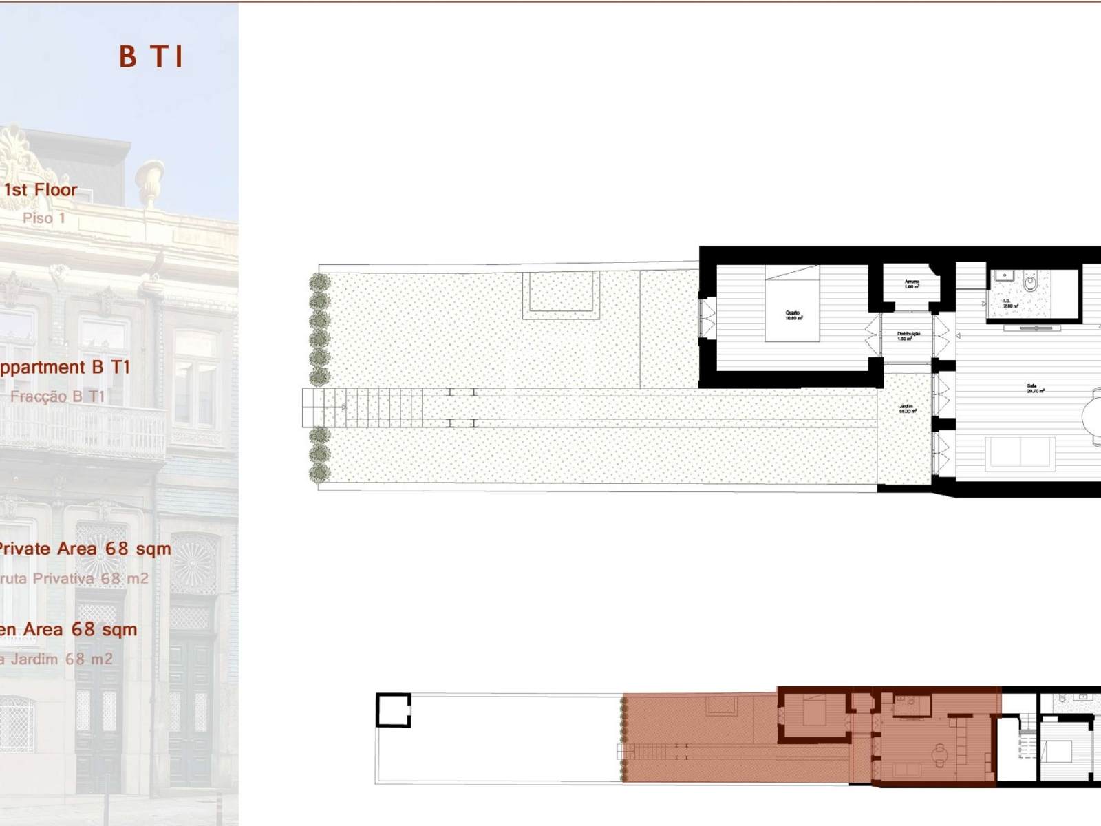 Apartamento T1 com 68 m² de área bruta e jardim privativo com 68 m², localizado na Rua Álvares Cabral, no centro do Porto.