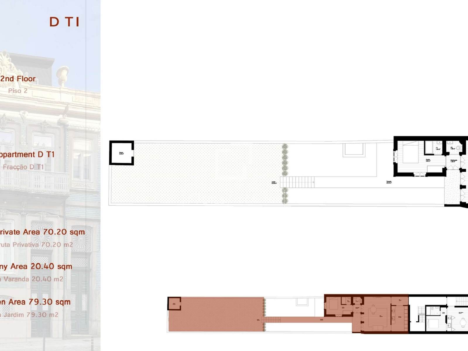 Apartamento T1 com 70 m² de área bruta, varanda com 20 m² e jardim privativo com 80 m², inserido em novo empreendimento na Rua Álvares Cabral, no centro do Porto.