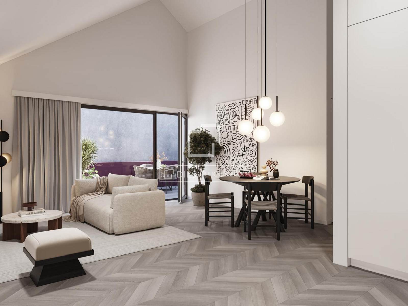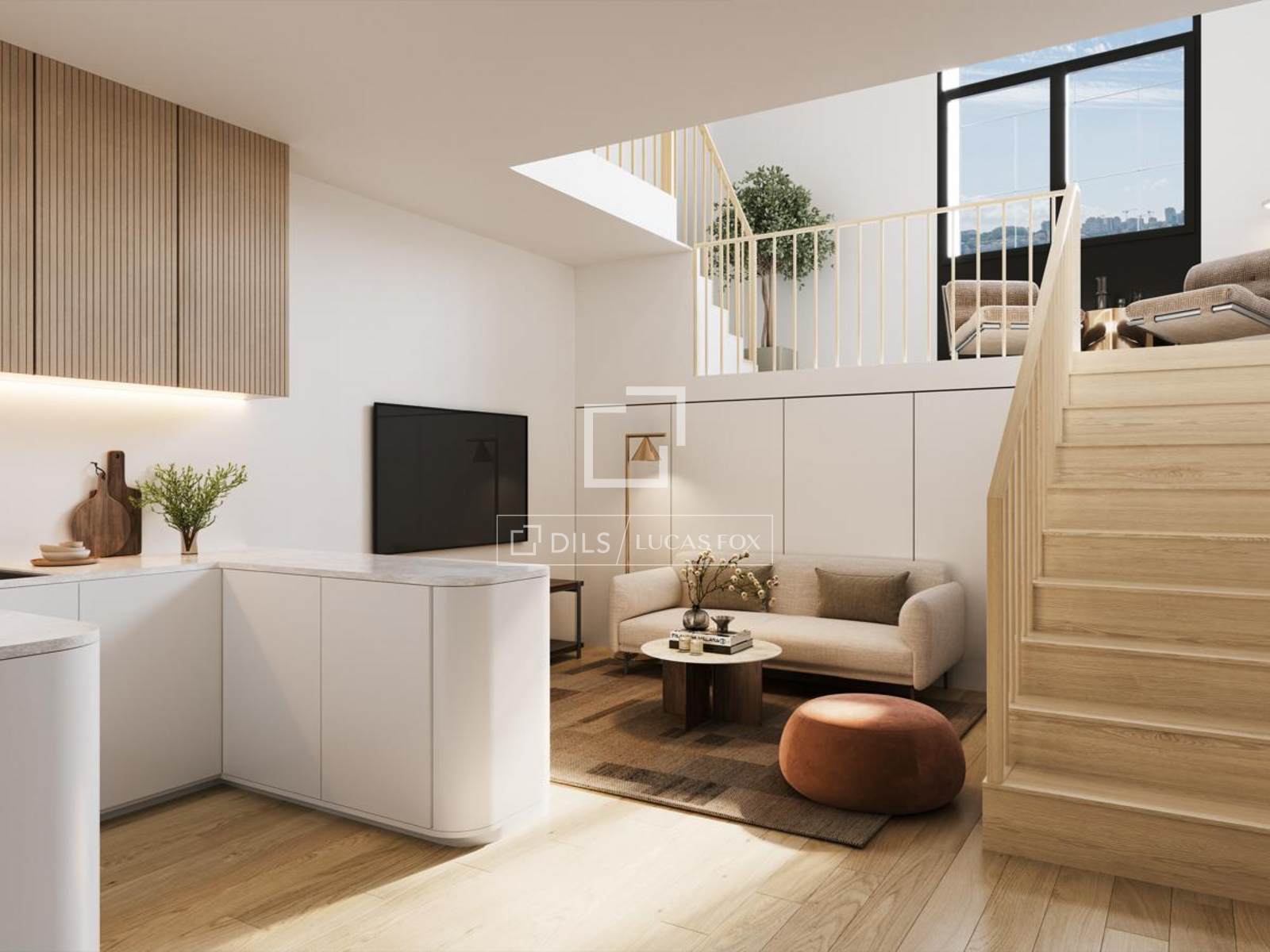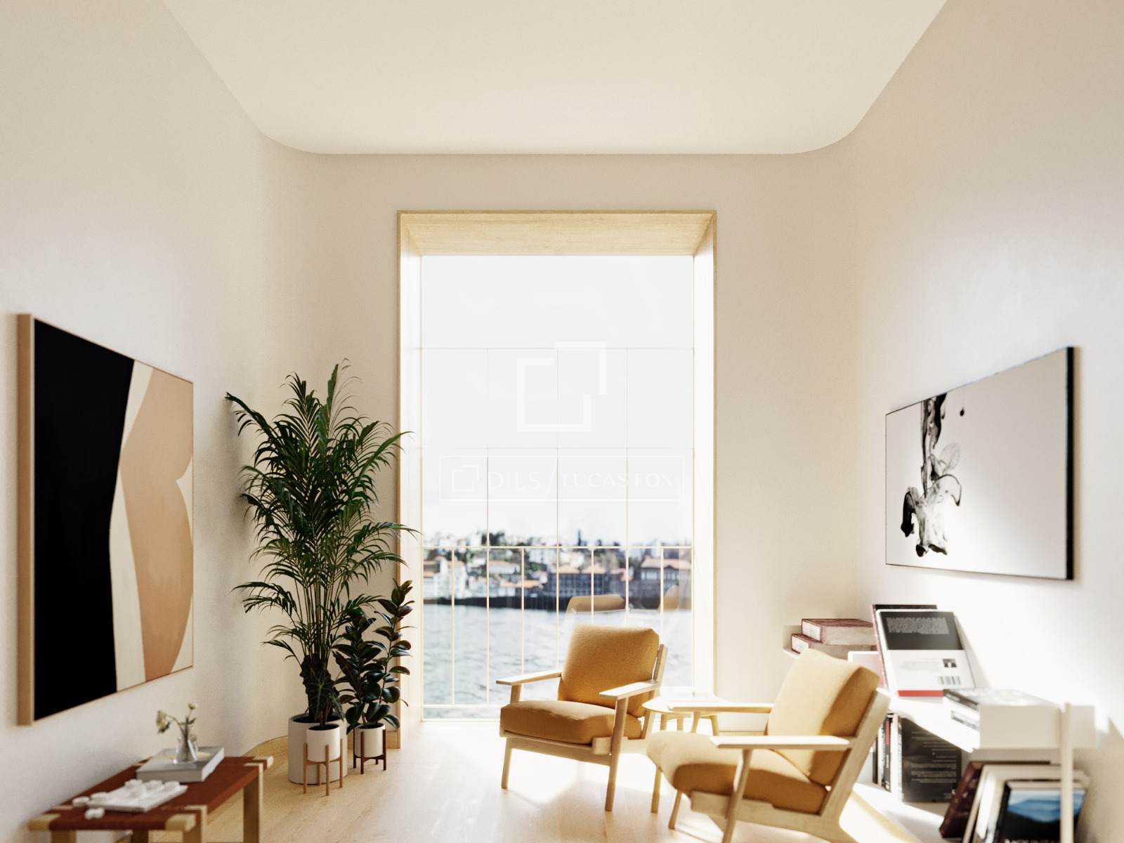 Apartamento T1 com 44 m² de área bruta privativa, 20 m² de terraço e um lugar de estacionamento, localizado no Cais da Pescaria, em Vila Nova de Gaia, na primeira linha de rio.