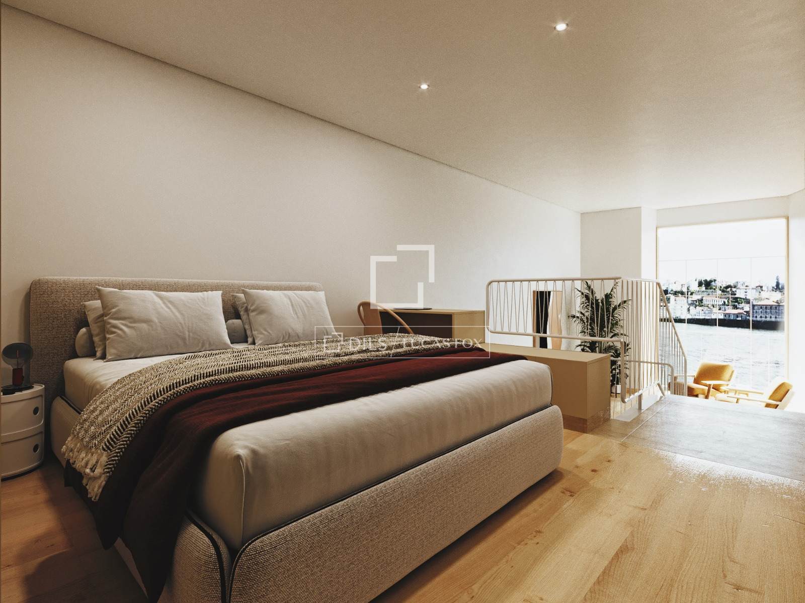 Apartamento T1 com 36 m² de área bruta privativa e 18 m² de terraço, localizado no Cais da Pescaria, em Vila Nova de Gaia, na primeira linha de rio.