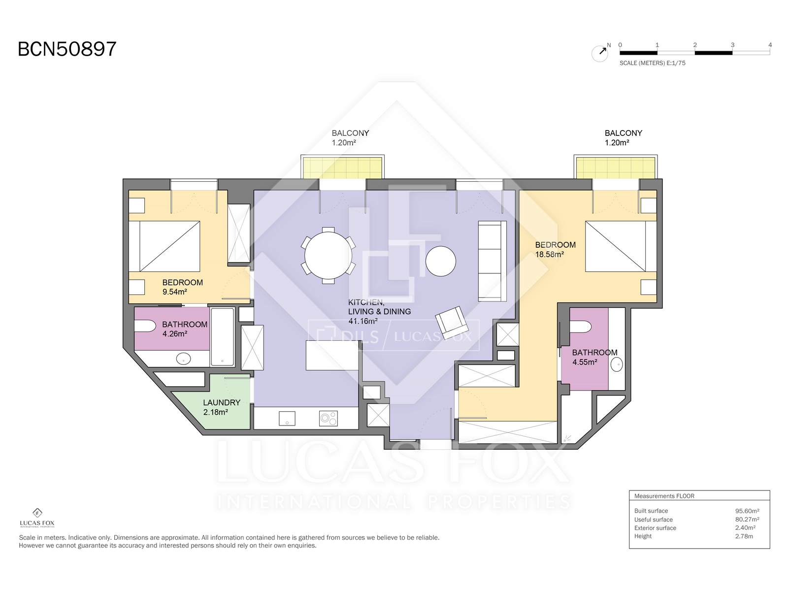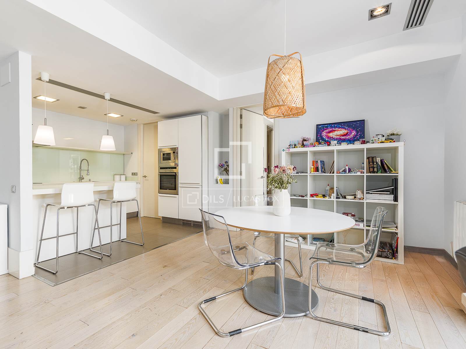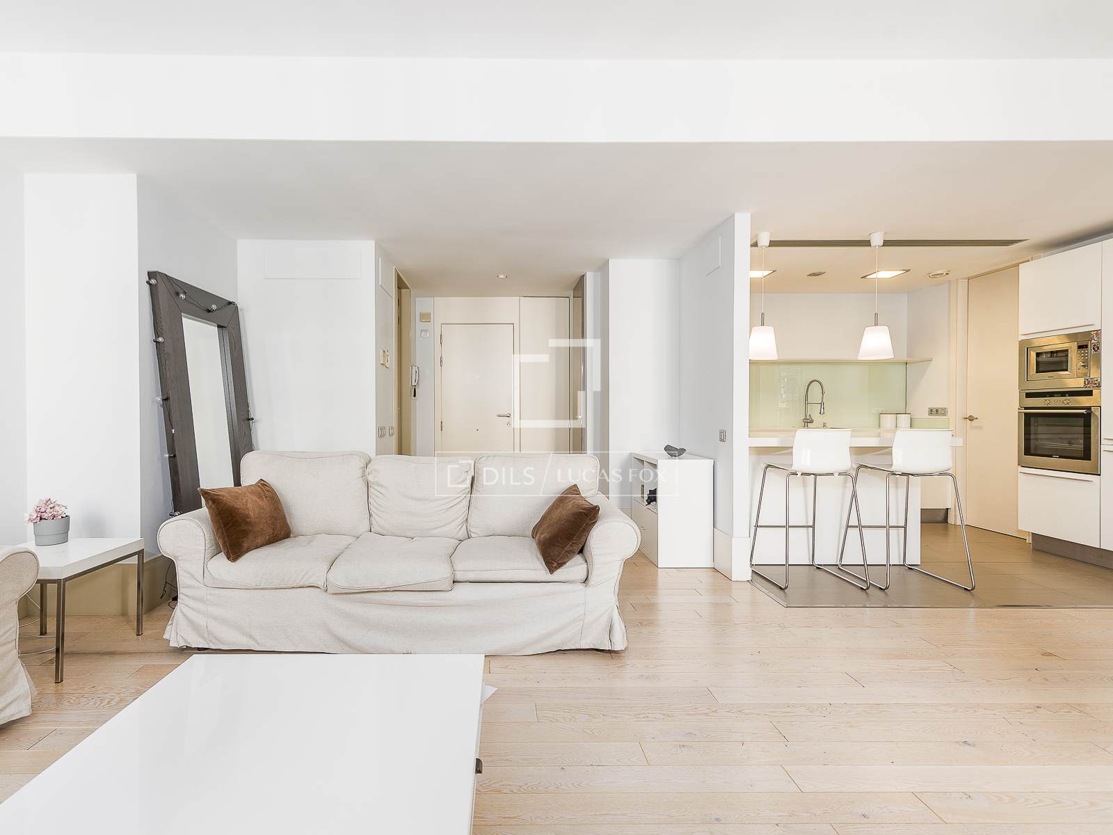 O apartamento possui uma área de estar ampla e iluminada, com muita luz natural graças às suas duas grandes varandas com vista para o Passeig de Gràcia. É composto por uma sala de estar/jantar integrada à cozinha americana, totalmente equipada com todos os eletrodomésticos necessários. Ao lado da cozinha, encontra-se uma área de serviço separada, com máquina de lavar e secadora.
