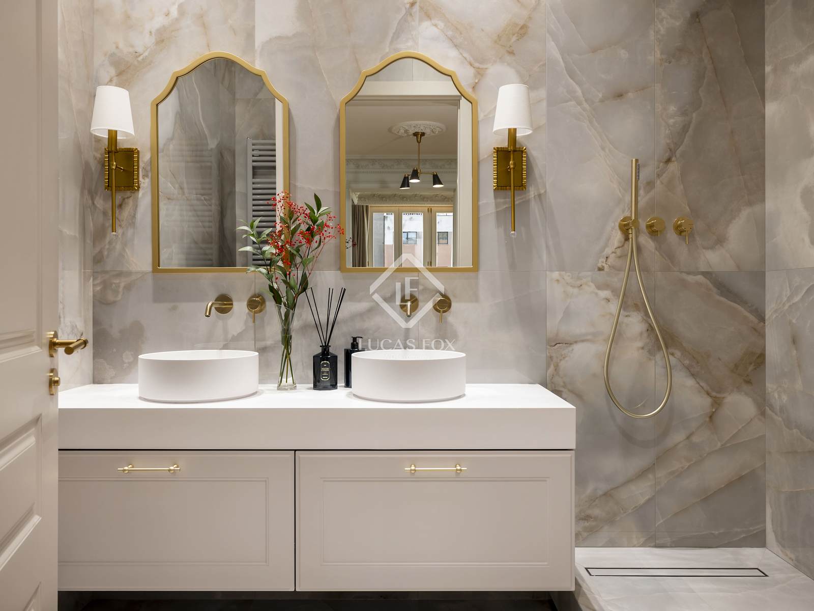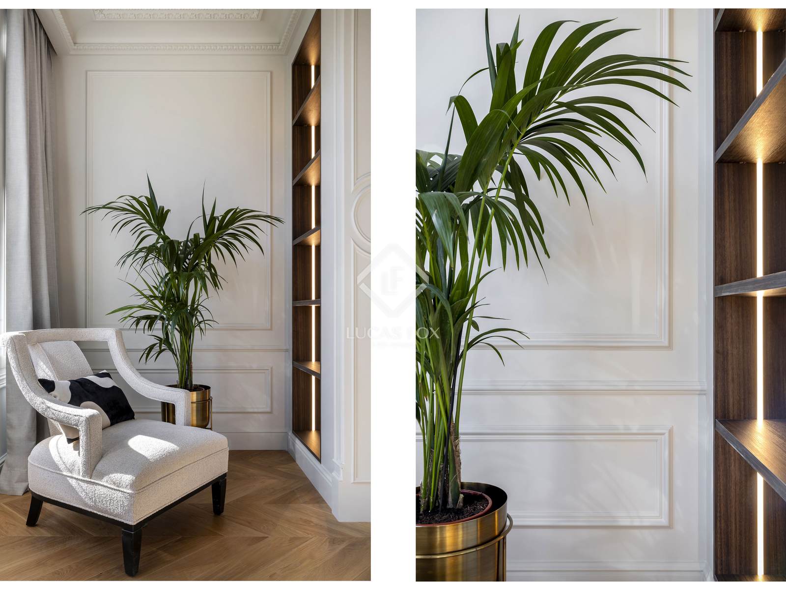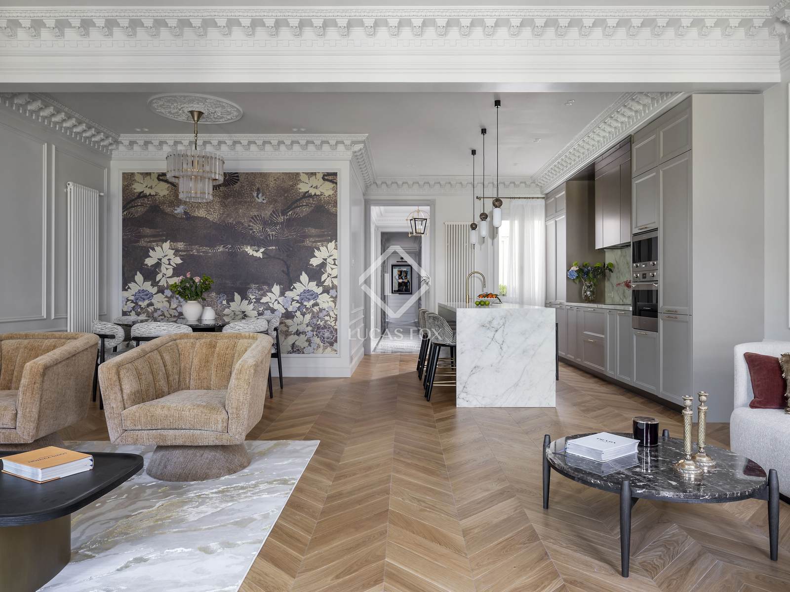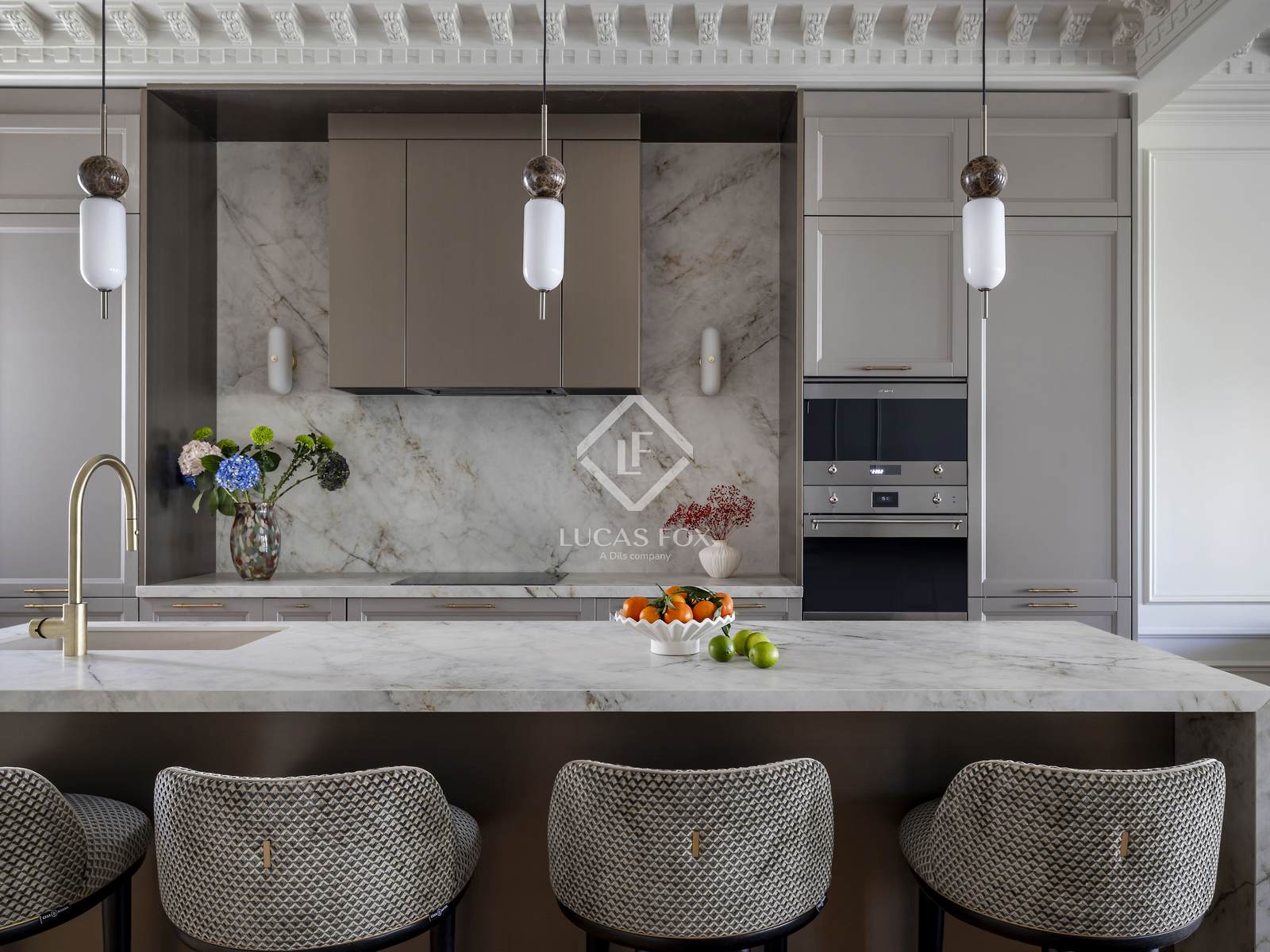 O apartamento de 198 m² abre-se para um espaçoso hall de entrada com piso de mármore natural, que conduz a uma área social de 68 m² em plano aberto com cozinha italiana NovaCucina integrada. Este espaço central foi magistralmente redesenhado para oferecer um ambiente fluido que maximiza a luminosidade e a sensação de amplitude, complementado por elegantes varandas francesas e vistas deslumbrantes para o Hotel Majestic e o Passeig de Gràcia. O resultado é uma atmosfera distinta e refinada — um cenário verdadeiramente único no coração do Eixample Dreta, em Barcelona. A cozinha está totalmente equipada com eletrodomésticos Smeg, duas geladeiras, dois freezers, uma adega e uma grande ilha com acabamento em porcelanato italiano Florim de alta qualidade.
