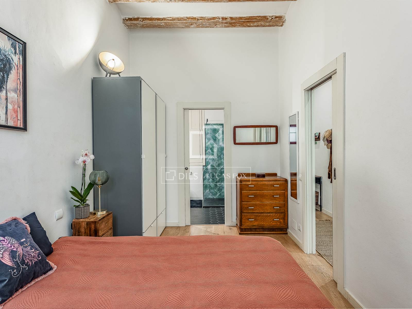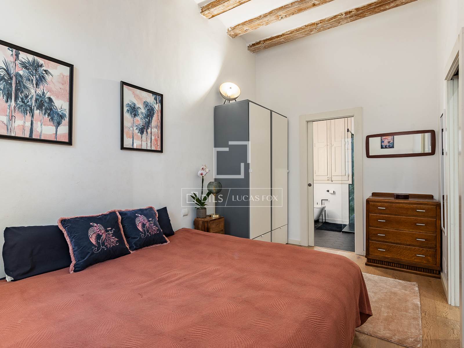 O apartamento oferece dois quartos de casal espaçosos e tranquilos, com vigas de madeira expostas que conferem aconchego e personalidade ao ambiente. Um dos quartos inclui banheiro privativo, e há ainda um segundo banheiro completo, complementando a distribuição do apartamento.