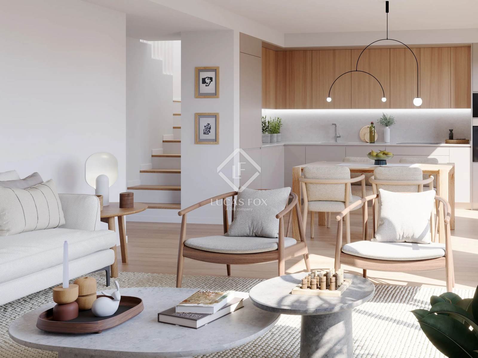Cobertura duplex exclusiva de 3 quartos, nova construção, com 77 m² de espaço interno e um terraço de 26 m², estacionamento e design sustentável.