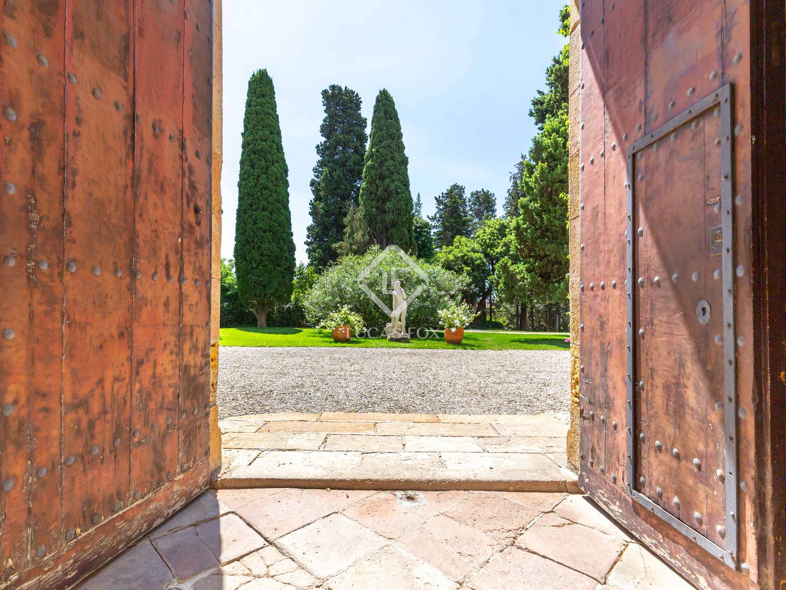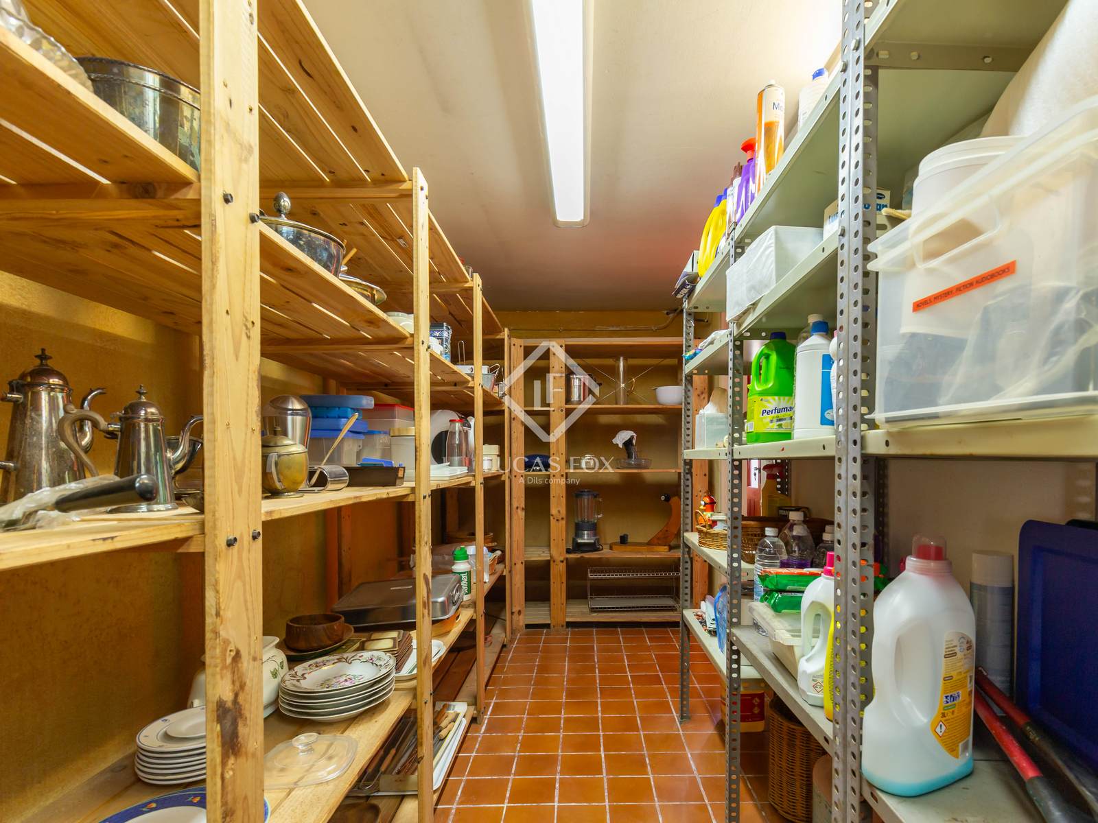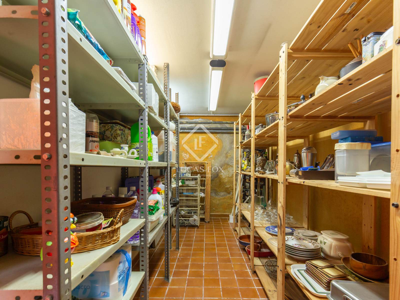 O acesso à casa é feito a partir do jardim compartilhado por uma área de cascalho no nível do solo. Um amplo hall de entrada nos recebe, oferecendo belas vistas e acesso ao pátio central com terraço de 60 m² e a uma varanda de 23 m², ao redor da qual se abrem os diferentes cômodos da propriedade, como nas antigas casas romanas. O hall de entrada possui guarda-roupas embutidos e apresenta a escada principal de madeira que leva ao primeiro andar. O banheiro de hóspedes com chuveiro está localizado neste mesmo espaço. O hall de entrada leva a duas salas de estar espaçosas. A convidativa sala de estar e jantar formal de dois níveis, com piso em parquet de mogno e uma escada secundária, ideal para o inverno, desfruta de vistas do jardim compartilhado e privativo de um lado e do pátio do outro. Este espaço se comunica diretamente com a cozinha e a espetacular biblioteca. A biblioteca se destaca por seu teto alto, composto por uma abóbada de berço e uma grande janela voltada para o sul, por onde flui a luz natural, tornando-a um espaço ideal para ler, ouvir música ou relaxar. A casa tem um segundo acesso a partir do hall da área comum através da biblioteca mencionada anteriormente, pois está localizada na seção central da casa de fazenda palaciana. Uma sala multiuso com paredes revestidas de madeira conecta a biblioteca e a sala de jantar da família. A sala de jantar diária ou familiar se abre através de grandes portas francesas para o pátio central, inundando-o com luz natural. É adjacente à cozinha confortável com janelas com vista para o pátio e dois balcões de café da manhã paralelos, ideais para cozinhar com luz natural. A cozinha também tem acesso direto à sala de jantar formal. Do hall de entrada, você pode acessar a segunda sala de estar espaçosa, que está localizada do outro lado do pátio, em frente à sala de jantar da família. Esta sala de estar maravilhosa e convidativa possui pisos de mármore e grandes portas francesas, permitindo que o espaço interno-externo flua perfeitamente, tanto para o pátio quanto para o jardim privativo, que está conectado a um terraço de 29 m² com deck de madeira a oeste, ideal para uma área de relaxamento. É um espaço ideal para as noites de verão e para desfrutar do jardim. O térreo é completado por uma garagem privativa para dois carros, motos e bicicletas, dois depósitos e uma escada de serviço com um corredor que leva à sala de jantar da família.