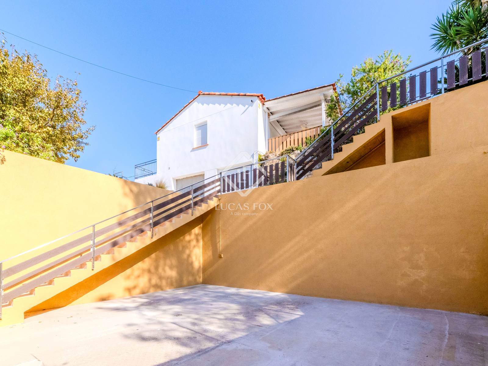 A fachada é voltada para o sul, recebendo sol o dia todo, e conta com vários terraços ao redor da casa. Inclui também estacionamento fechado para dois veículos.