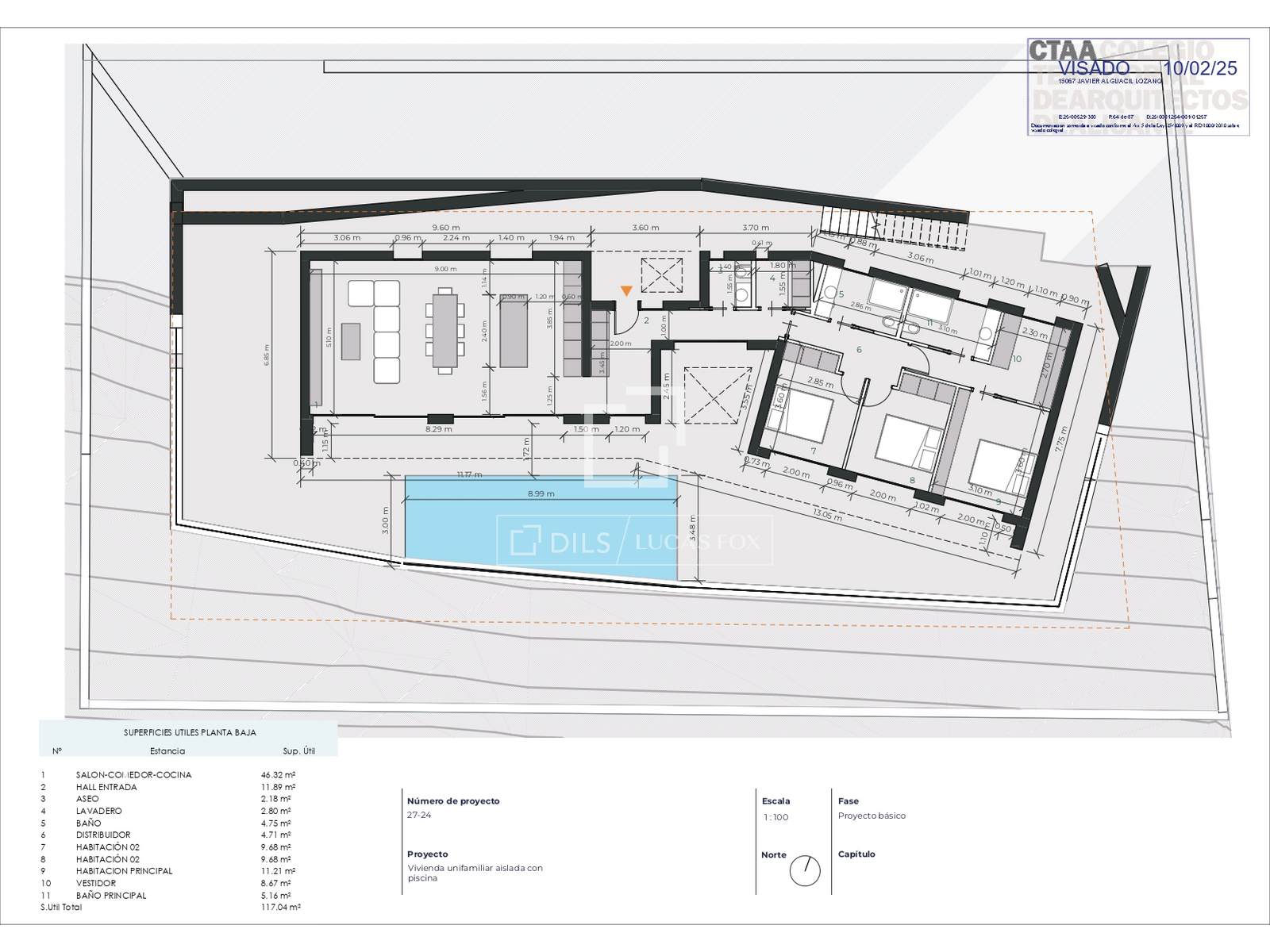 No exterior, a casa abre-se para um terraço descoberto de aproximadamente 40 m², que dá acesso direto a uma piscina privativa de 33 m², criando um espaço ideal para relaxar, receber visitas e desfrutar do clima da Costa Blanca.
