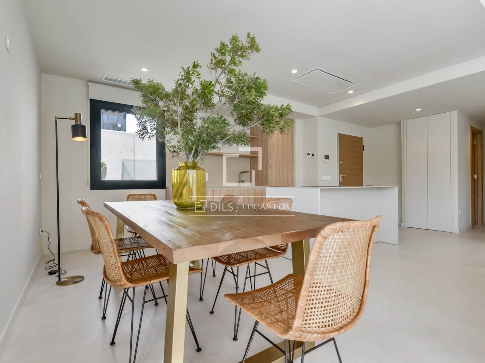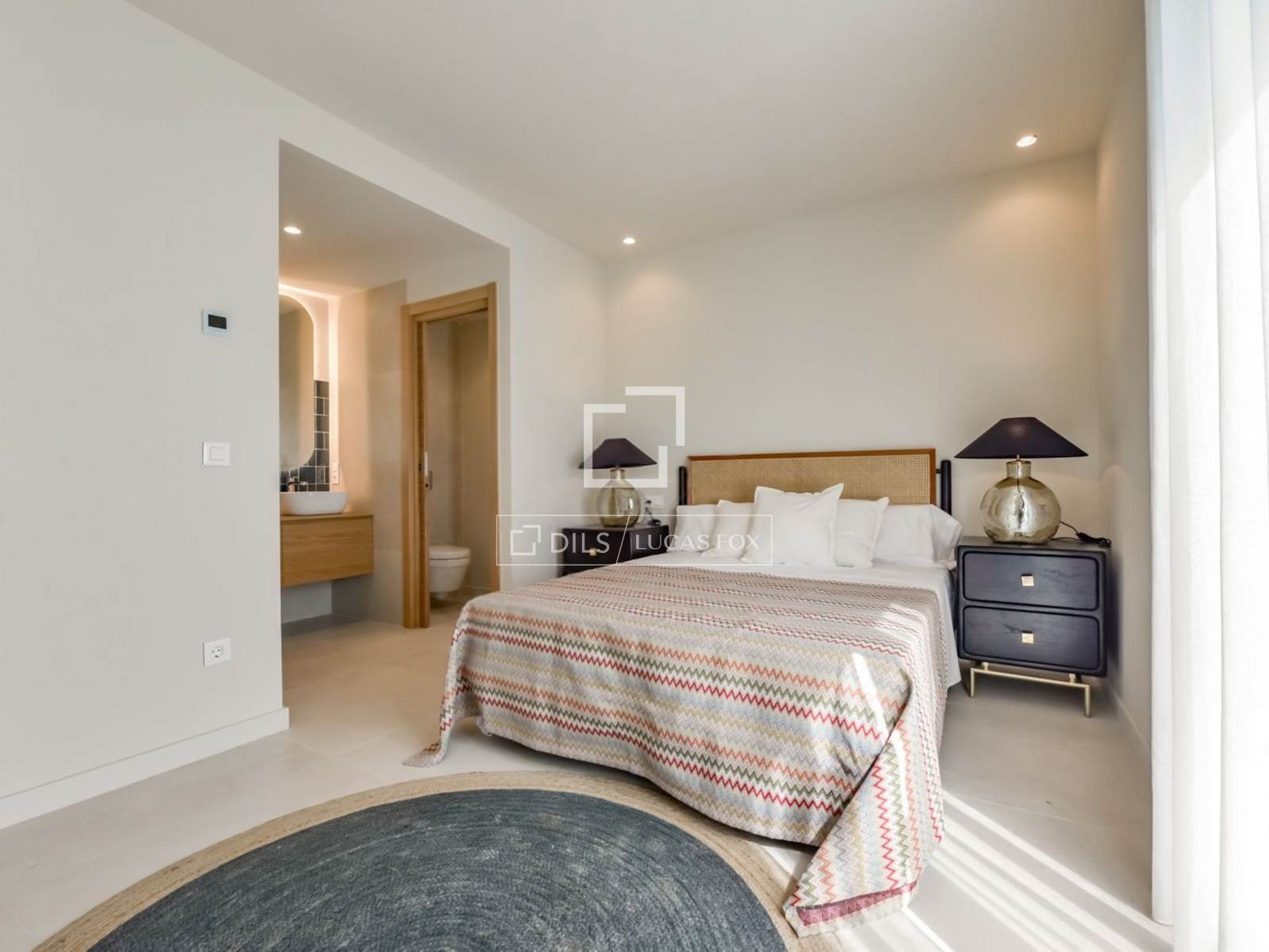 O piso térreo apresenta um elegante espaço aberto que integra harmoniosamente uma cozinha moderna com acabamentos de alta qualidade, uma sala de jantar e uma sala de estar, criando uma atmosfera acolhedora e repleta de luz natural. Este piso inclui ainda dois quartos com roupeiros embutidos e acesso direto ao jardim, uma casa de banho completa e a espaçosa suíte principal. Da sala de estar, acede-se a um terraço coberto com vista para a piscina privativa, perfeito para desfrutar do estilo de vida mediterrânico durante todo o ano.