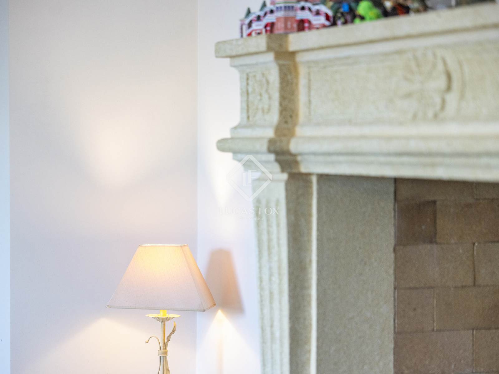 De volta à sala de estar, o ambiente oferece uma aconchegante lareira a lenha em pedra Tosca, proporcionando calor e um ambiente acolhedor nas noites mais frias. A casa também conta com aquecimento de piso em todos os cômodos.