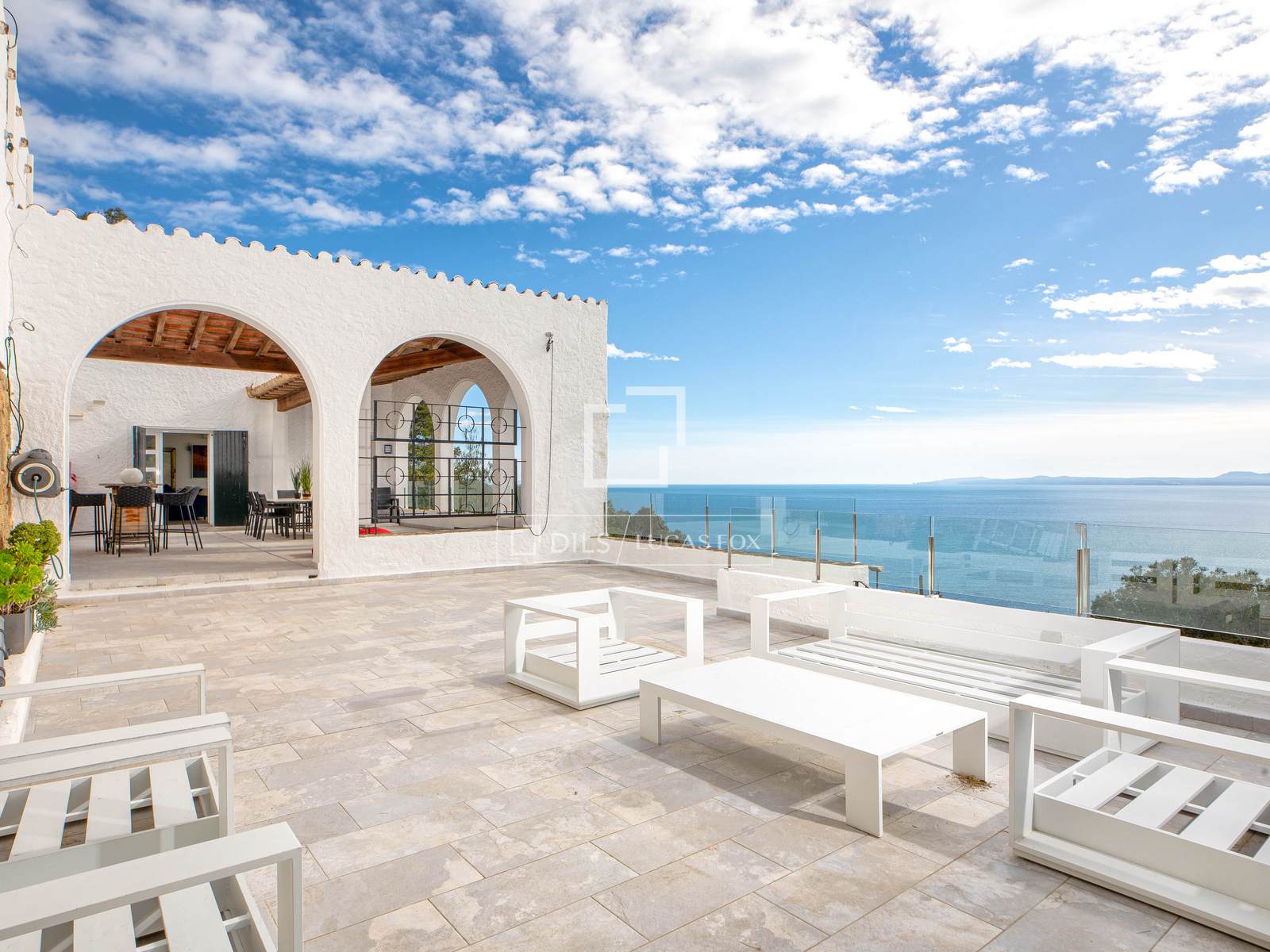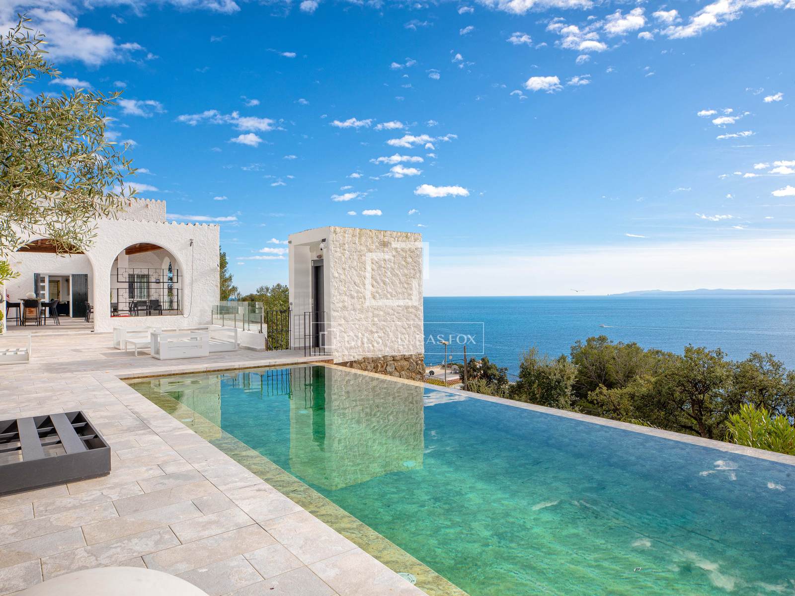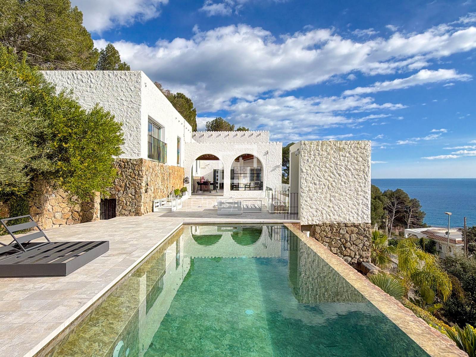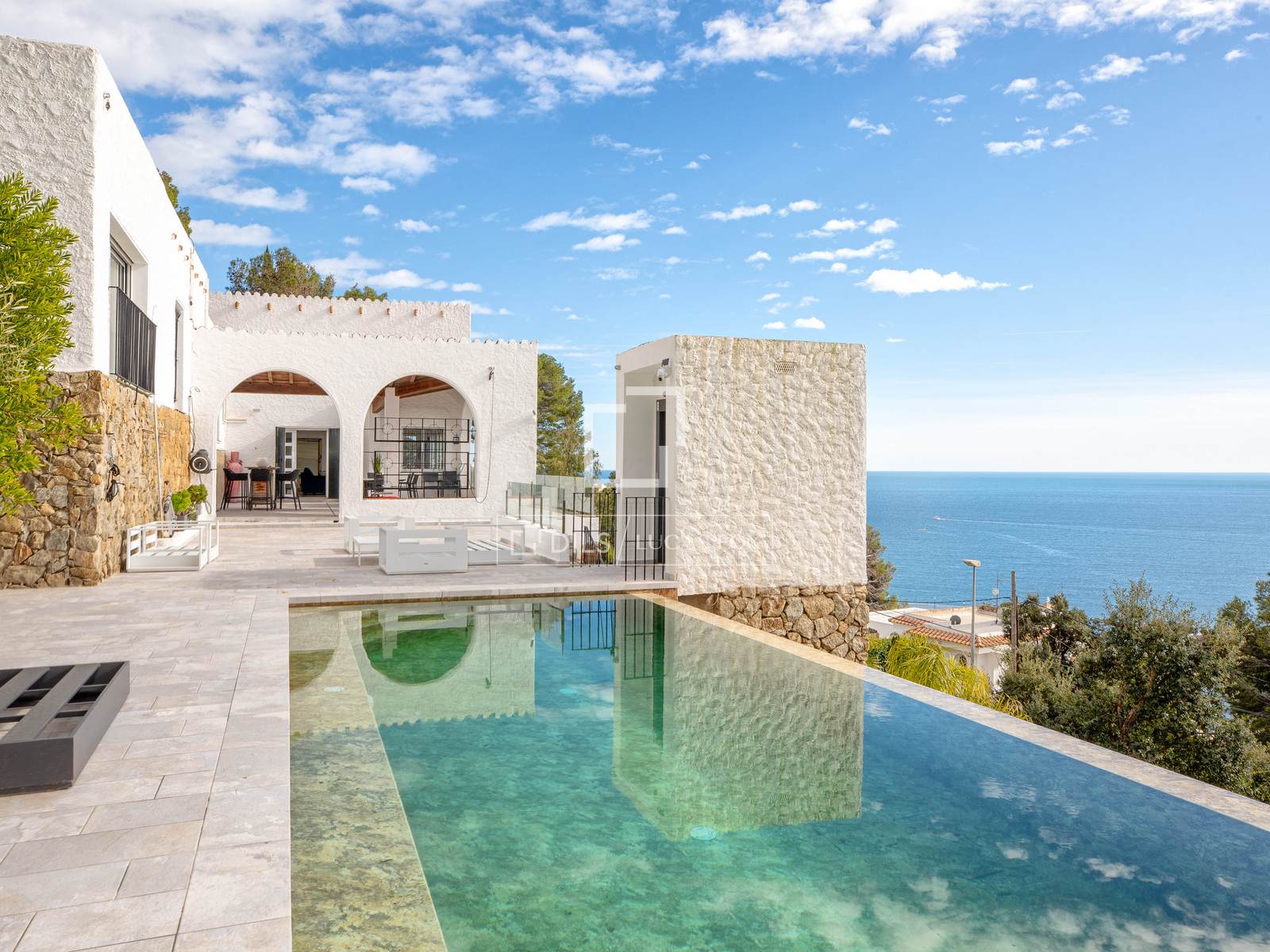 A zona exterior é espetacular, com uma piscina infinita orientada para o mar que cria uma sensação de continuidade com o horizonte. Os amplos terraços e o jardim reforçam a sensação de um verdadeiro oásis privado. A propriedade dispõe ainda de duas garagens com capacidade para até cinco viaturas, um diferencial importante na zona.