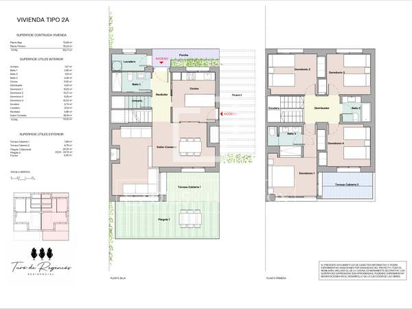 As casas geminadas, com três fachadas, oferecem 170 m² de área útil distribuídos em dois pisos. Dispõem de quatro quartos e três casas de banho, uma luminosa sala de estar/jantar com lareira e amplos terraços com pérgulas, ideais para desfrutar do ar livre. Os lotes, com áreas entre 306 e 466 m², incluem jardins privativos e piscina, além de uma piscina comum.