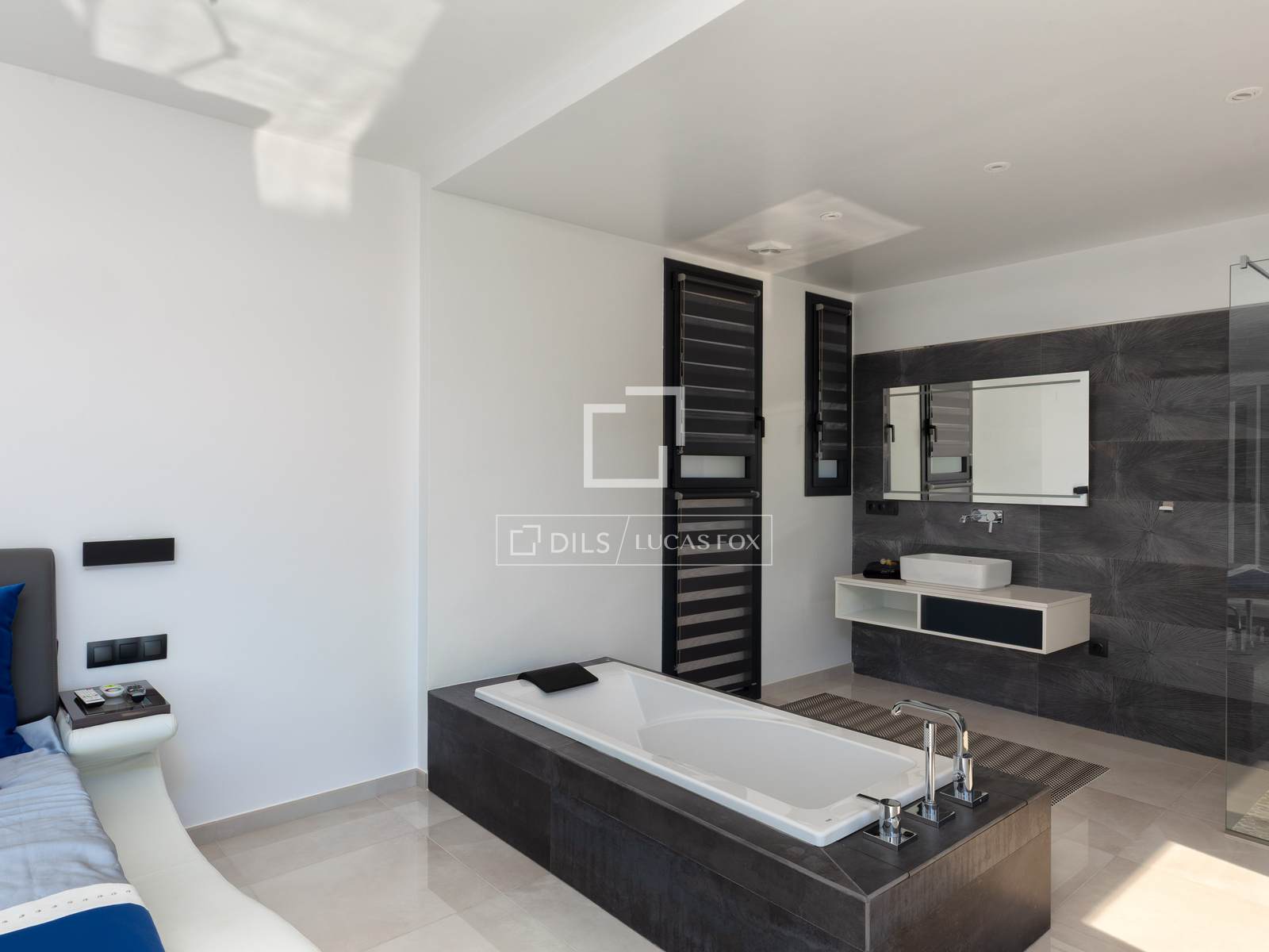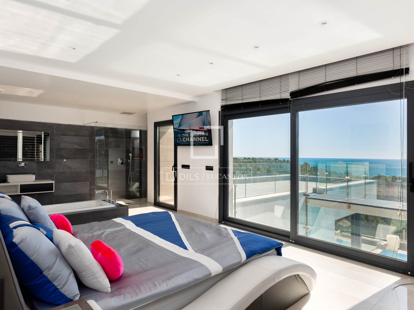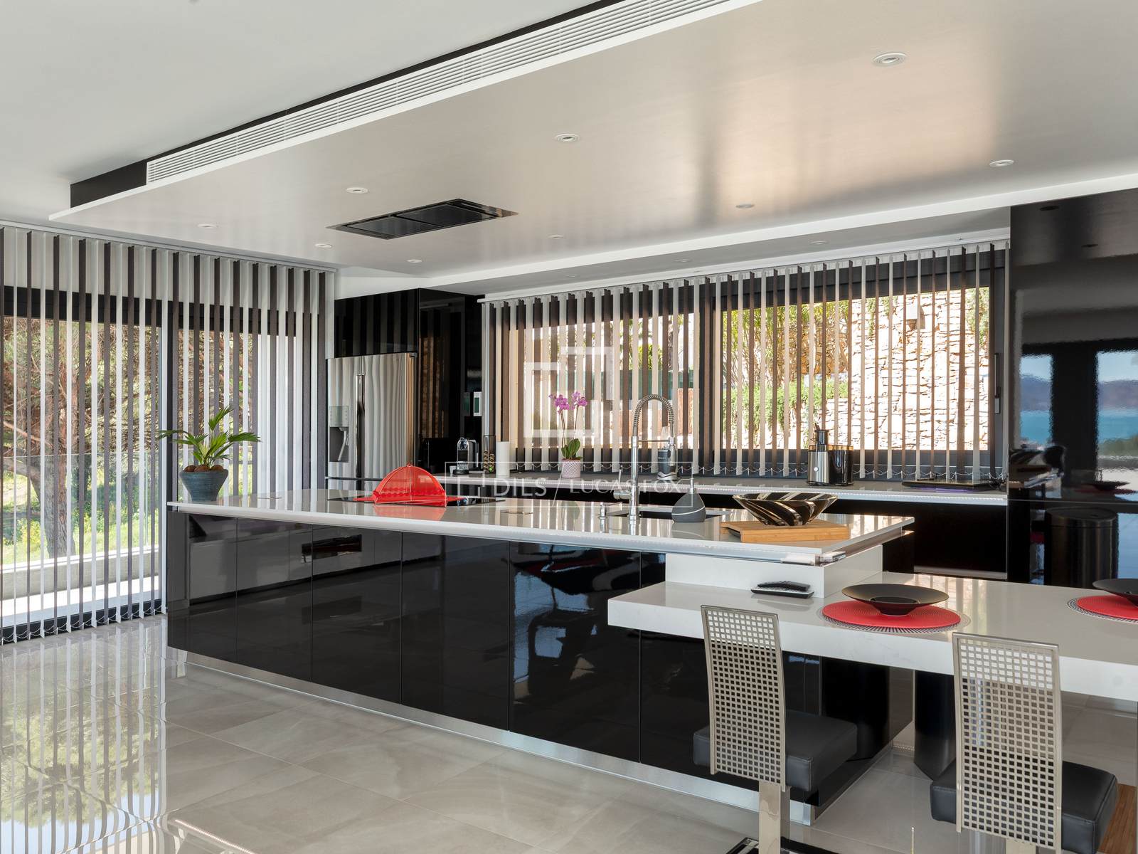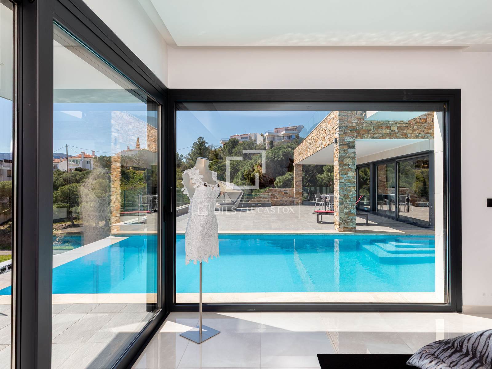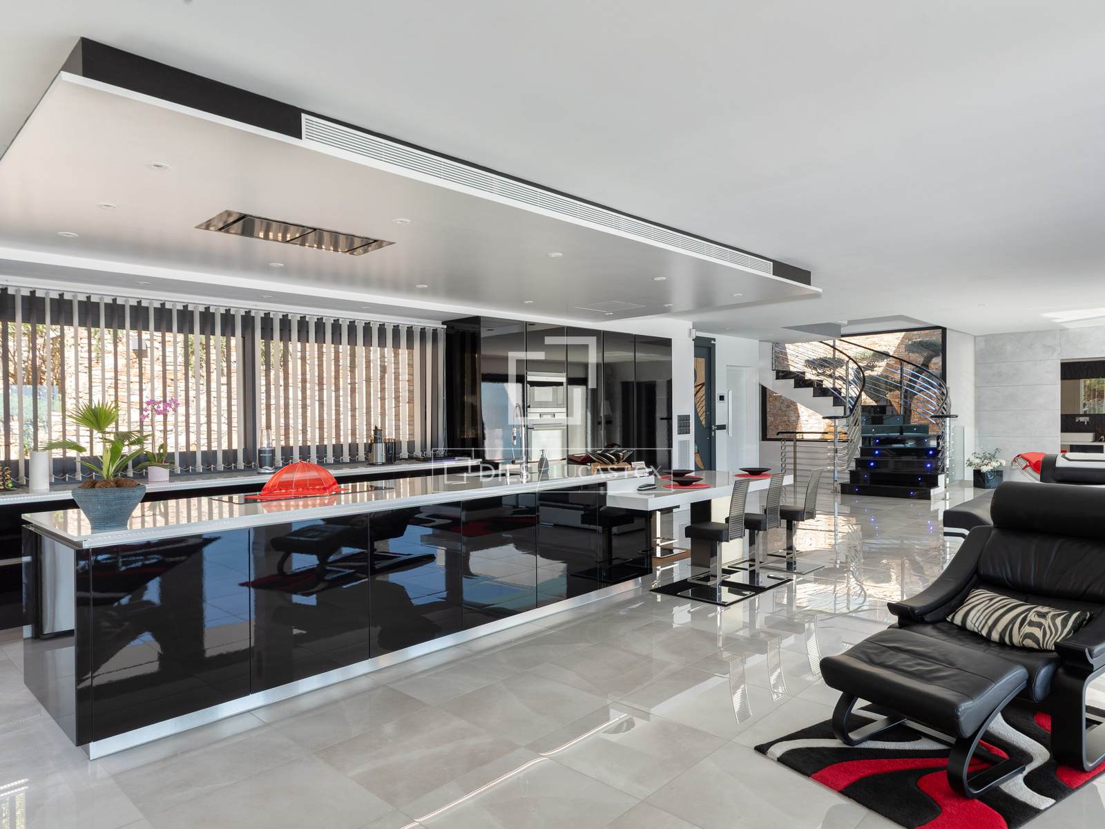 Do lado de fora, o jardim lindamente projetado desce suavemente pela encosta, complementado por amplos terraços com vista para o jardim e para o mar, criando espaços únicos para relaxamento e contemplação do Mediterrâneo. A deslumbrante piscina infinita, magistralmente integrada à arquitetura da casa, torna-se um dos elementos mais marcantes da propriedade, conferindo frescor, beleza e exclusividade.