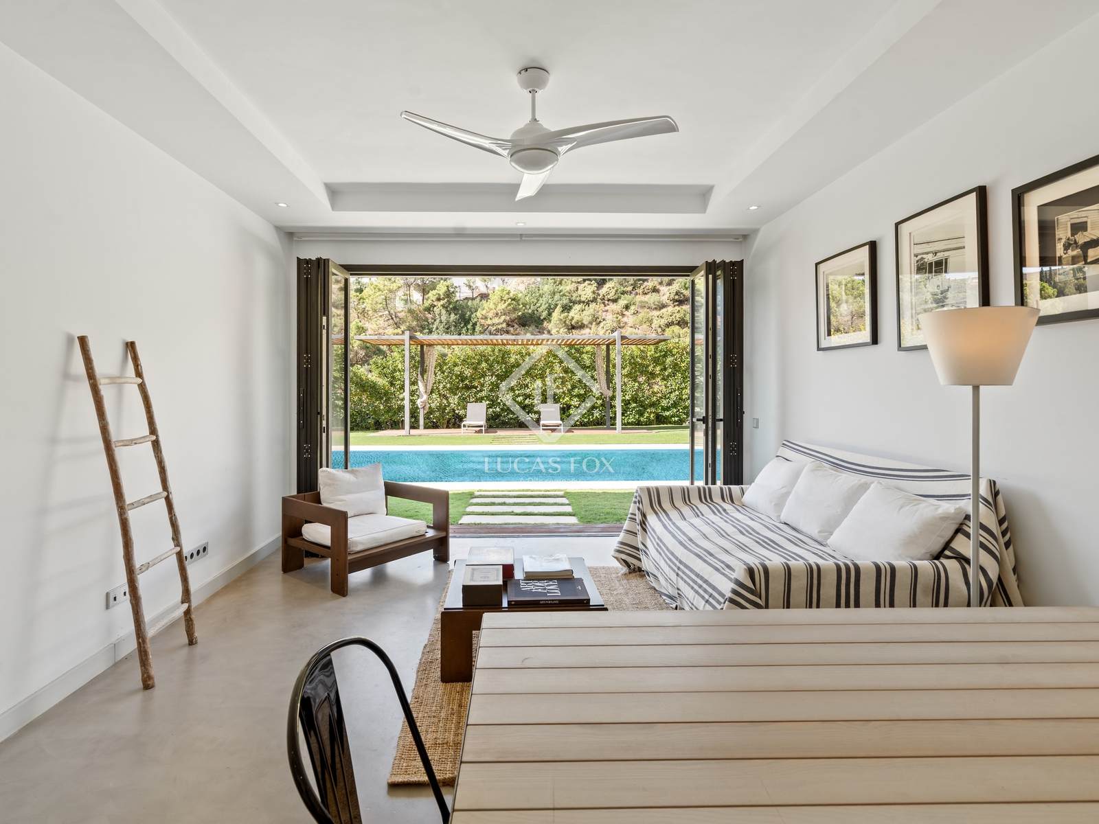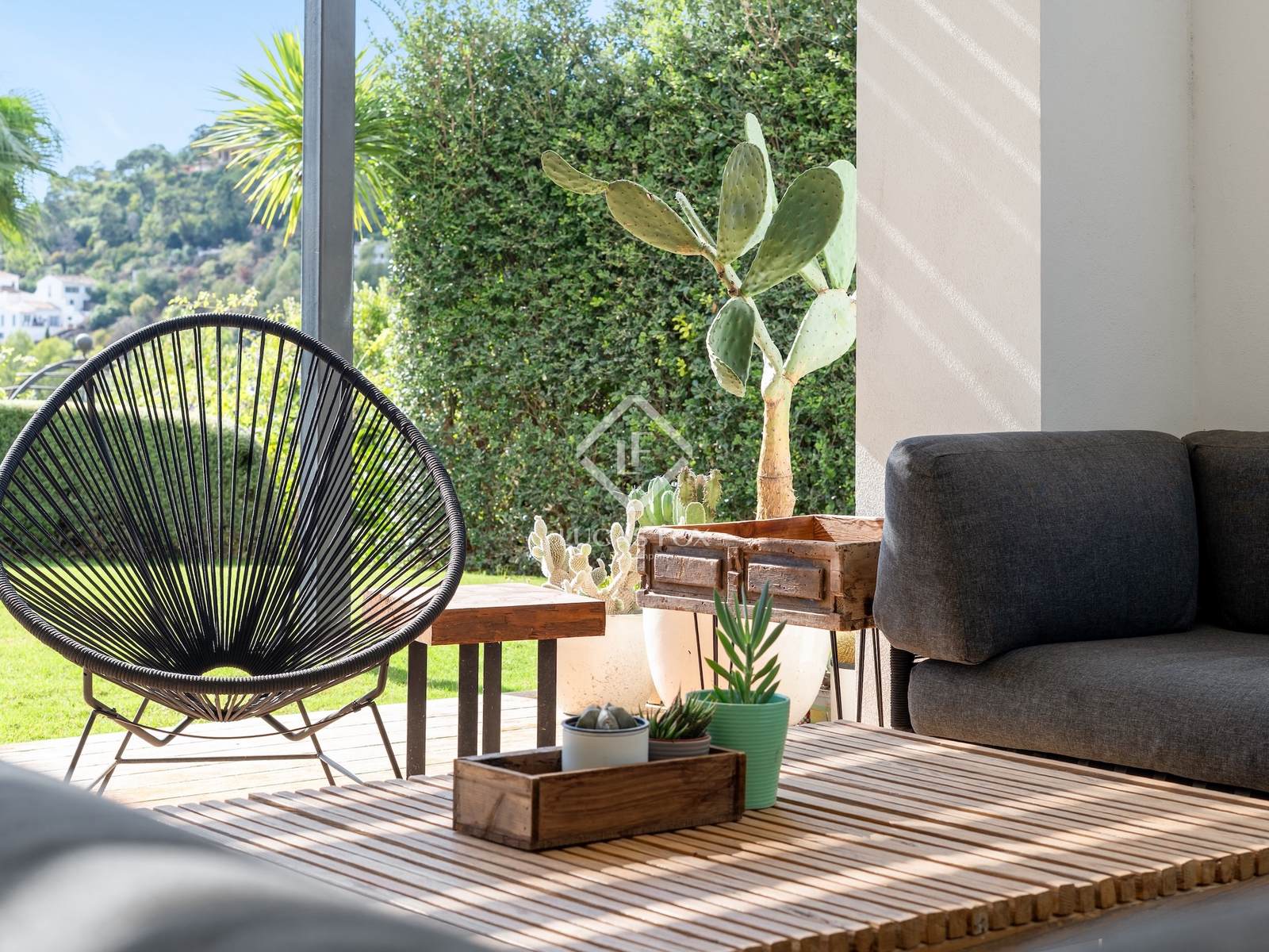 As áreas externas refletem o estilo de vida mediterrâneo em sua forma mais pura. Uma longa piscina forma o coração do jardim, rodeada por vegetação exuberante e árvores frondosas. Terraços sombreados por elegantes pérgulas de madeira convidam a refeições ao ar livre, enquanto um gazebo isolado oferece um espaço íntimo para contemplar a paisagem.