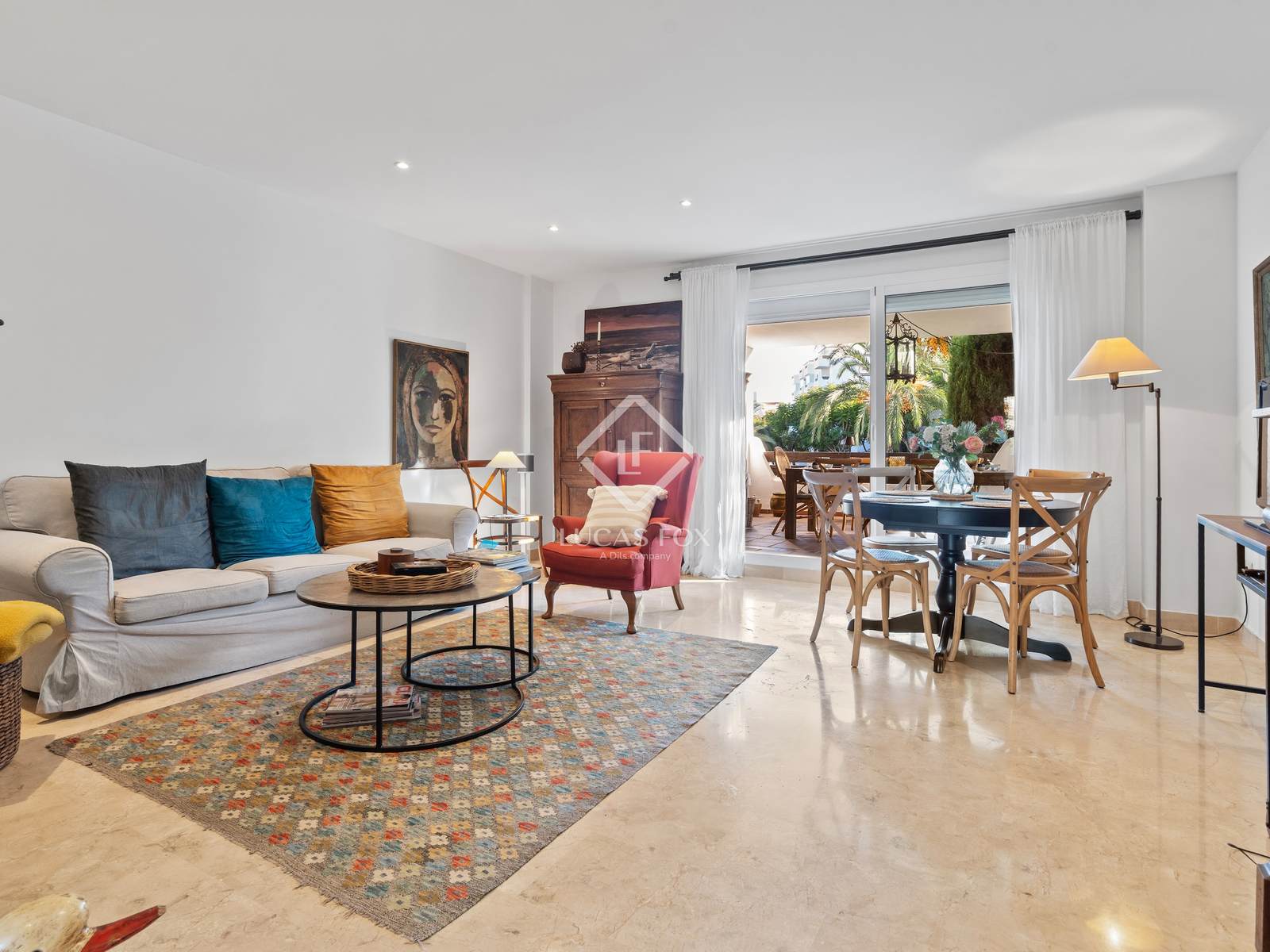 A casa possui um amplo terraço parcialmente coberto, projetado para funcionar como uma área de convivência adicional durante grande parte do ano. A partir daqui, os jardins circundantes criam uma sensação de privacidade e amplitude raramente encontrada em um térreo. No interior, a sala de estar principal é espaçosa, com grandes portas de correr que dão acesso direto ao terraço, permitindo que a luz natural ilumine o ambiente ao longo do dia.