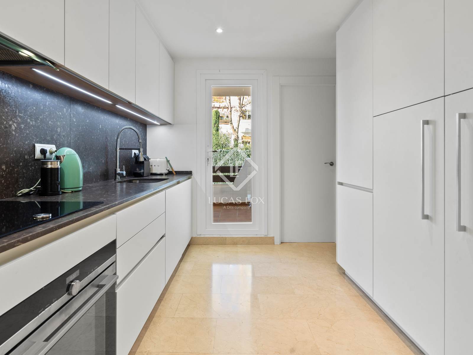 Cozinha reformada com acesso ao exterior.
