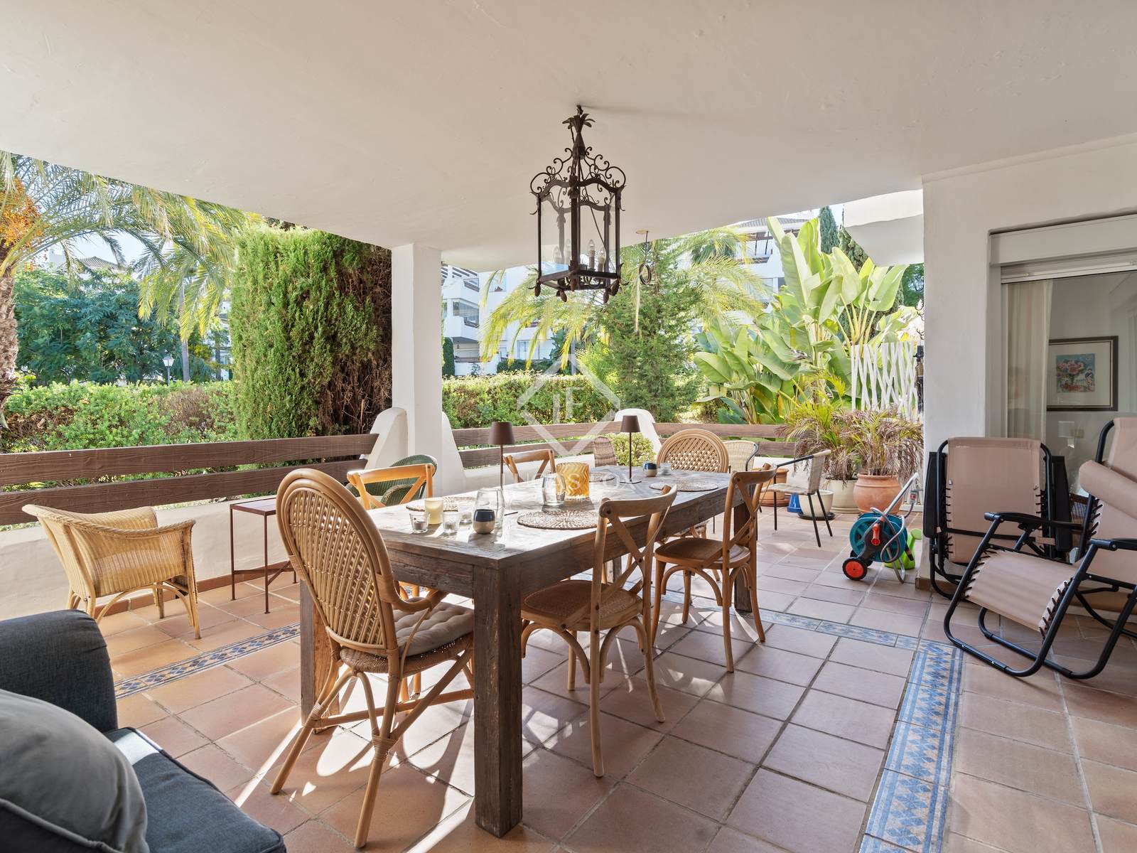 Amplo terraço com acesso aos jardins.