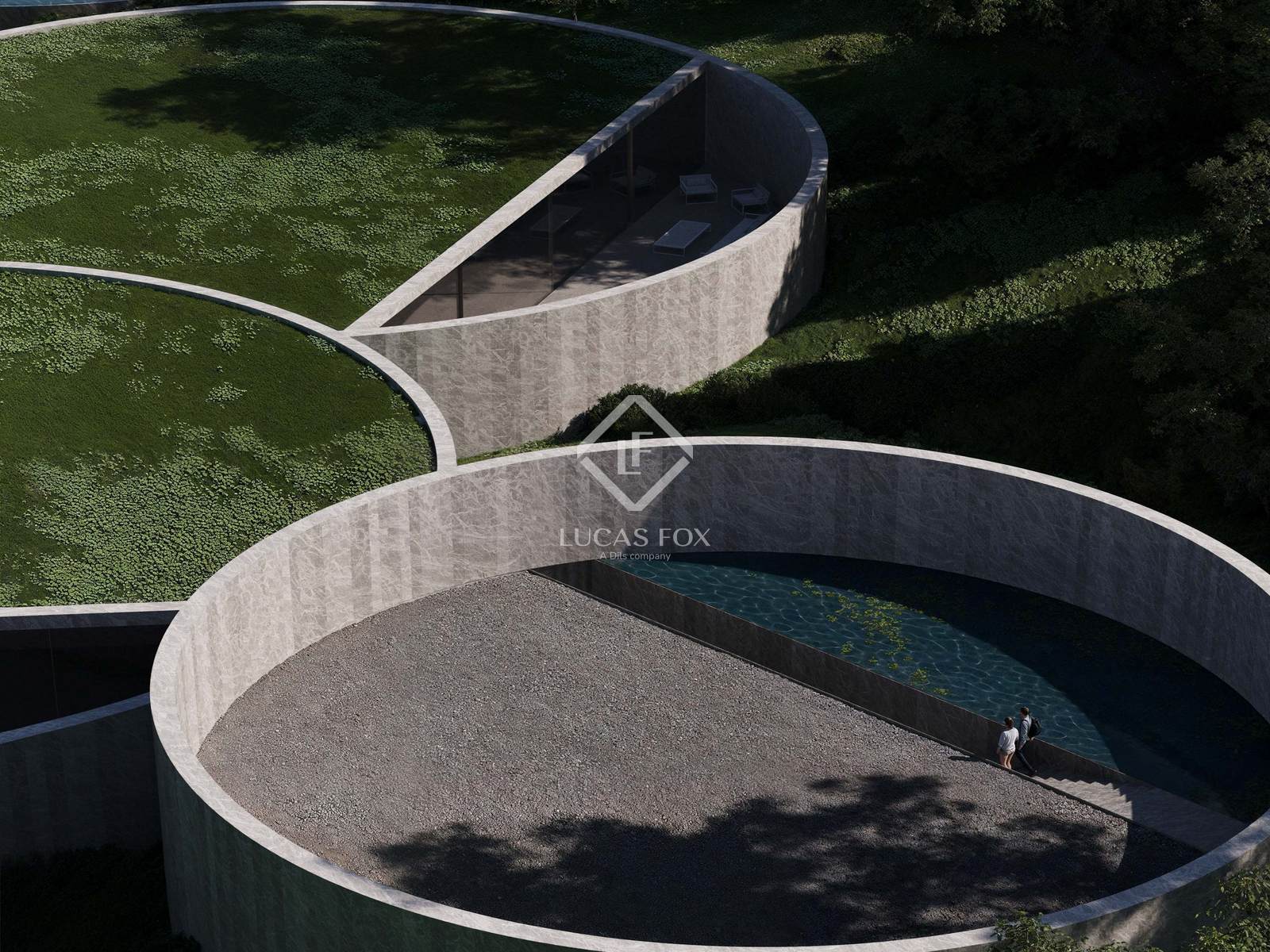 A Villa Noon apresenta um layout inovador de volumes circulares interligados, cuidadosamente esculpidos na encosta para minimizar o impacto visual e ambiental. Revestida em pedra da Serra Elvira, a vila se integra sutilmente ao entorno, como se emergisse da própria terra. Cada módulo circular é cuidadosamente orientado: os pátios traseiros protegem dos ventos predominantes, enquanto os terraços frontais captam a luz solar, criando um diálogo fluido entre a forma construída e a paisagem natural.