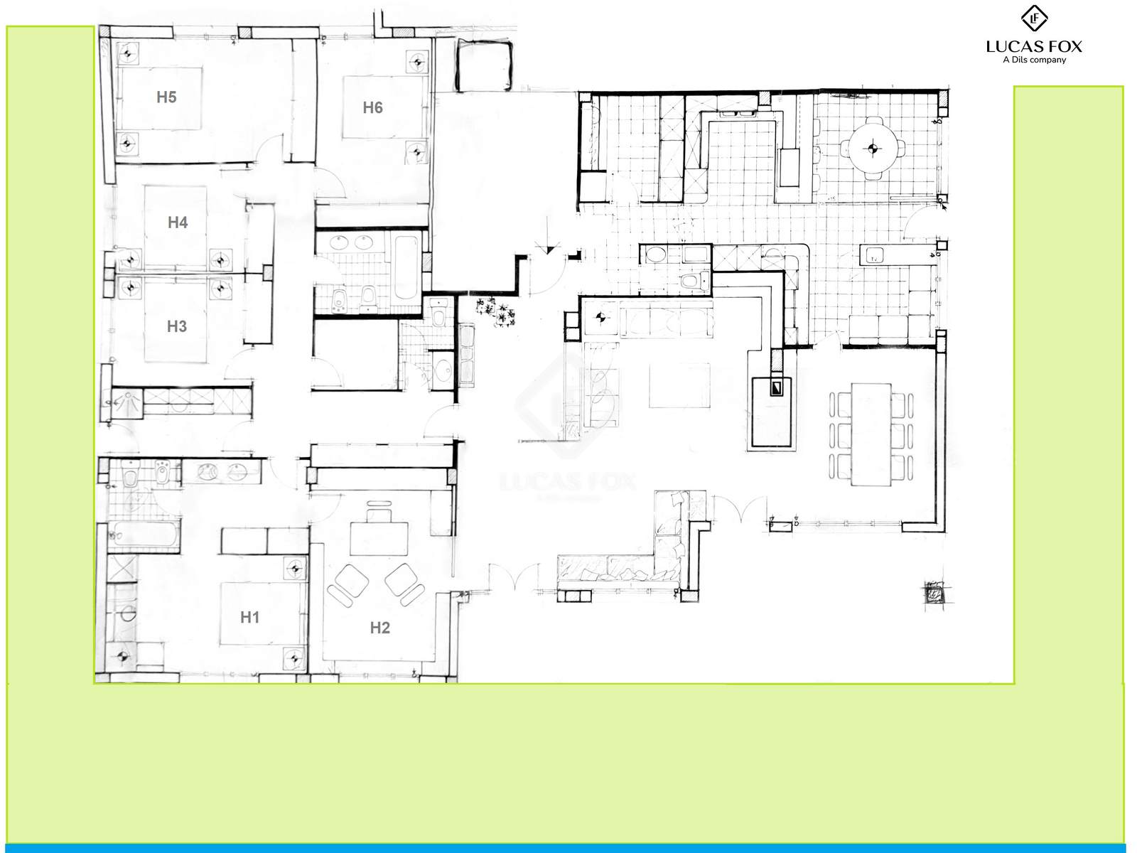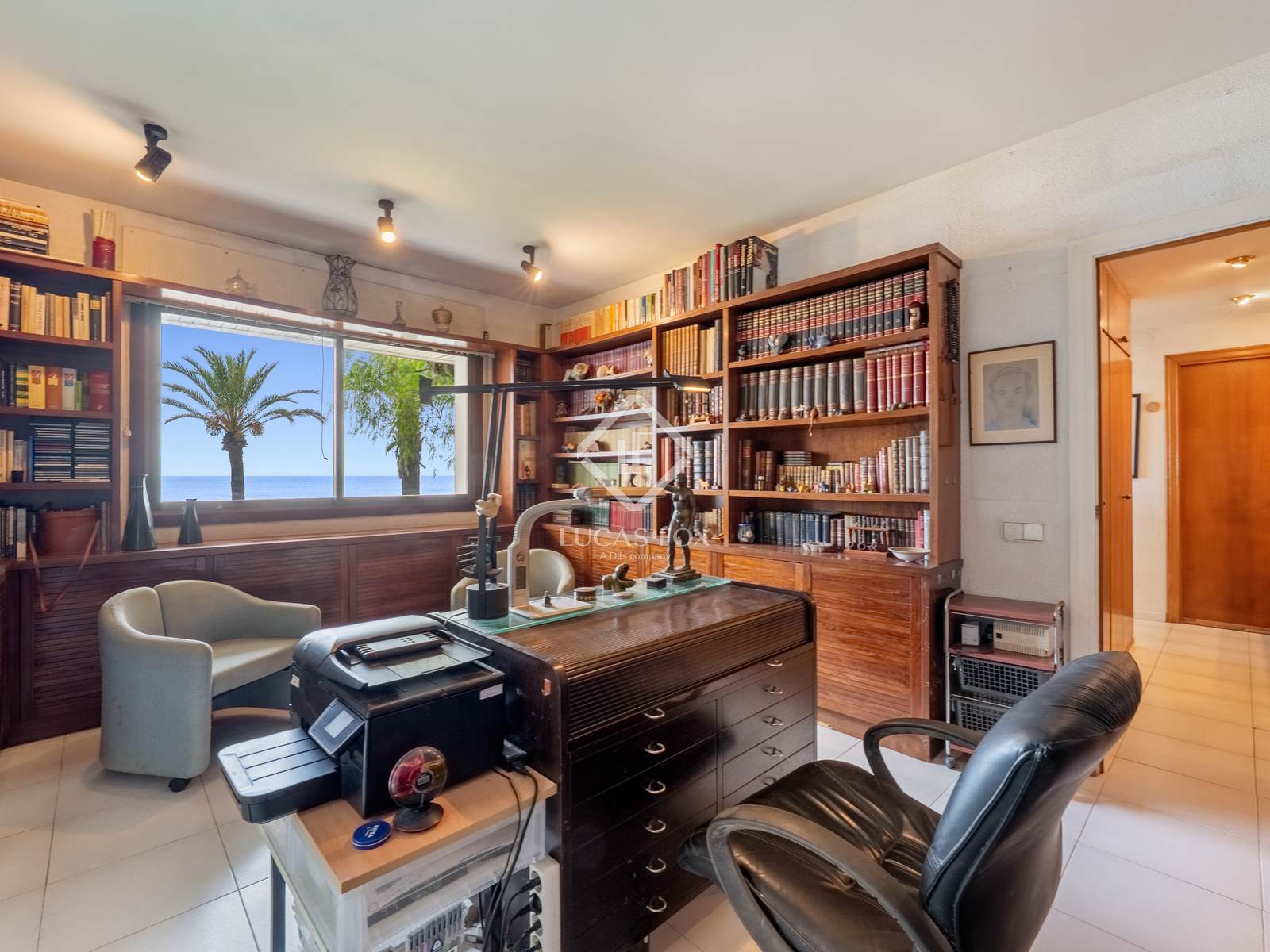 Ao entrar na casa, um elegante hall de entrada conecta as três áreas principais: a cozinha, a sala de estar e o quarto. Ela conta com cinco quartos de casal com guarda-roupas embutidos. O quarto principal tem banheiro privativo. Há também um escritório com vista para o mar, ideal como escritório ou área de teletrabalho. A área de estar conta com uma ampla sala de estar com lareira, perfeita como espaço central, e uma sala de jantar separada, projetada para grandes reuniões e comemorações. A cozinha, também muito espaçosa, é totalmente equipada e inclui uma área de jantar, uma lavanderia ou despensa e uma oficina prática para atividades pessoais, todas separadas.