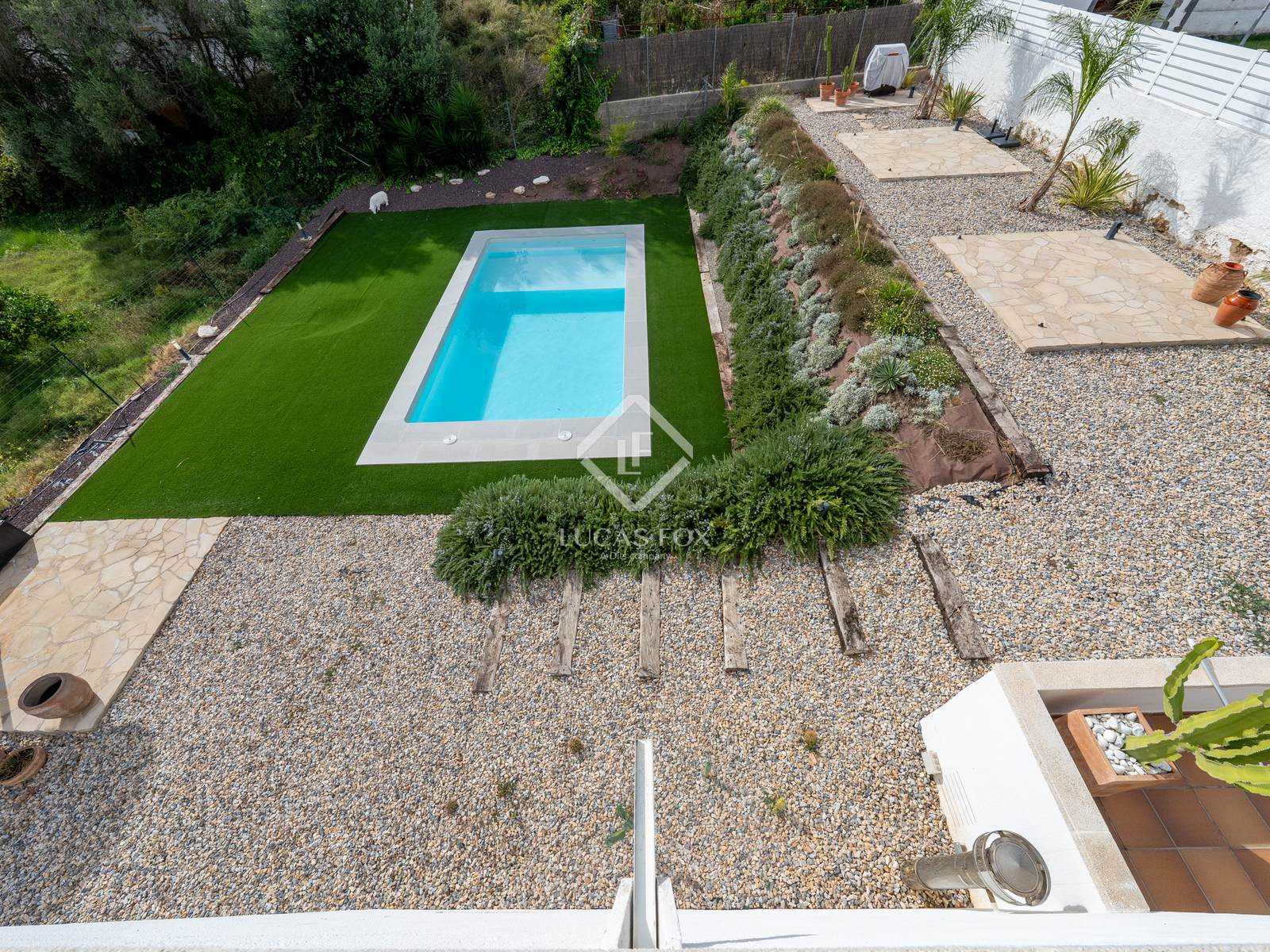 O exterior é um verdadeiro oásis privado, com um jardim de baixa manutenção que circunda a piscina moderna e oferece vistas deslumbrantes para o mar. Um lugar perfeito para relaxar, apanhar sol e conectar-se com a natureza.