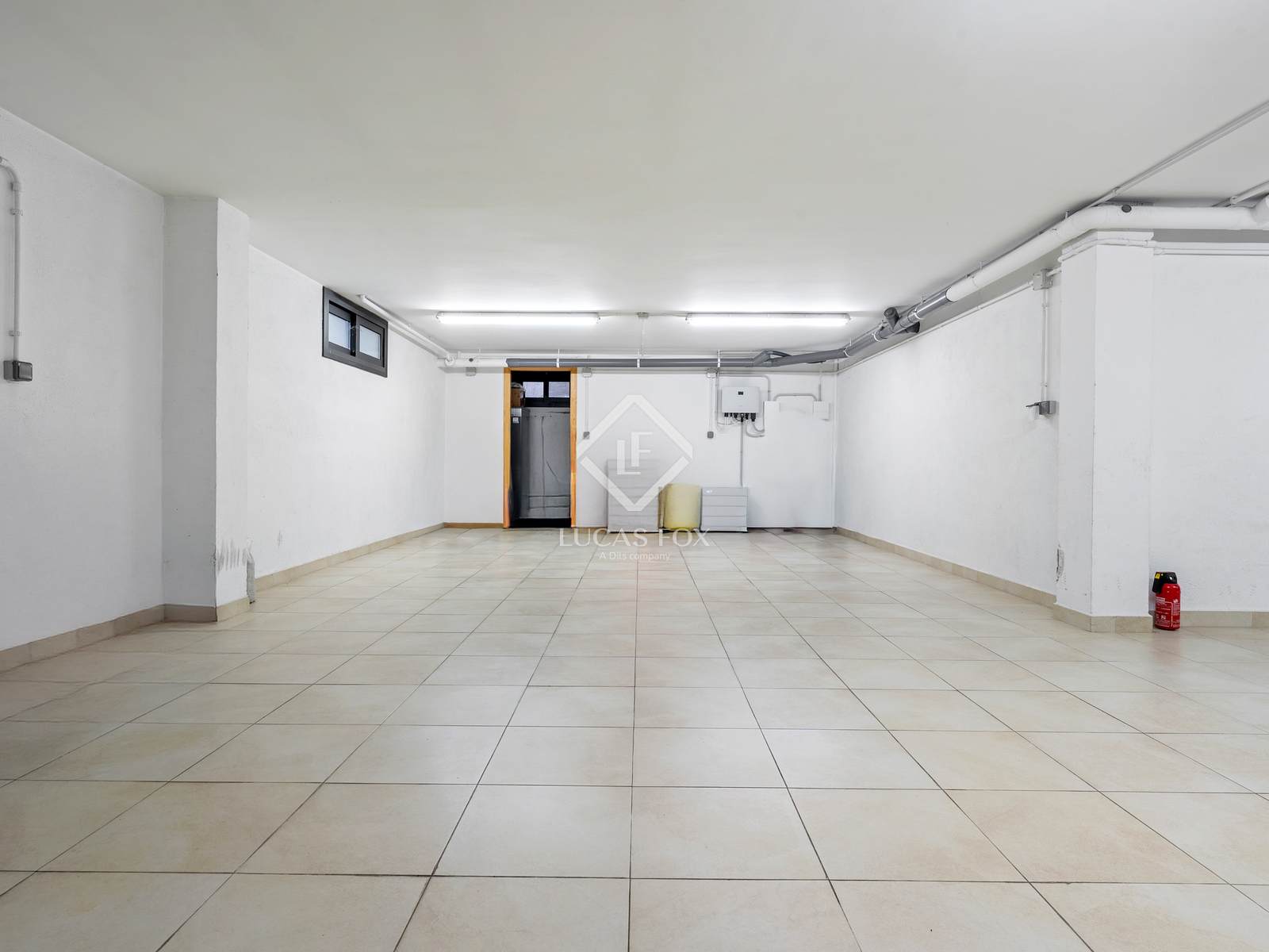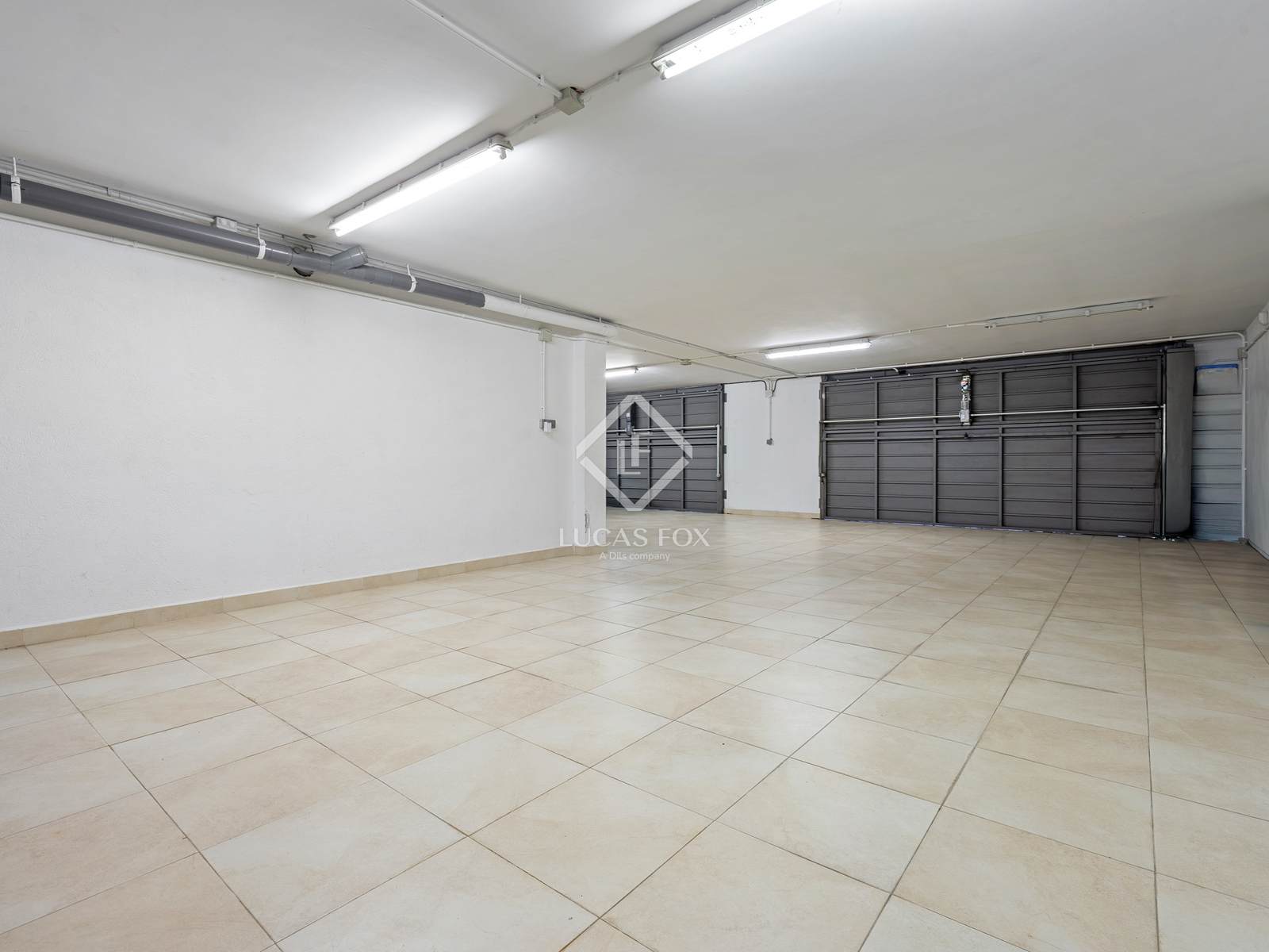 Garagem fechada com capacidade para até quatro carros e espaço adicional para armazenamento.