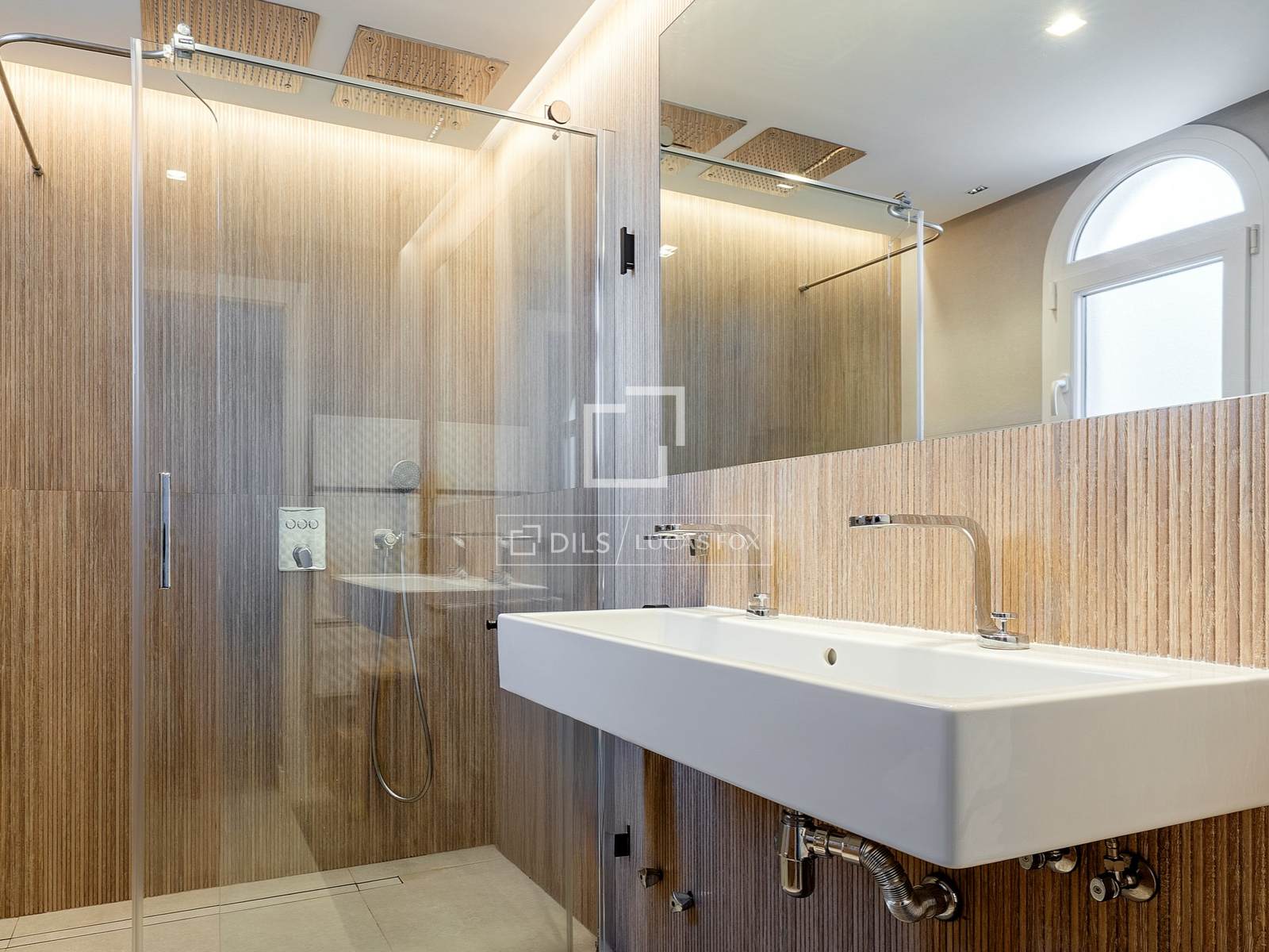 Um Refúgio Privado: Descanso e Materiais de Qualidade. O andar superior é um santuário de tranquilidade. Através de um corredor banhado por luz natural, você acessa quatro quartos de casal, todos com vista para o exterior e de tamanho generoso, permitindo diversas configurações de mobiliário. O banheiro neste andar é uma ode ao bem-estar, com um box amplo e ducha higiênica embutida no teto, criando uma experiência de spa diária.