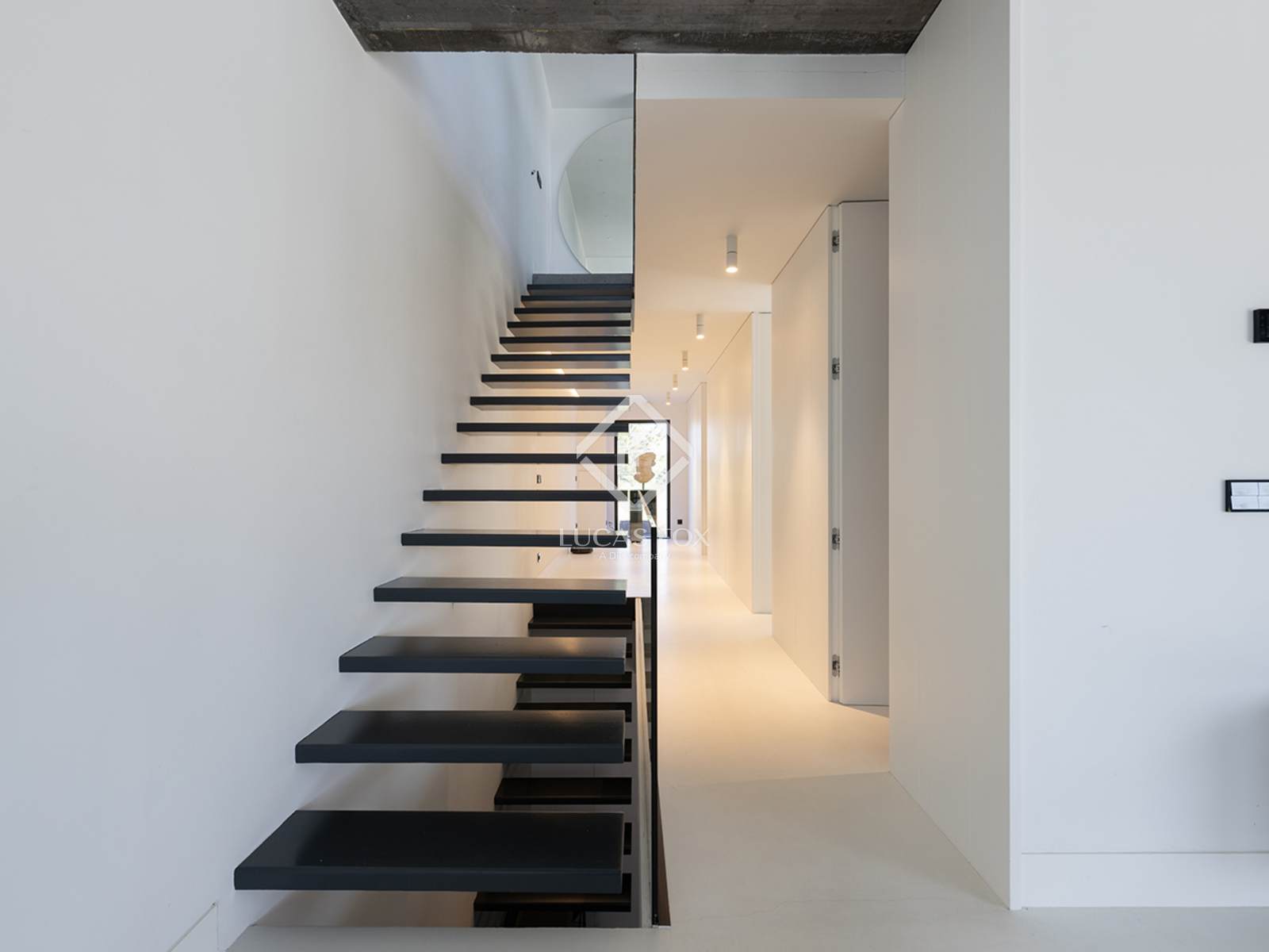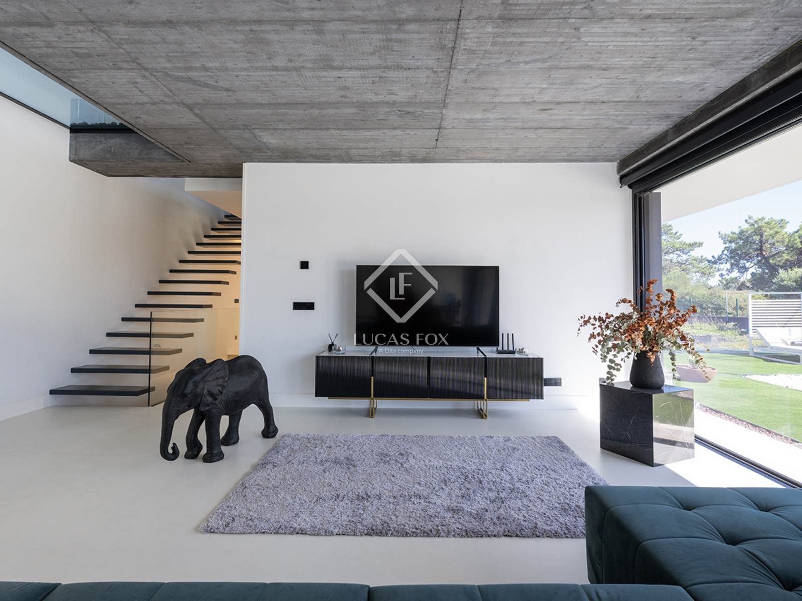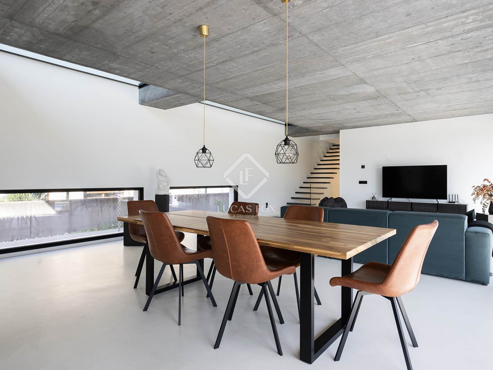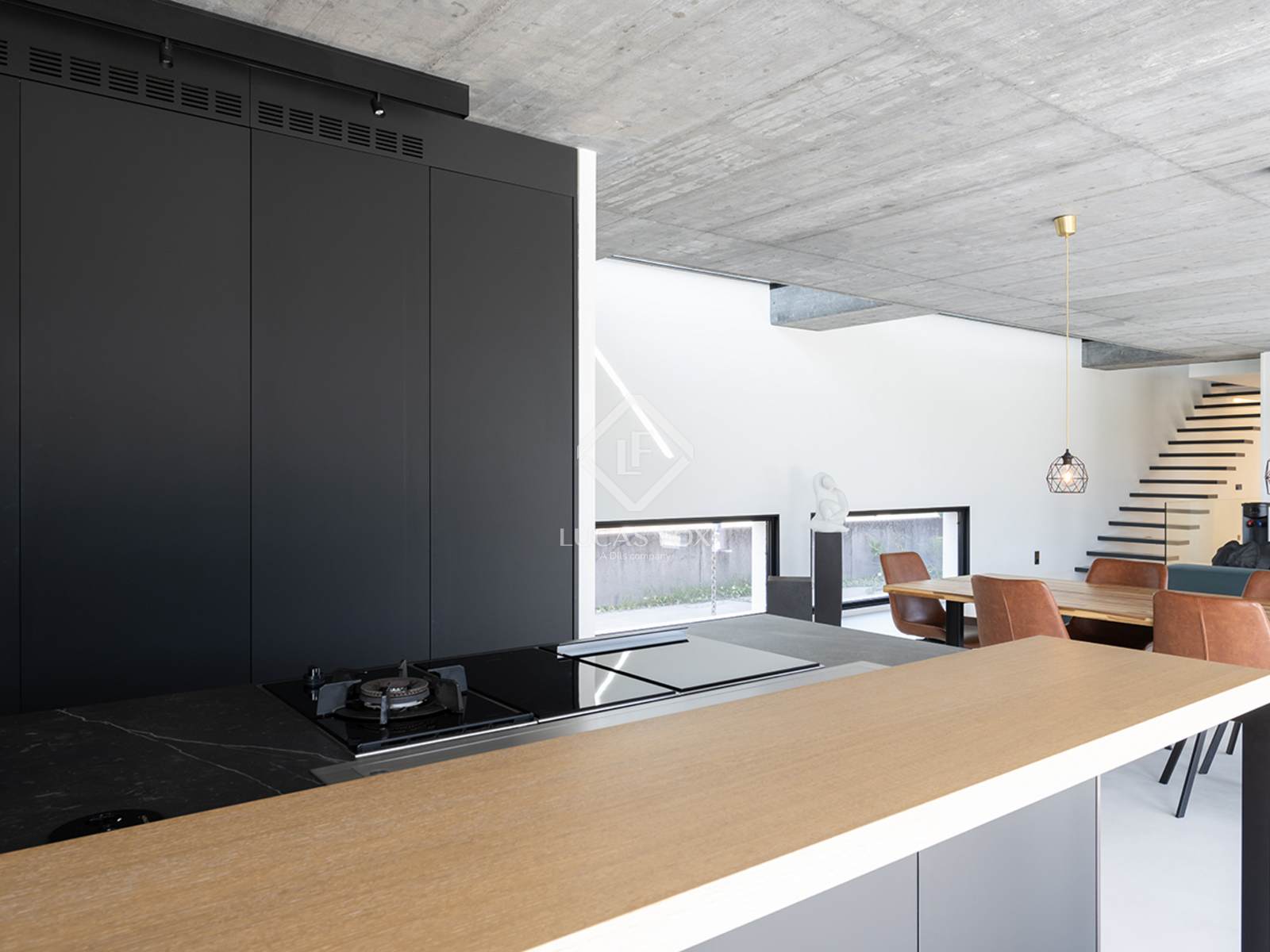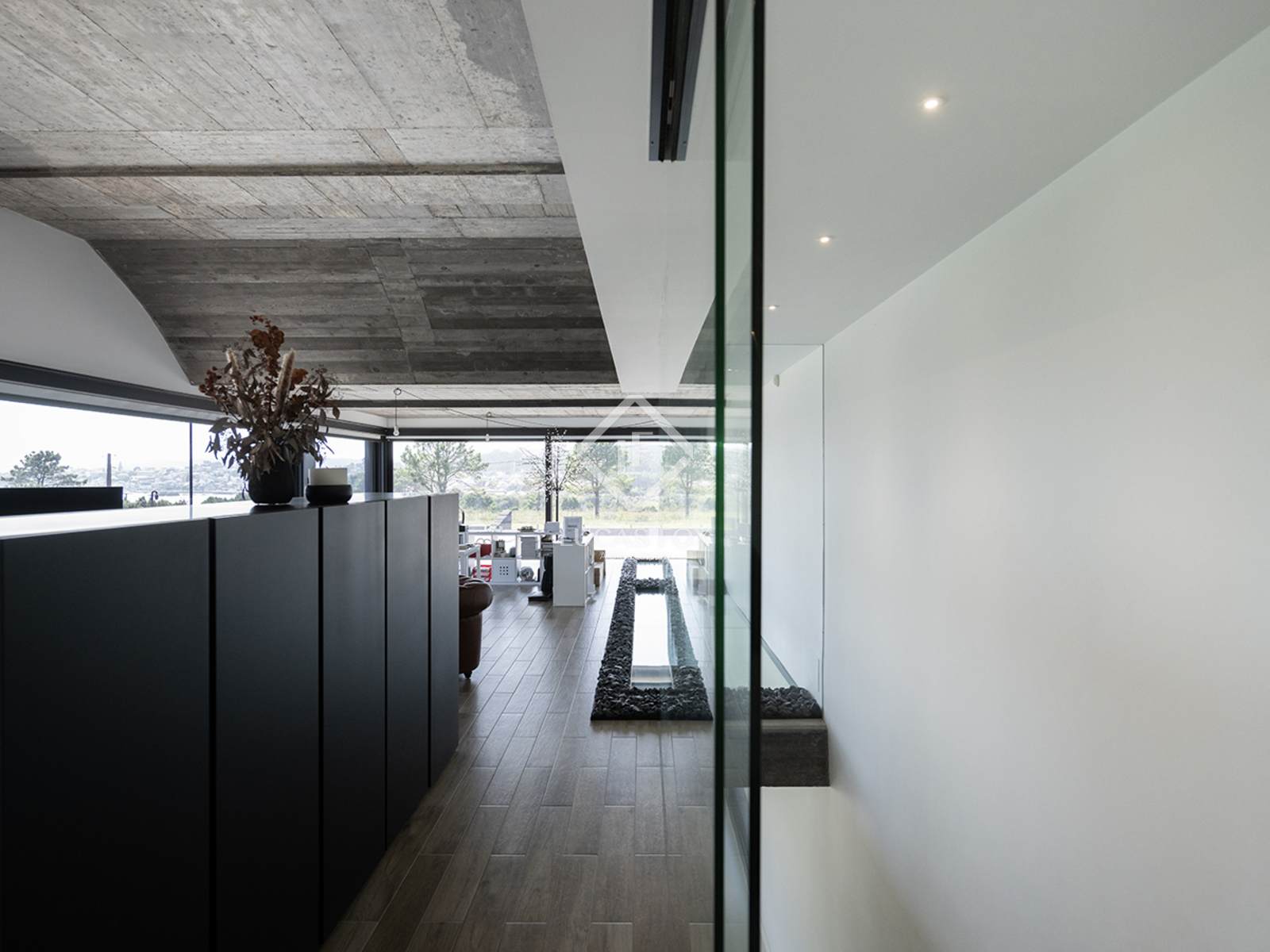 No térreo, encontramos uma ampla área aberta, com muita luz natural proporcionada pela fachada envidraçada, voltada para o sul, dando à casa a orientação perfeita para aproveitar o sol o dia todo no terraço externo à área de estar e, claro, à piscina. A cozinha e a sala de estar são integradas, com concreto aparente e um toque industrial, além de instalações de alta qualidade. A sala de estar tem vista para o jardim e a área da piscina, com o lado sul da casa sendo quase inteiramente envidraçado.