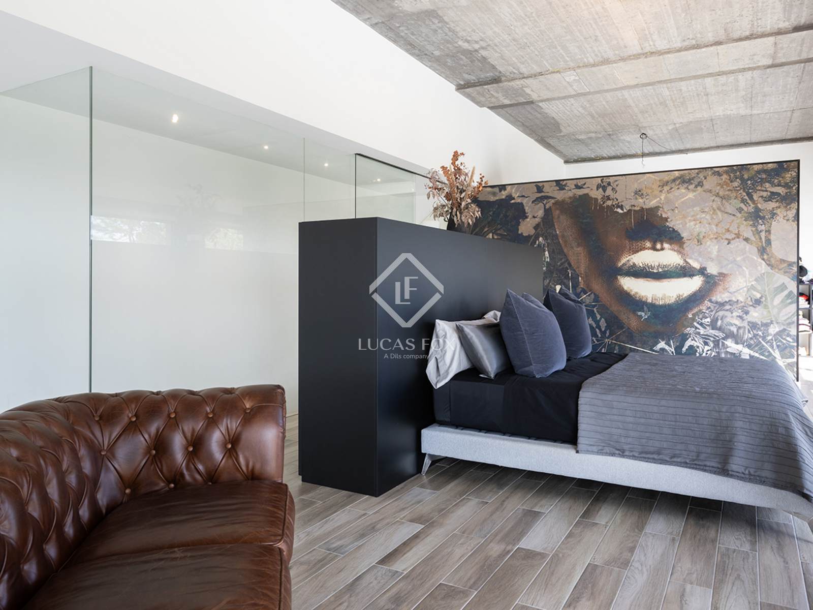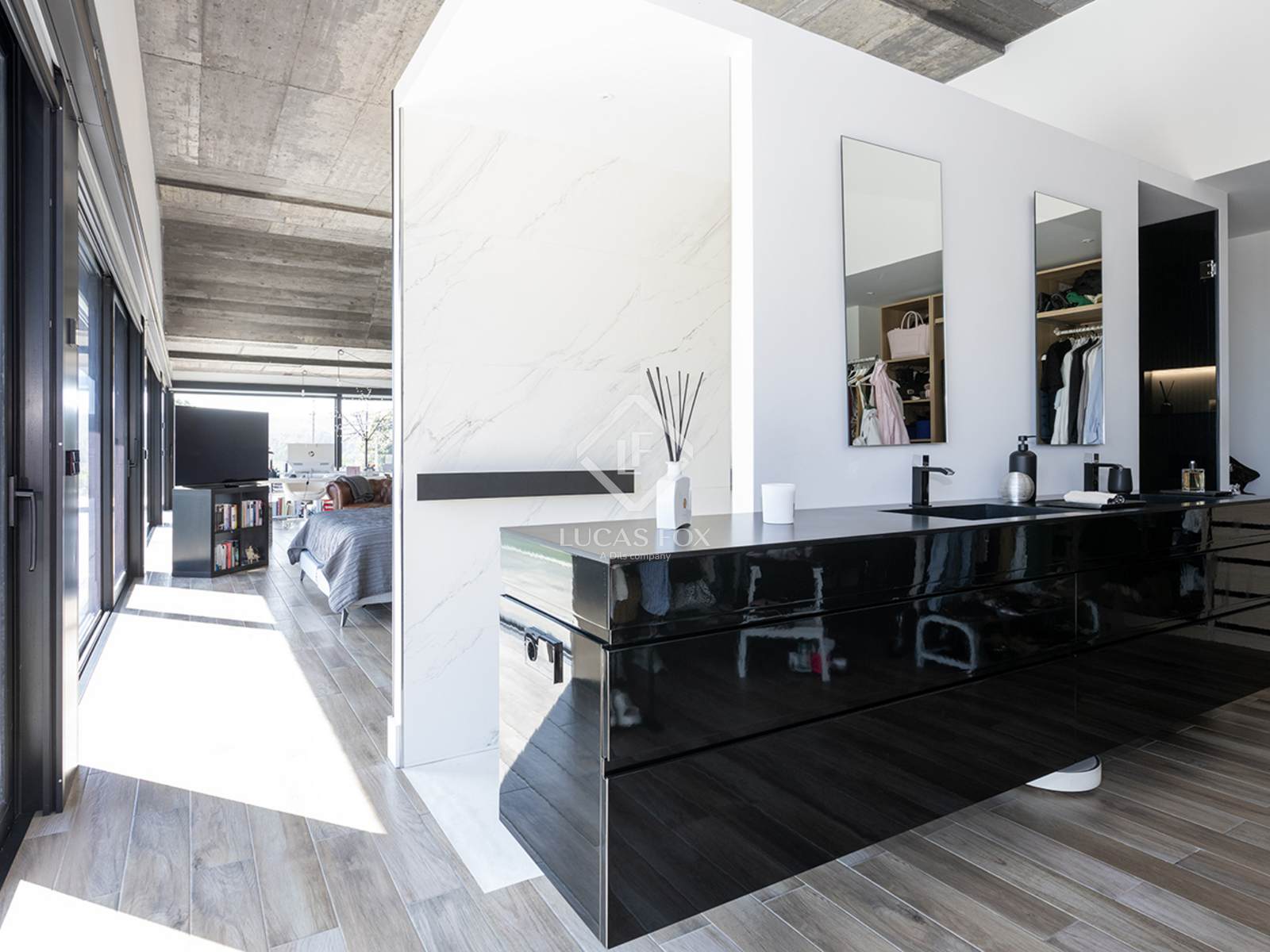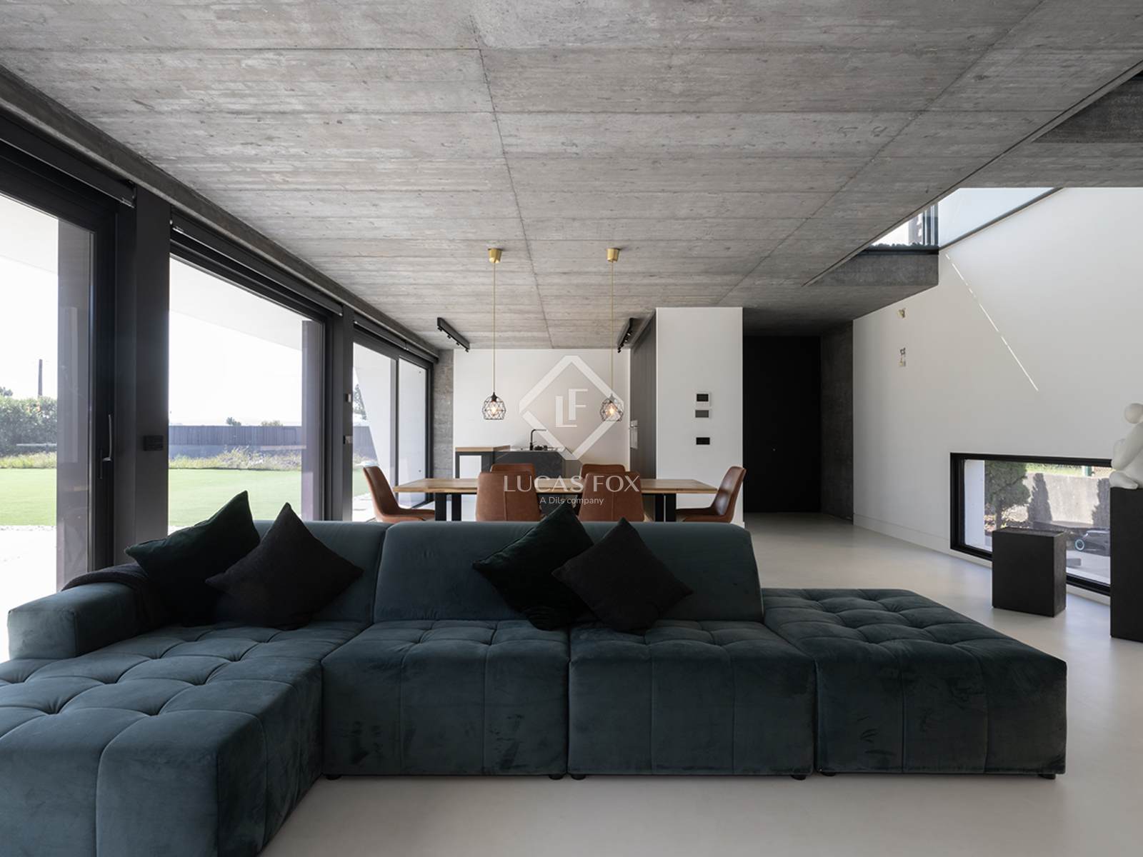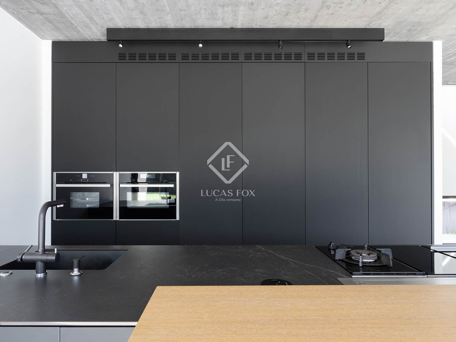 No térreo, encontramos uma ampla área aberta, com muita luz natural proporcionada pela fachada envidraçada, voltada para o sul, dando à casa a orientação perfeita para aproveitar o sol o dia todo no terraço externo à área de estar e, claro, à piscina. A cozinha e a sala de estar são integradas, com concreto aparente e um toque industrial, além de instalações de alta qualidade. A sala de estar tem vista para o jardim e a área da piscina, com o lado sul da casa sendo quase inteiramente envidraçado.