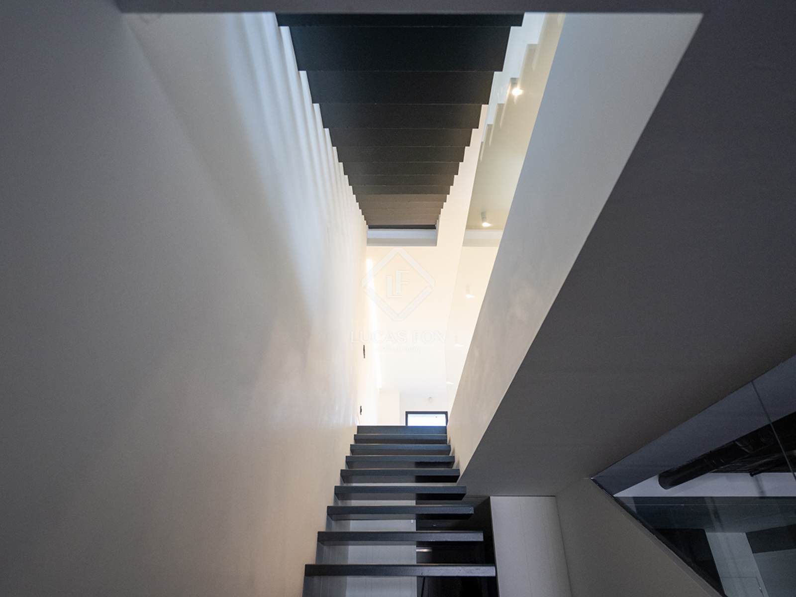 Uma escada aberta leva ao primeiro andar, onde os atuais proprietários têm uma ampla área aberta, com a suíte principal, incluindo quarto, banheiro e closet, além de academia e sala de estar, com acesso ao terraço que percorre toda a extensão da casa, com vista para o mar, piscina e jardim. Um novo proprietário pode querer dividir essa área para criar cômodos ou salas de estar extras, mas para quem busca um estilo de vida moderno, o layout aberto oferece praticidade e qualidade de vida.