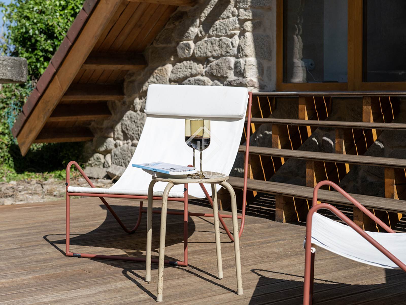 Deste nível, podemos aceder às áreas exteriores através de um deck de madeira para desfrutar do ar puro do campo. No jardim, encontramos áreas relvadas em redor de uma piscina de água salgada, que aproveita a vista para o mar, e um celeiro que foi preservado e convertido numa área de relaxamento com vistas, perfeita para leitura ou mesmo como área de recreio para as crianças.