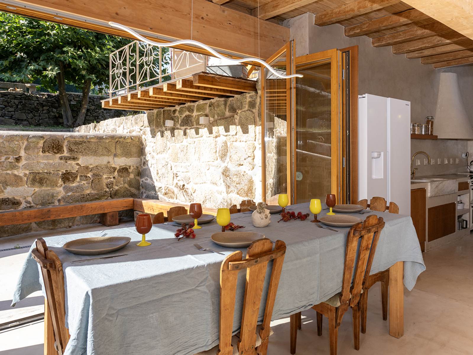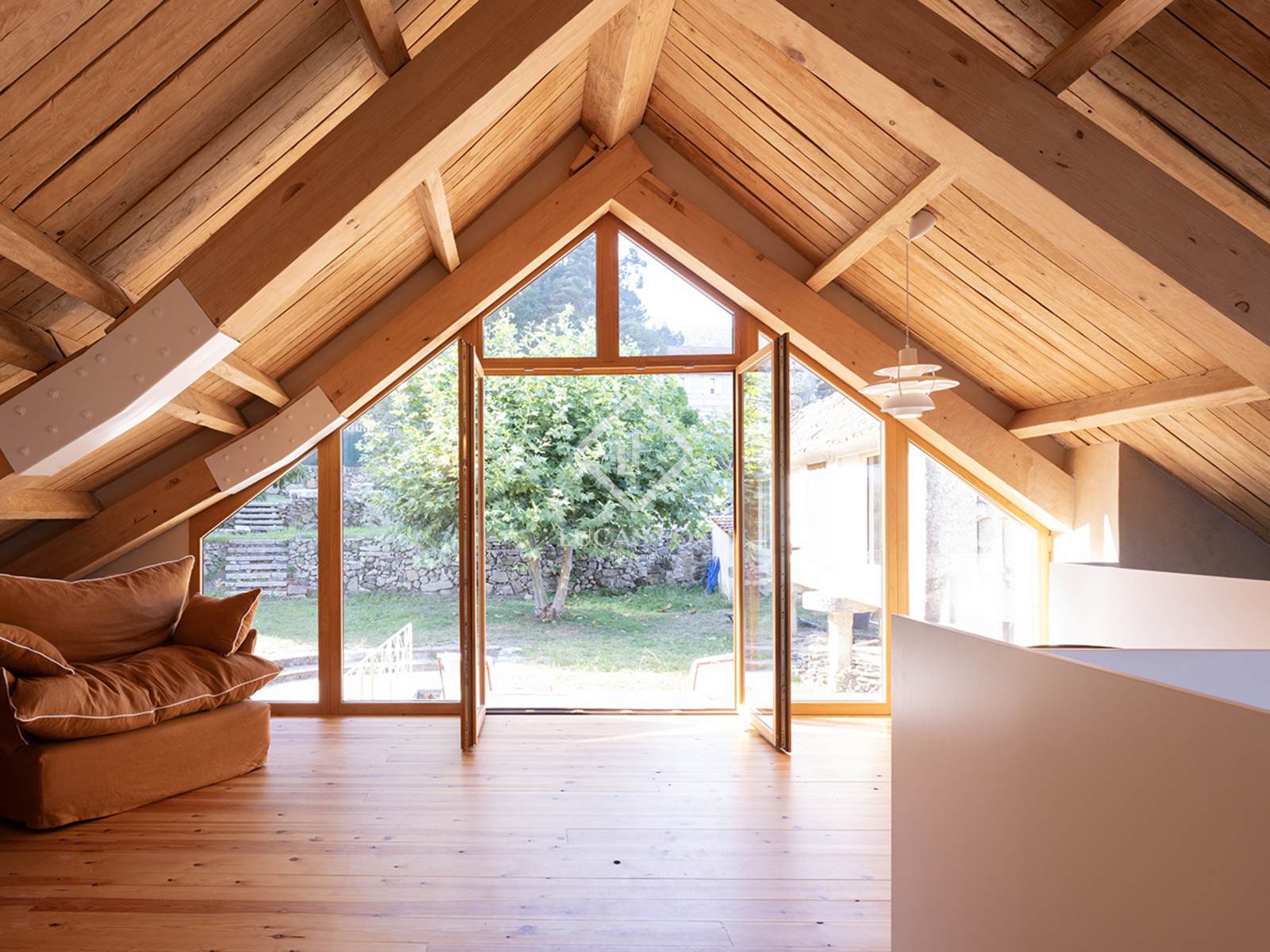 Ao entrar pela porta principal no térreo, nos deparamos com uma sala de jantar aberta que leva à cozinha, que combina um visual moderno com mármore, madeira e um grande fogão, criando um clima de cozinha campestre. O piso de madeira maciça e o teto aberto revelam as vigas originais. Virando à direita da cozinha, há uma ampla sala de estar aberta, com janelas voltadas para o sul, com vista para o estuário de Pontevedra e a ilha de Tambo.