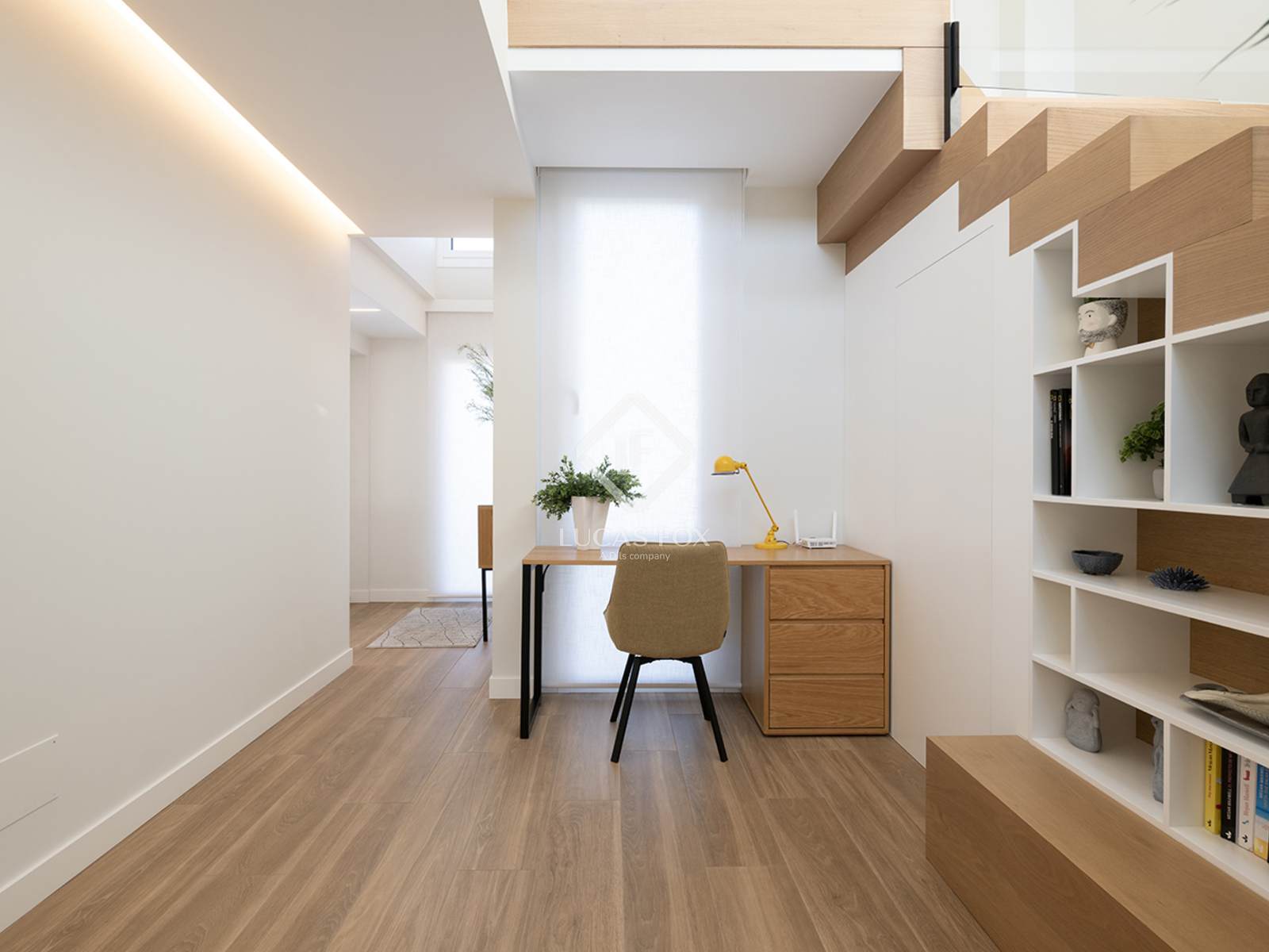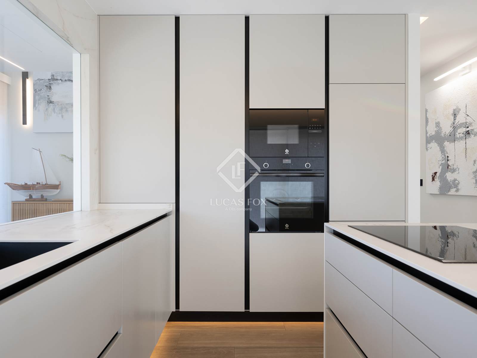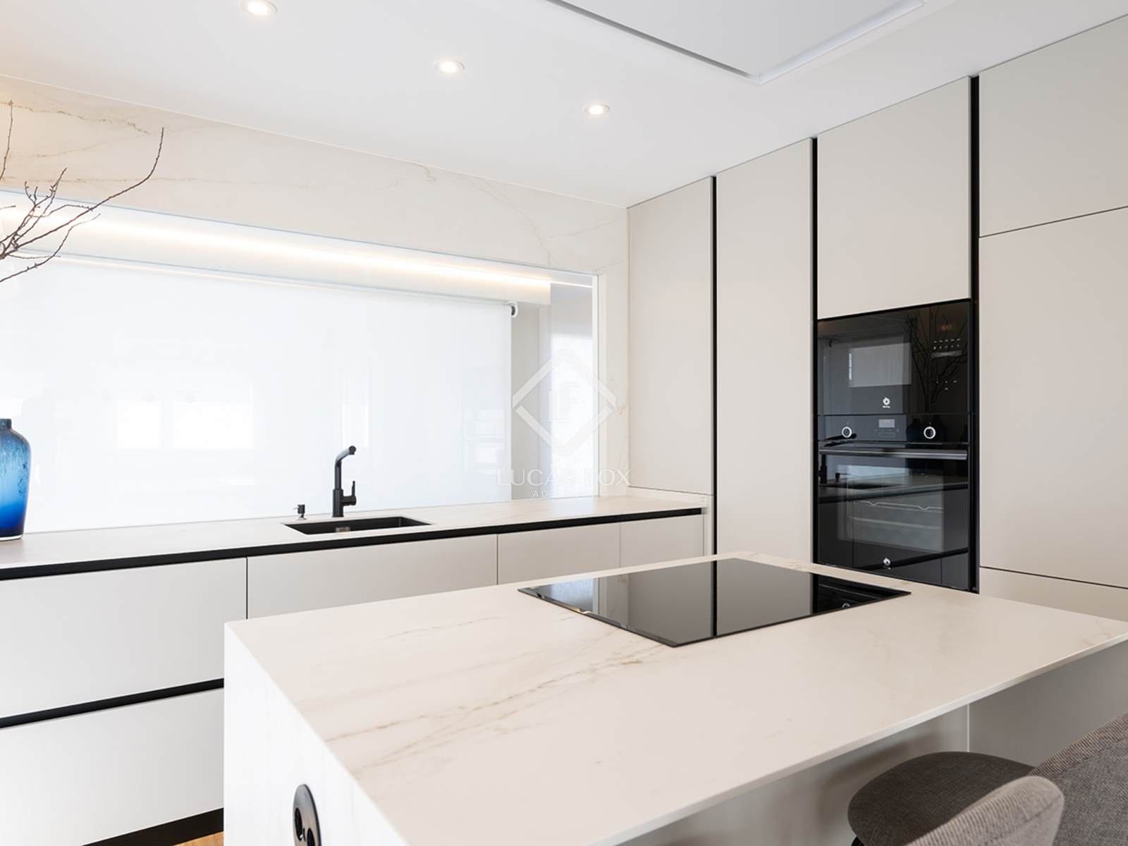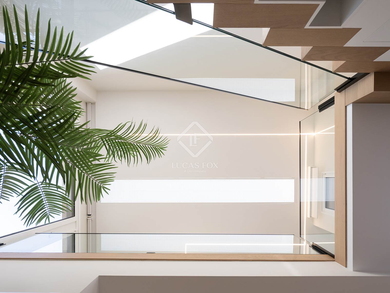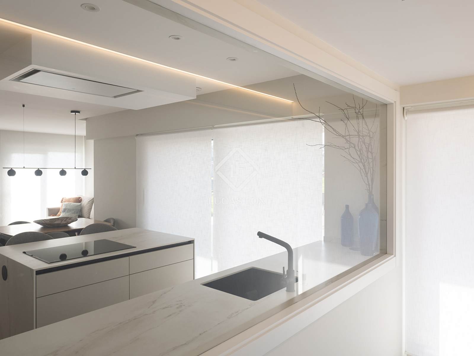 Ao chegarmos a pé, pela porta da frente, nos deparamos com um corredor com muita luz natural, proporcionada por uma longa claraboia e janelas altas. À direita, há uma cozinha planejada, praticamente sem uso, com ilha e iluminação indireta elegante, um recurso presente em toda a propriedade. Ao lado da cozinha, como parte do layout aberto, há uma sala de jantar e uma sala de estar nos fundos, com acesso ao jardim.