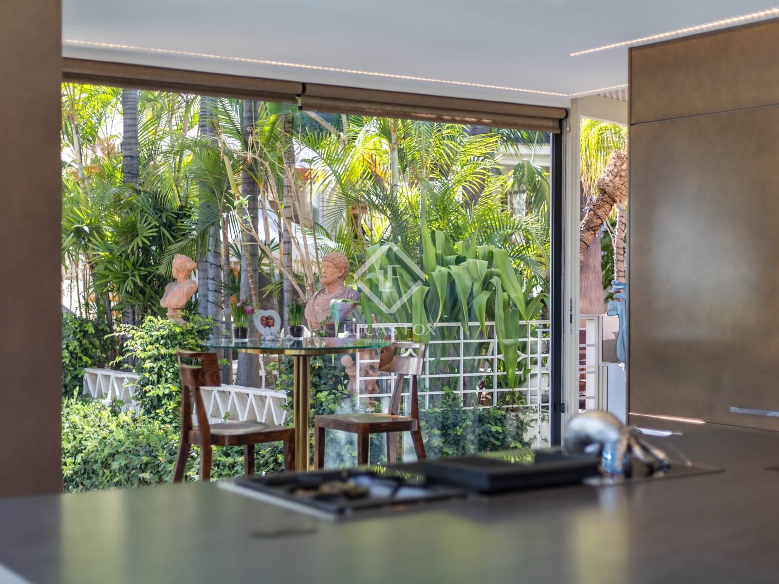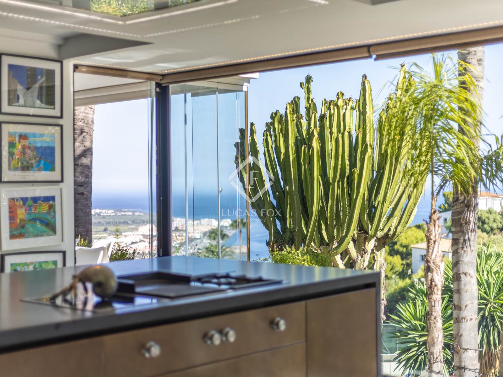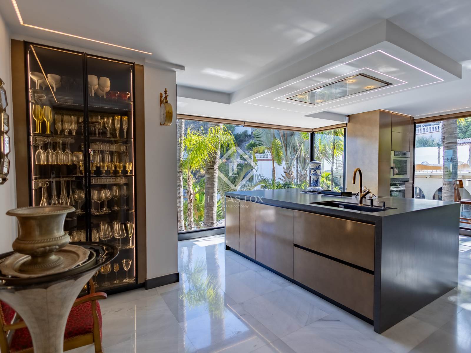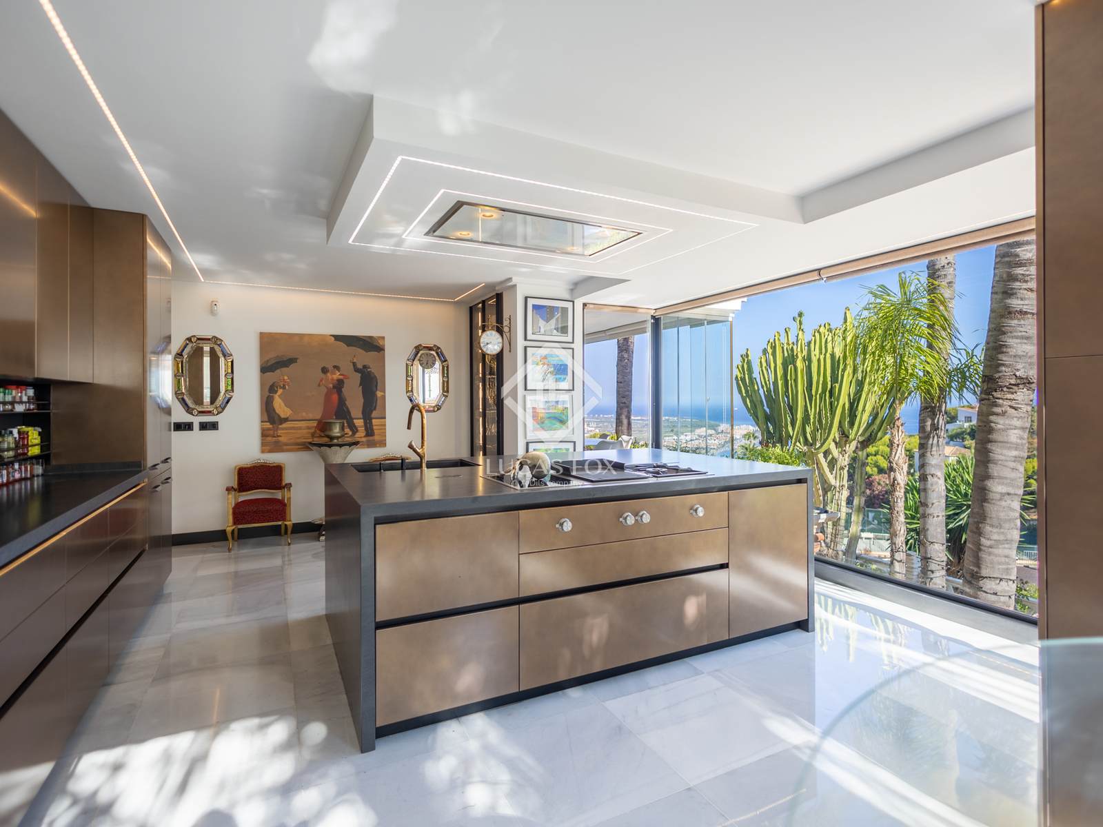 A cozinha, projetada por Gaggenau, foi pensada para os amantes da gastronomia, com uma ilha central e acesso direto à área de jantar externa. A luz inunda todos os cantos graças às grandes janelas que integram o interior ao exterior.