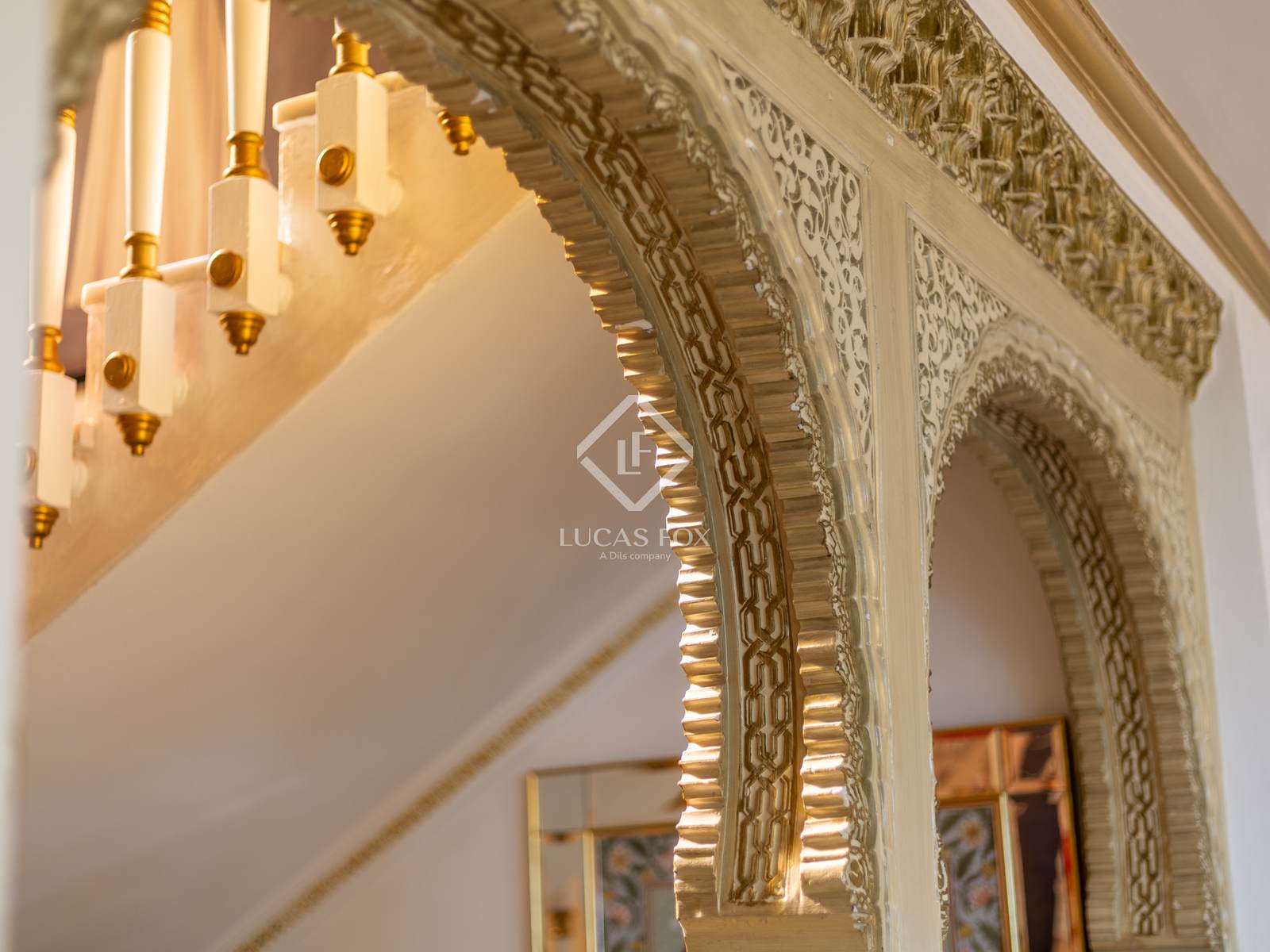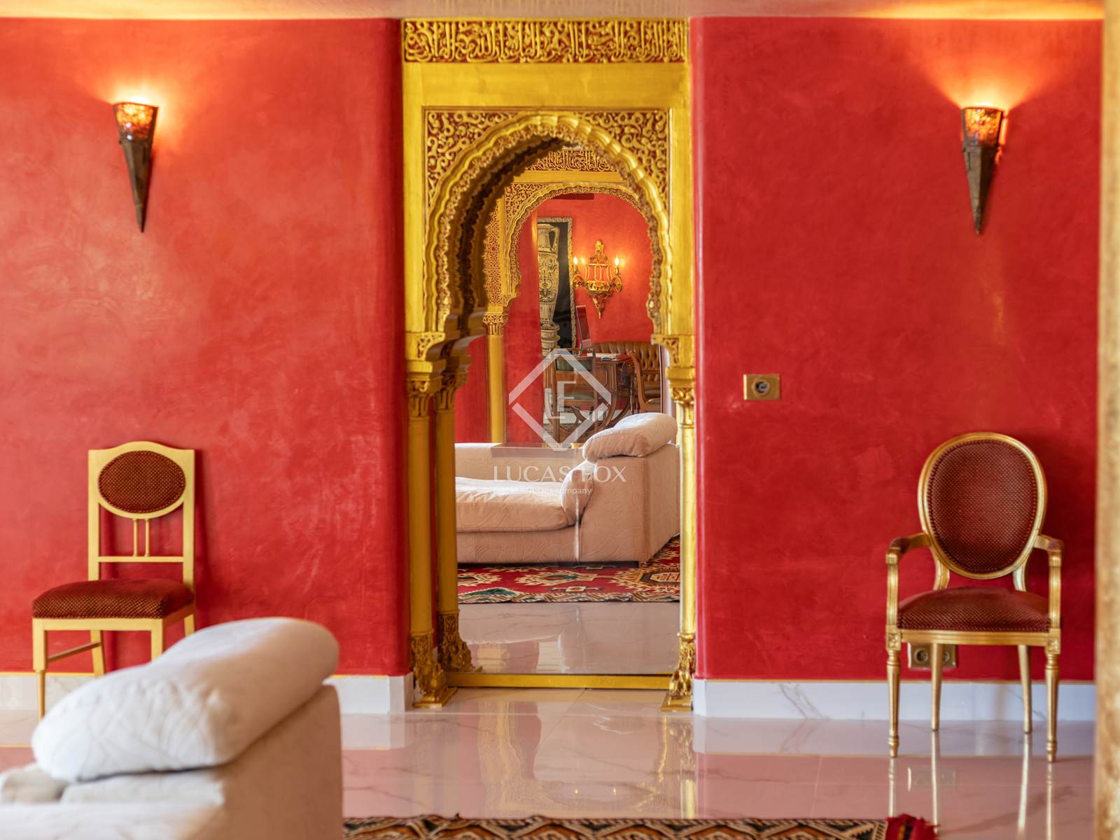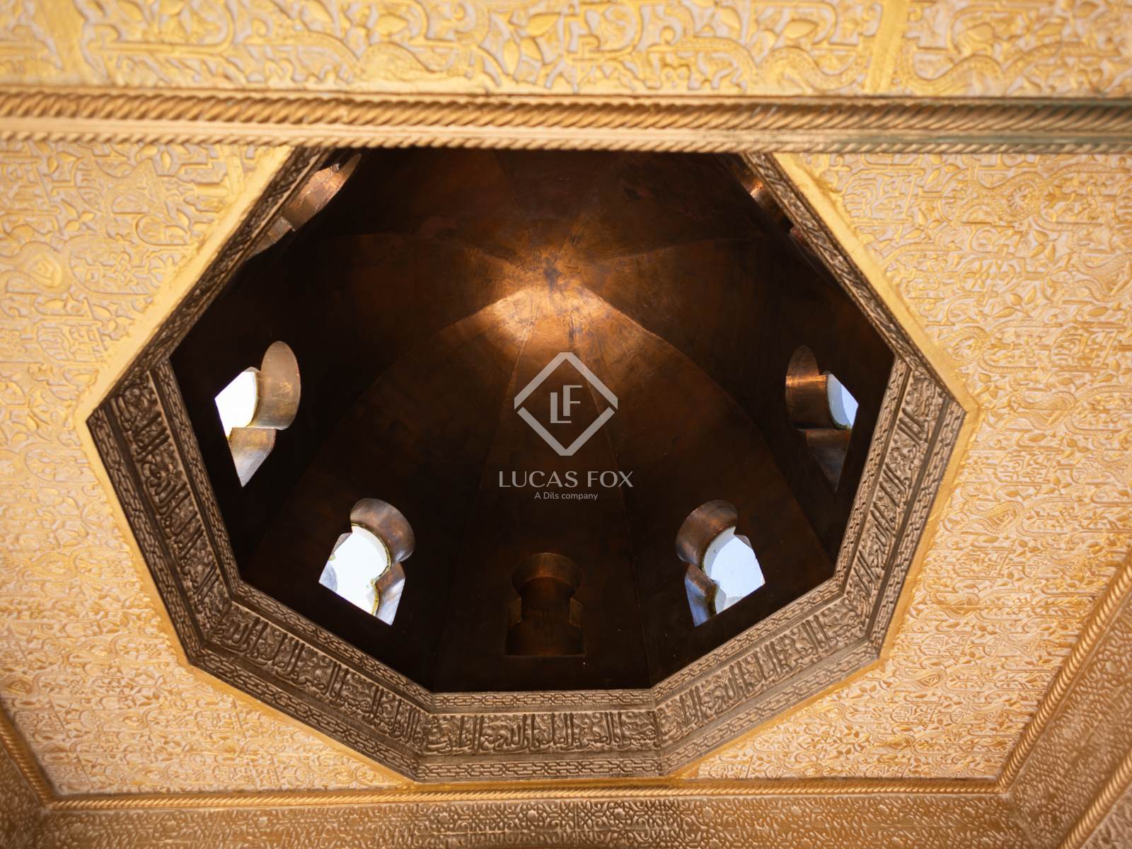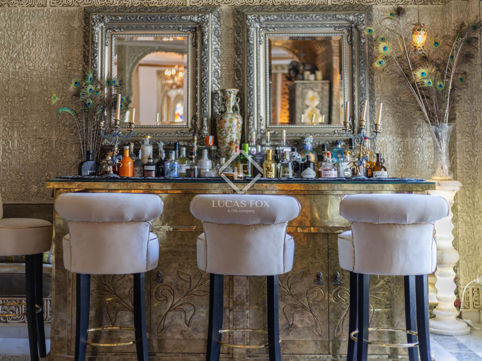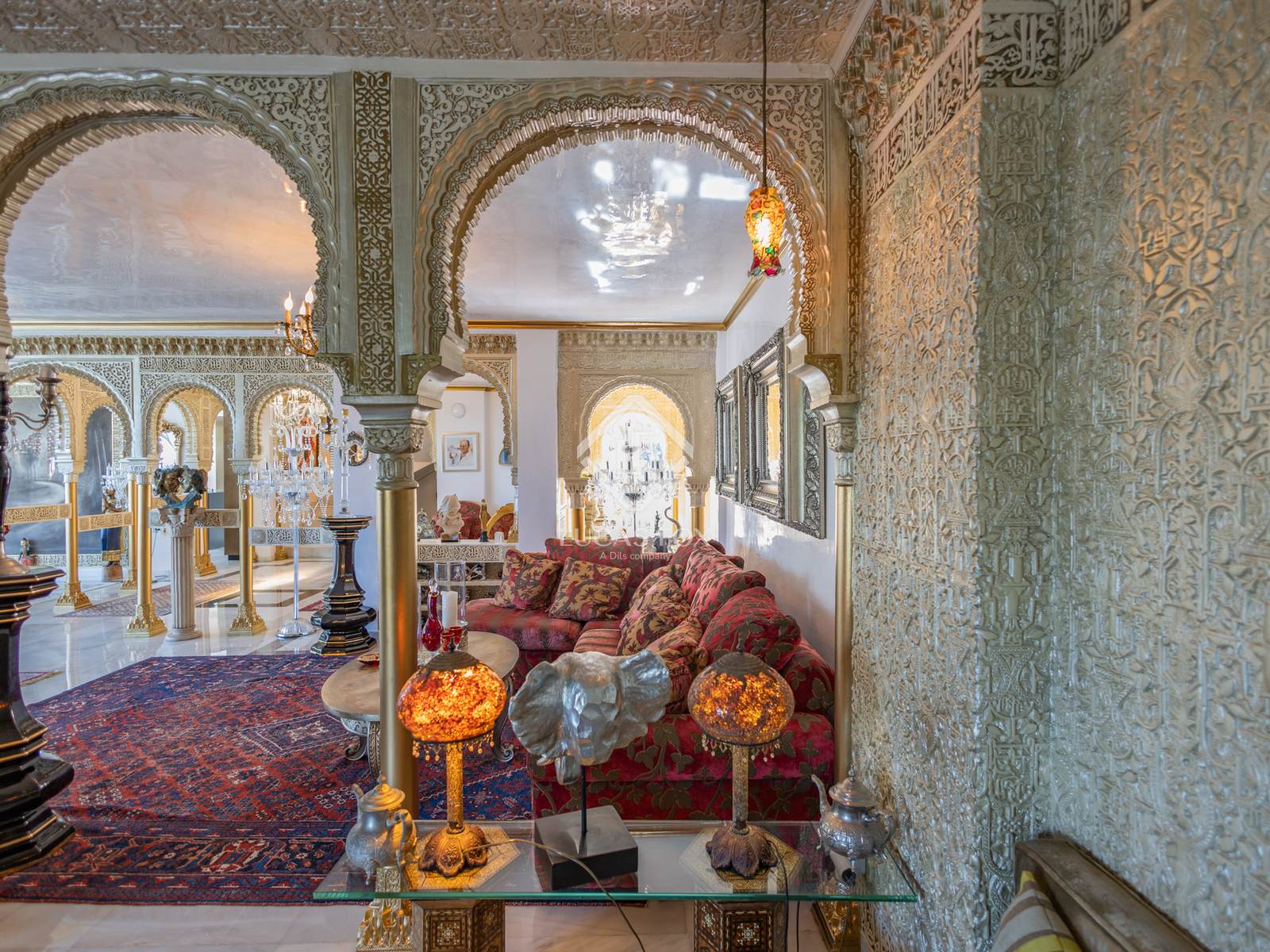 Assim que você entra pela porta principal, a casa o recebe com a grandiosidade de um palácio nasrida, ostentando um hall de entrada coroado por uma cúpula espetacular que se abre para uma majestosa sala de estar com arcos, mosaicos e detalhes artesanais que transmitem história e personalidade. Este espaço é composto por três cômodos: uma sala de estar, um lounge privativo — com um bar de design — e uma sala de jantar com vista panorâmica para o mar e a Baía de Salobreña.