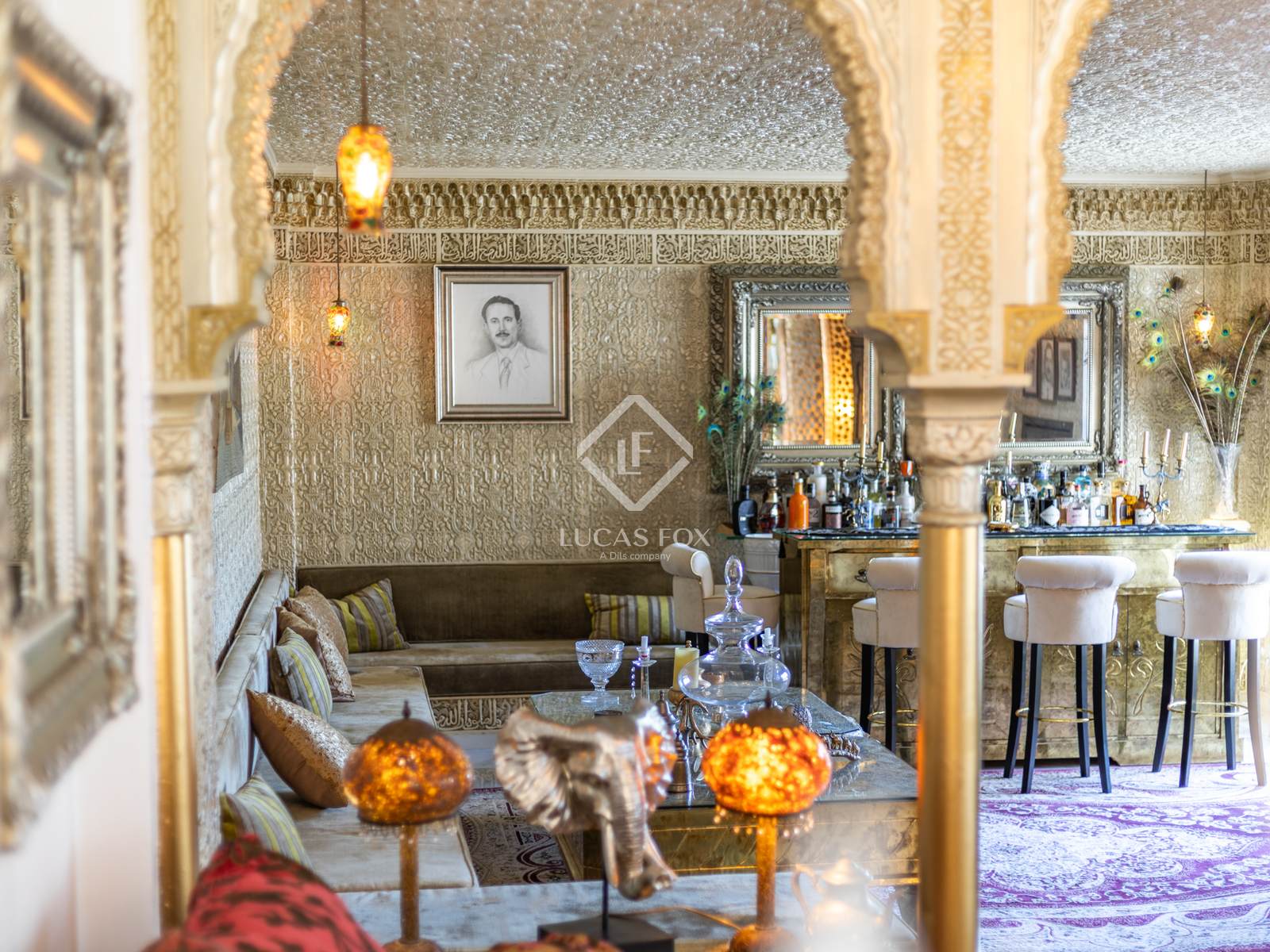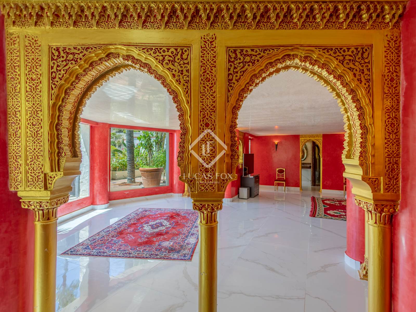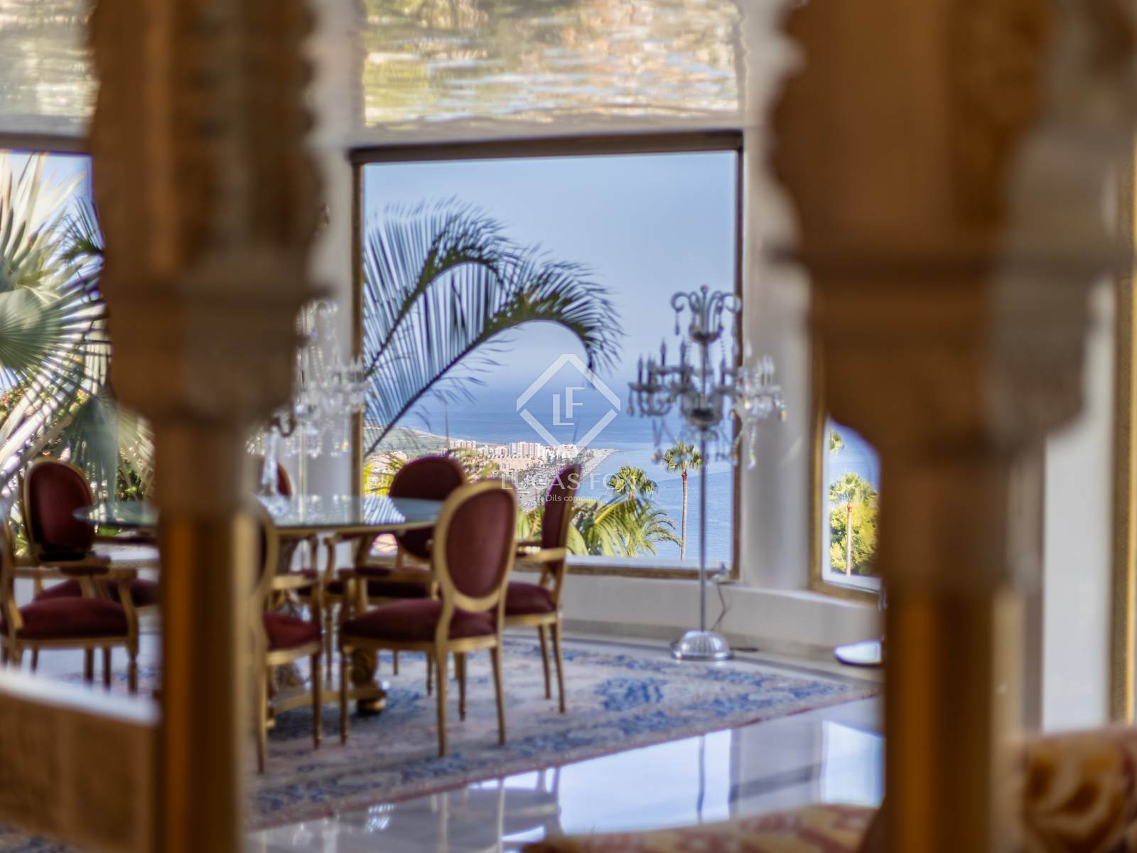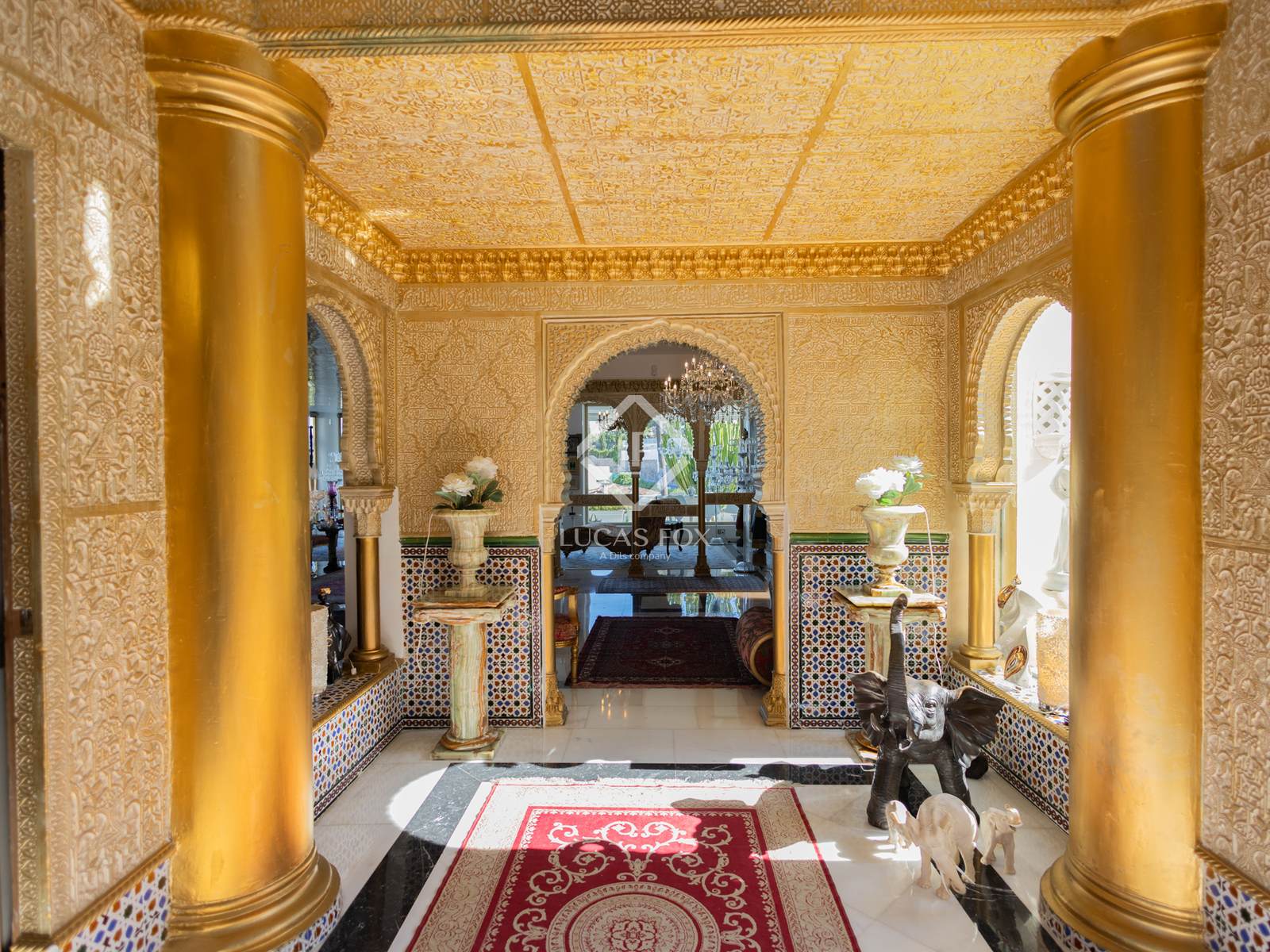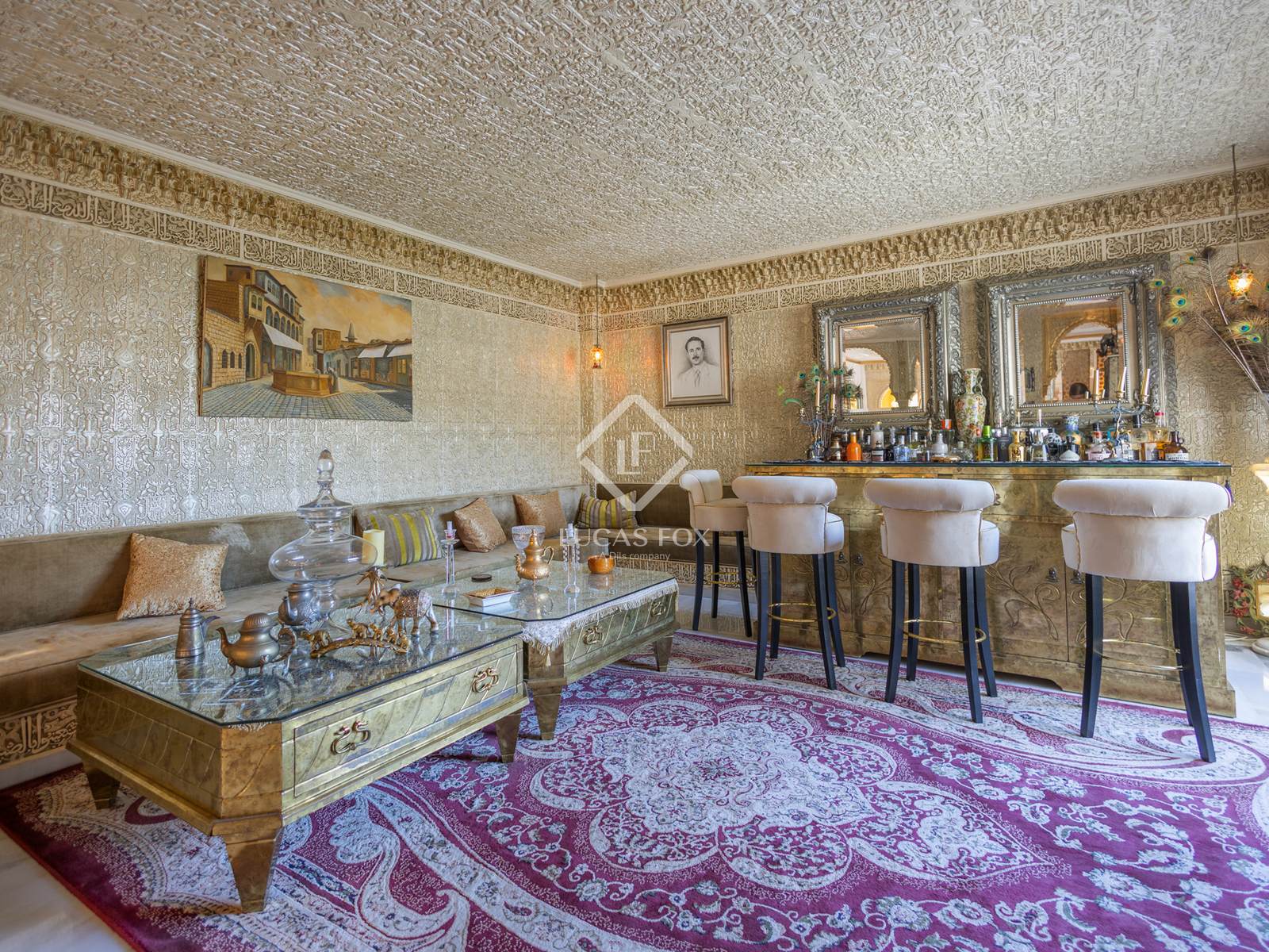 Assim que você entra pela porta principal, a casa o recebe com a grandiosidade de um palácio nasrida, ostentando um hall de entrada coroado por uma cúpula espetacular que se abre para uma majestosa sala de estar com arcos, mosaicos e detalhes artesanais que transmitem história e personalidade. Este espaço é composto por três cômodos: uma sala de estar, um lounge privativo — com um bar de design — e uma sala de jantar com vista panorâmica para o mar e a Baía de Salobreña.