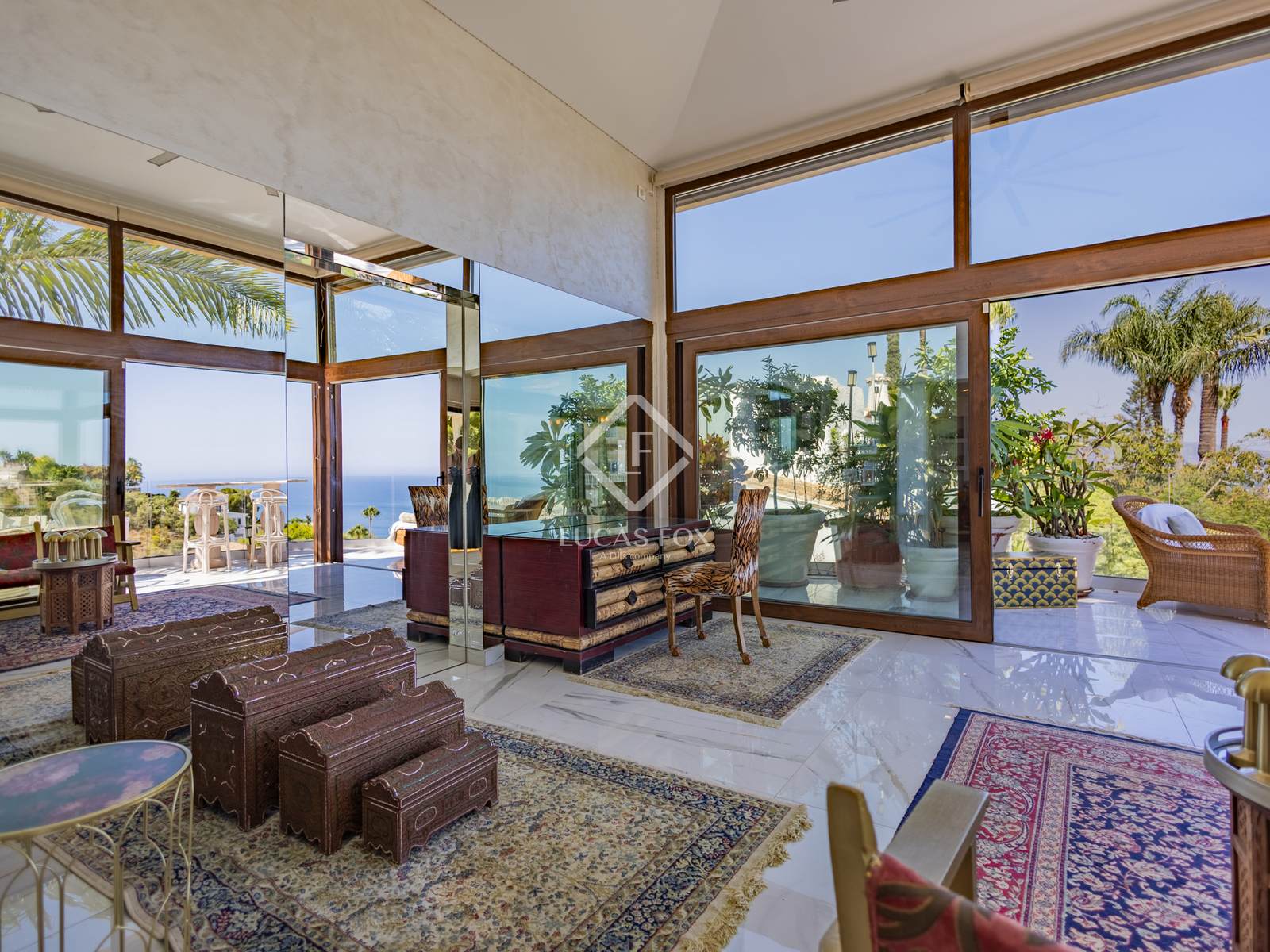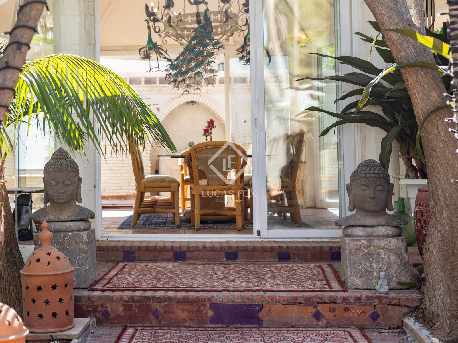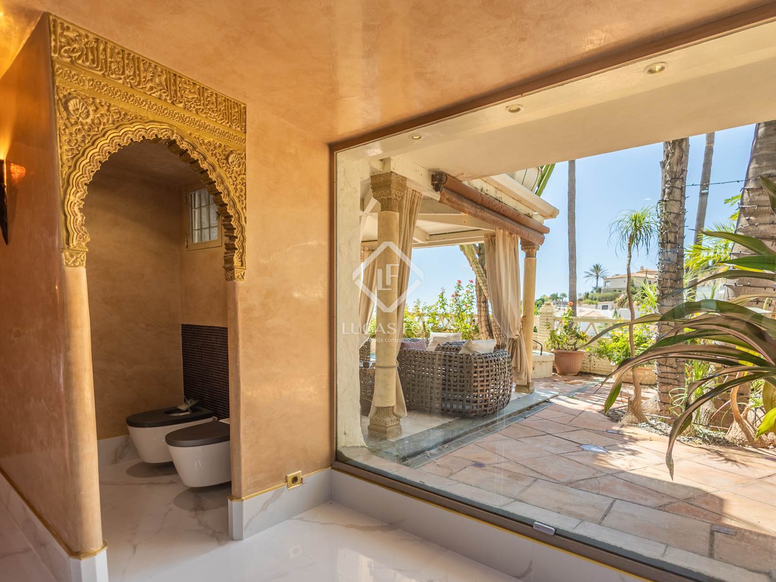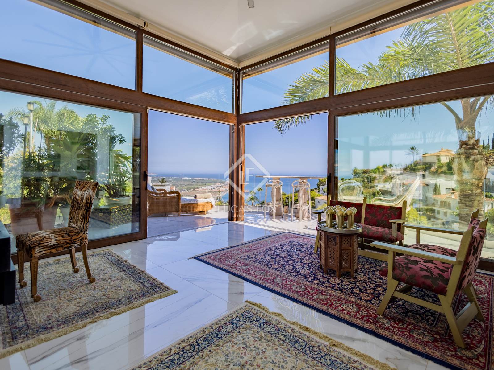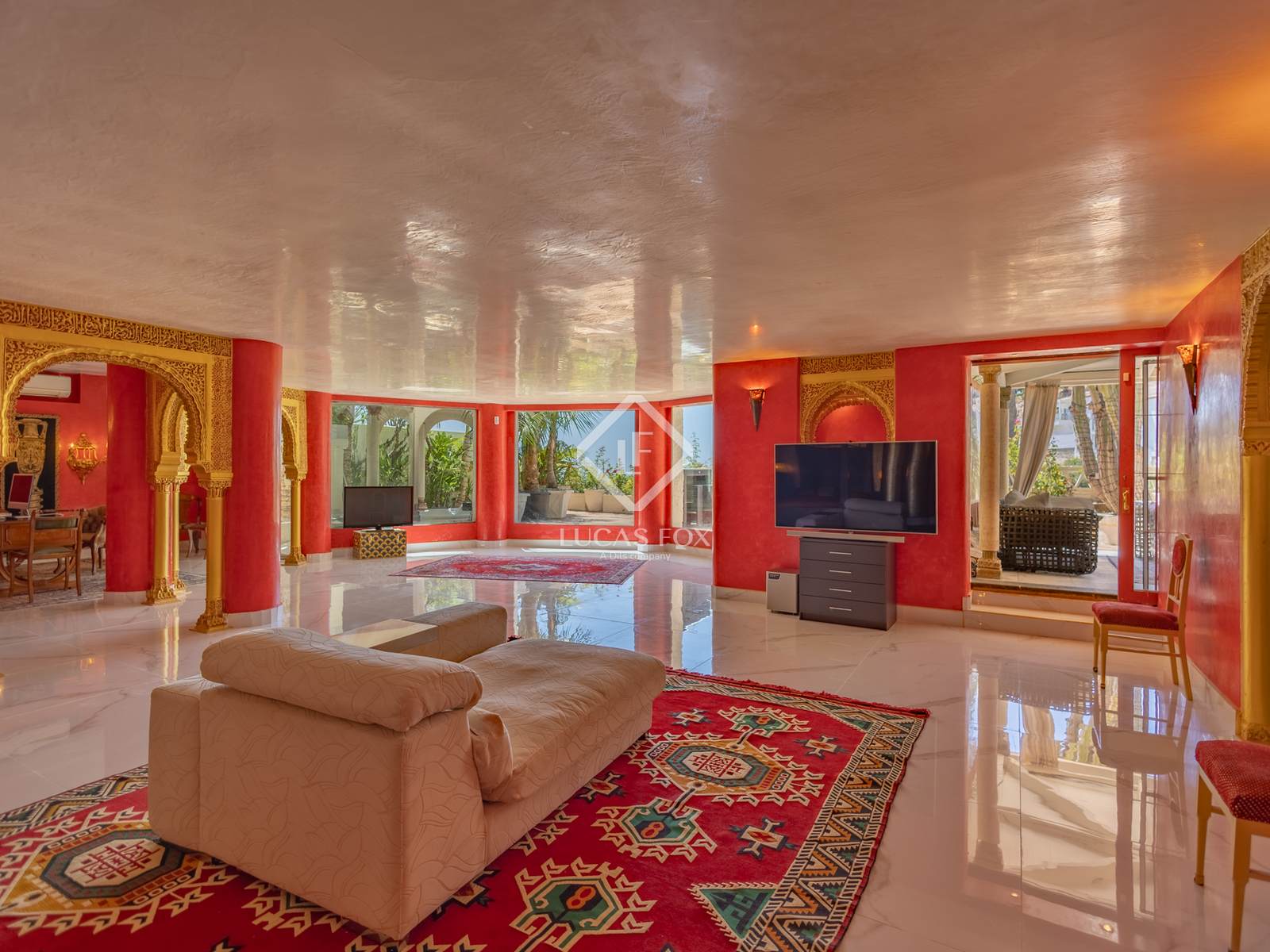 Assim que você entra pela porta principal, a casa o recebe com a grandiosidade de um palácio nasrida, ostentando um hall de entrada coroado por uma cúpula espetacular que se abre para uma majestosa sala de estar com arcos, mosaicos e detalhes artesanais que transmitem história e personalidade. Este espaço é composto por três cômodos: uma sala de estar, um lounge privativo — com um bar de design — e uma sala de jantar com vista panorâmica para o mar e a Baía de Salobreña.