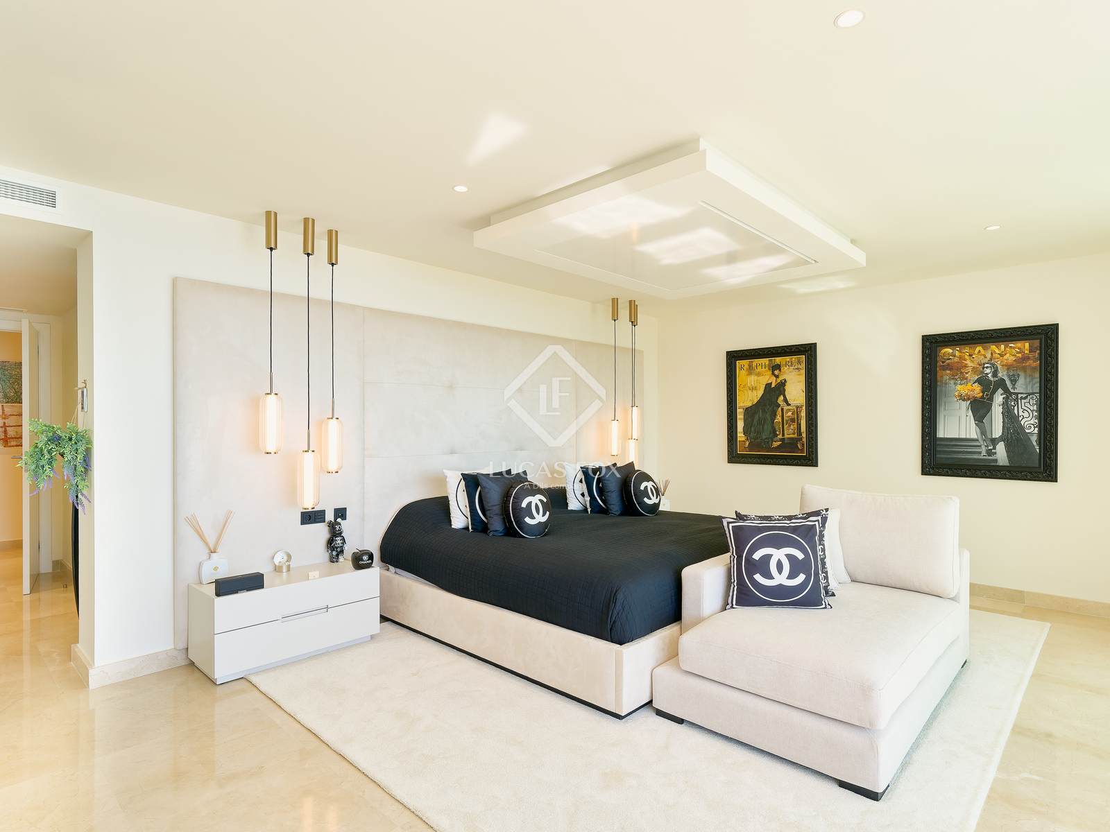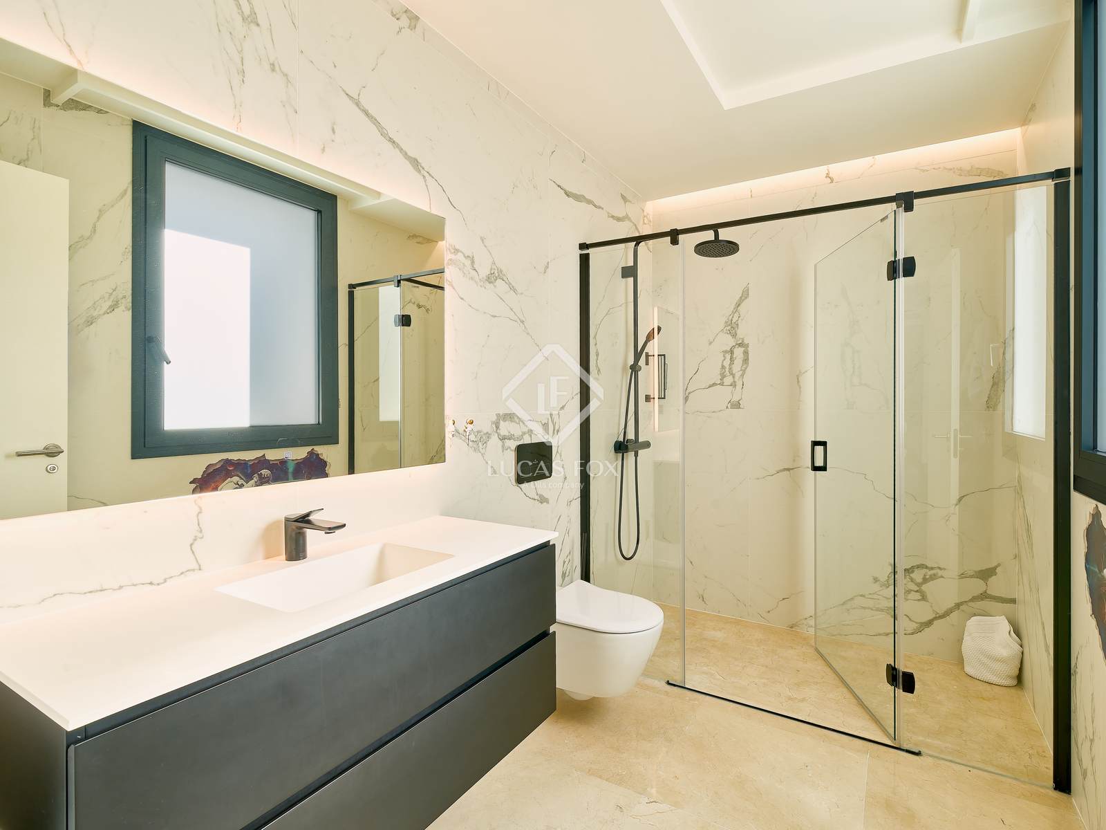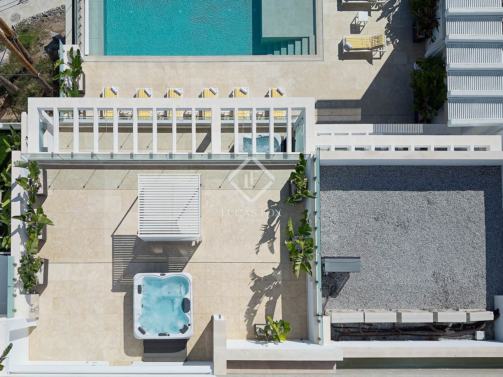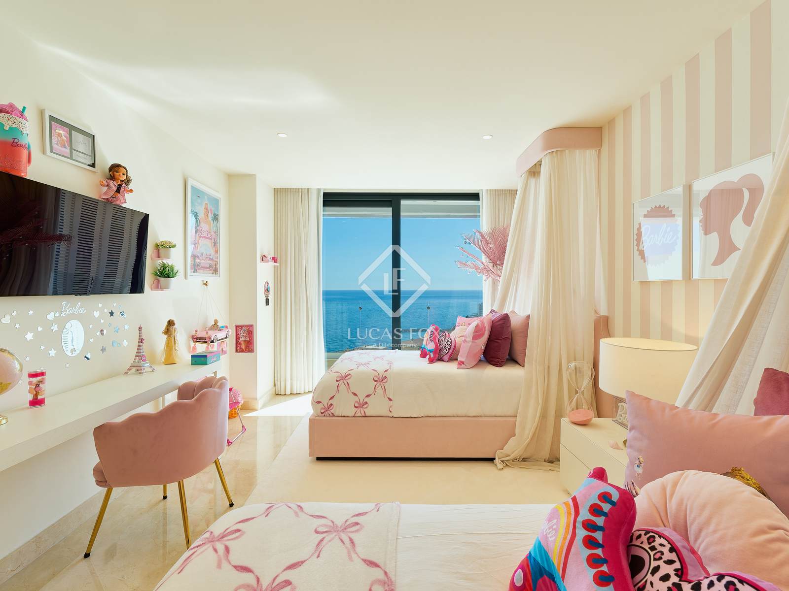 O andar superior abriga a área de dormir, dominada por uma majestosa suíte principal de 35 m² com banheiro privativo com banheira e chuveiro, closet e terraço privativo com jacuzzi, oferecendo vistas espetaculares do Mediterrâneo. Os outros dois quartos, ambos com banheiro privativo e guarda-roupas embutidos, compartilham um terraço. Por fim, um elegante escritório completa este andar, ideal para teletrabalho.