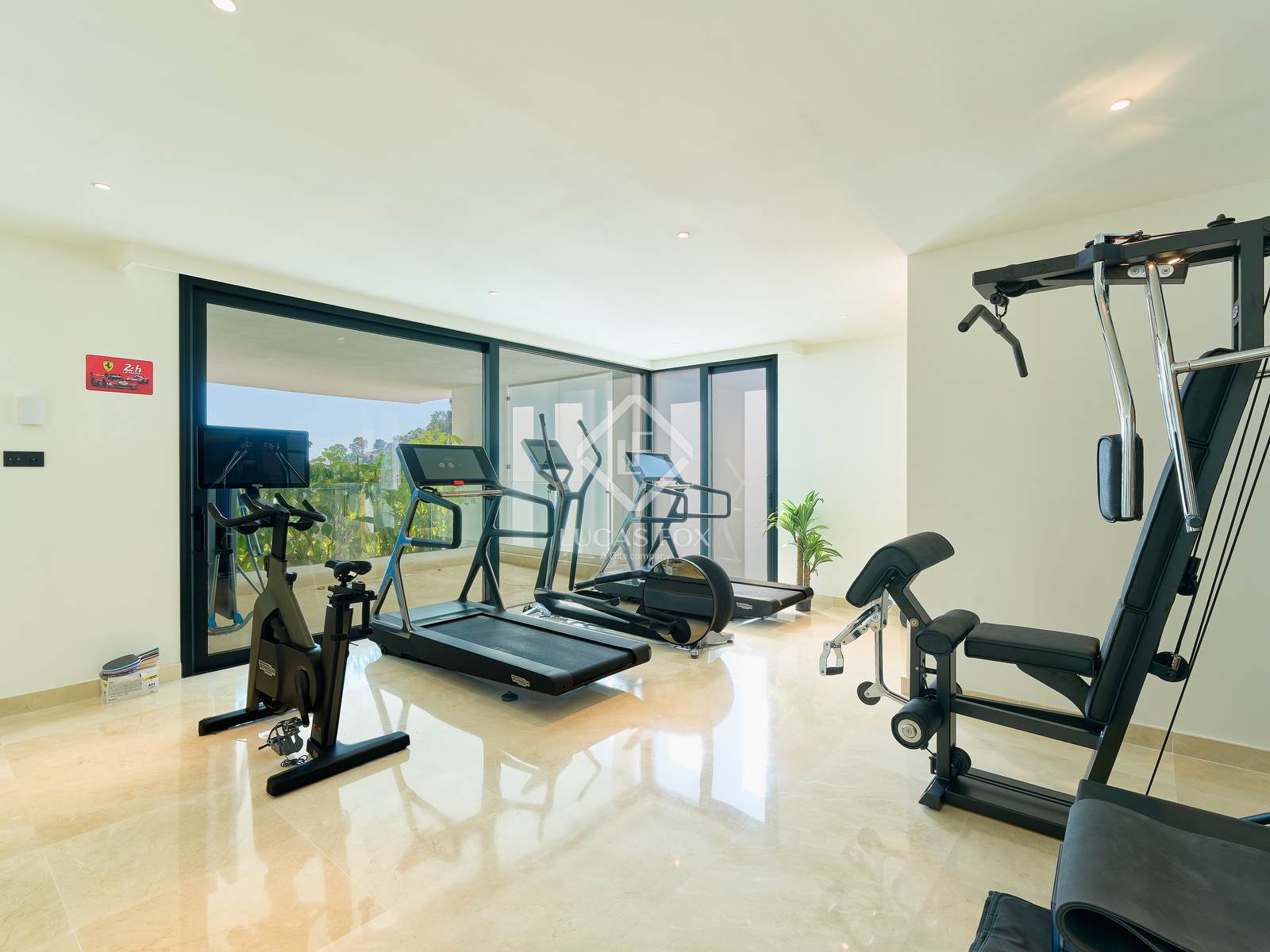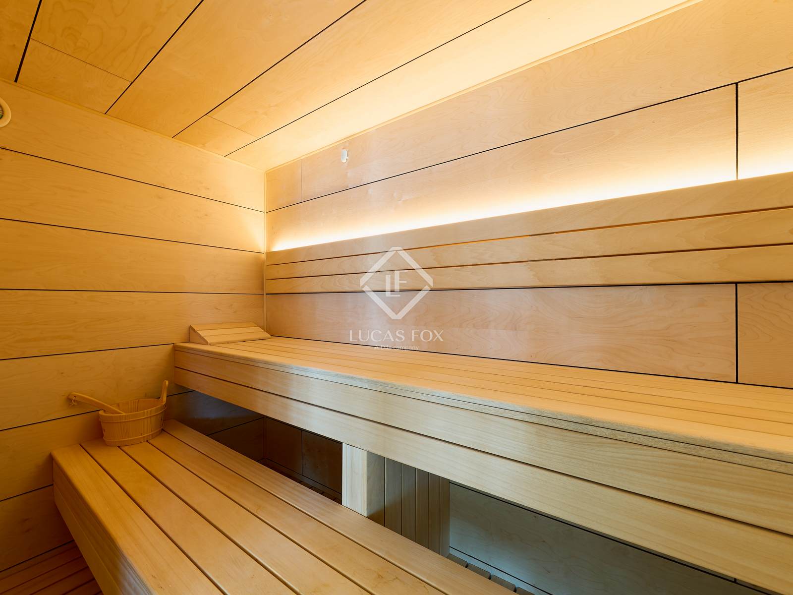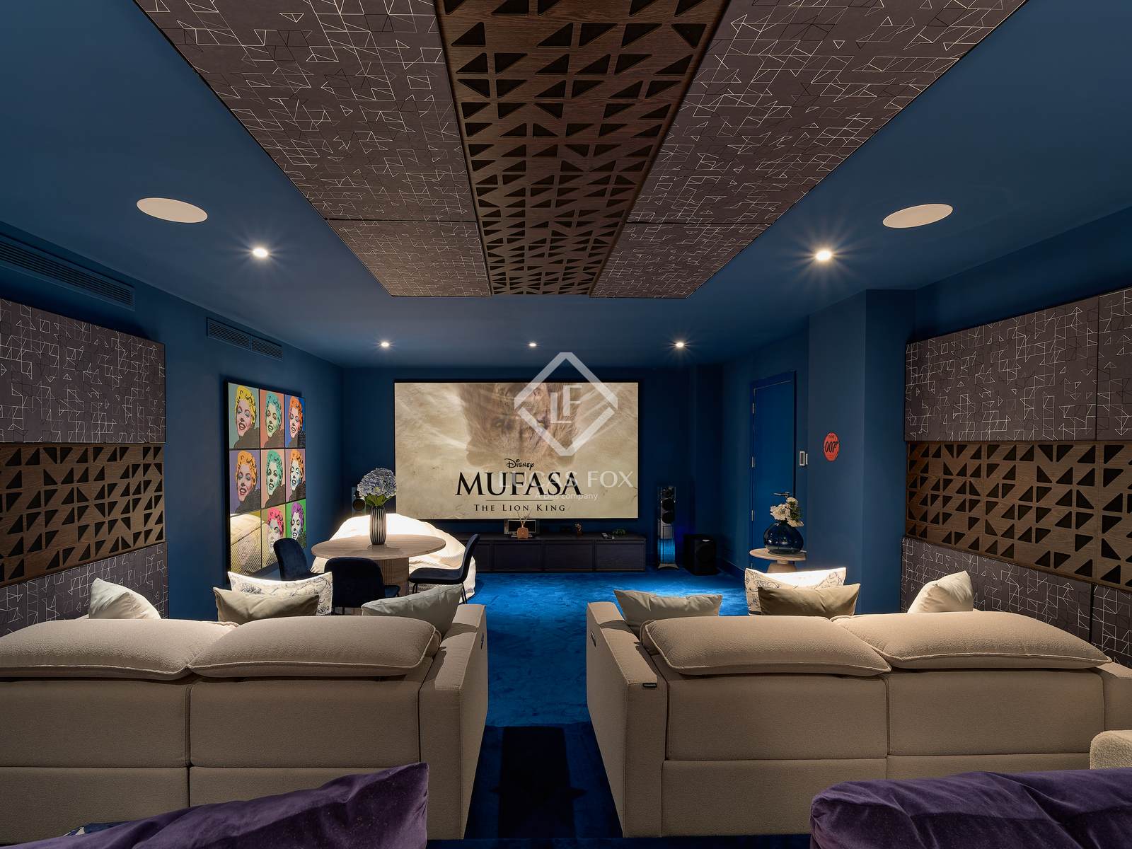 O andar inferior oferece quase 250 m² de espaço de lazer e bem-estar, com sala de cinema privativa, academia totalmente equipada, sauna, sala de jogos para crianças e três quartos espaçosos com banheiros privativos e guarda-roupas embutidos.
