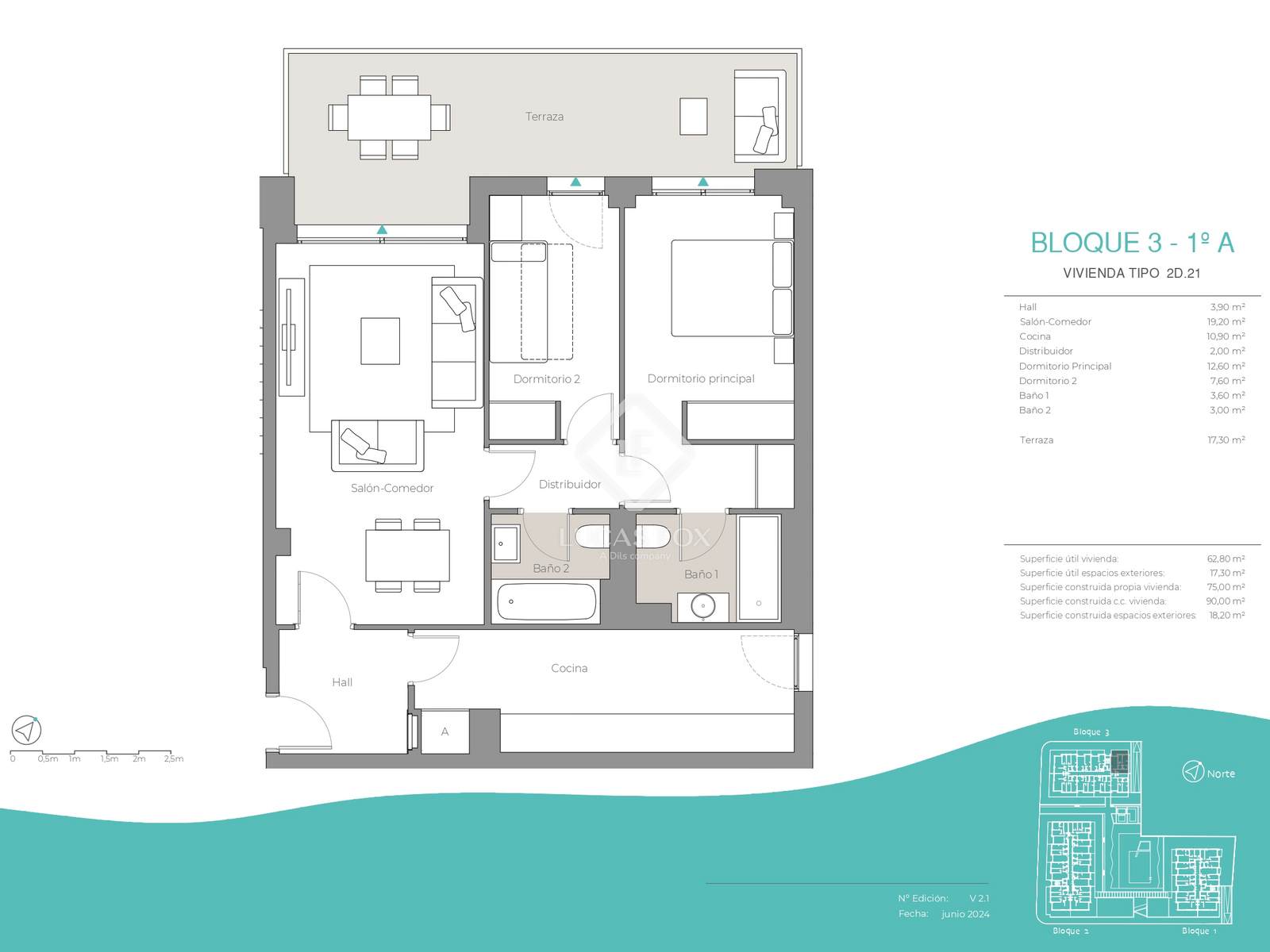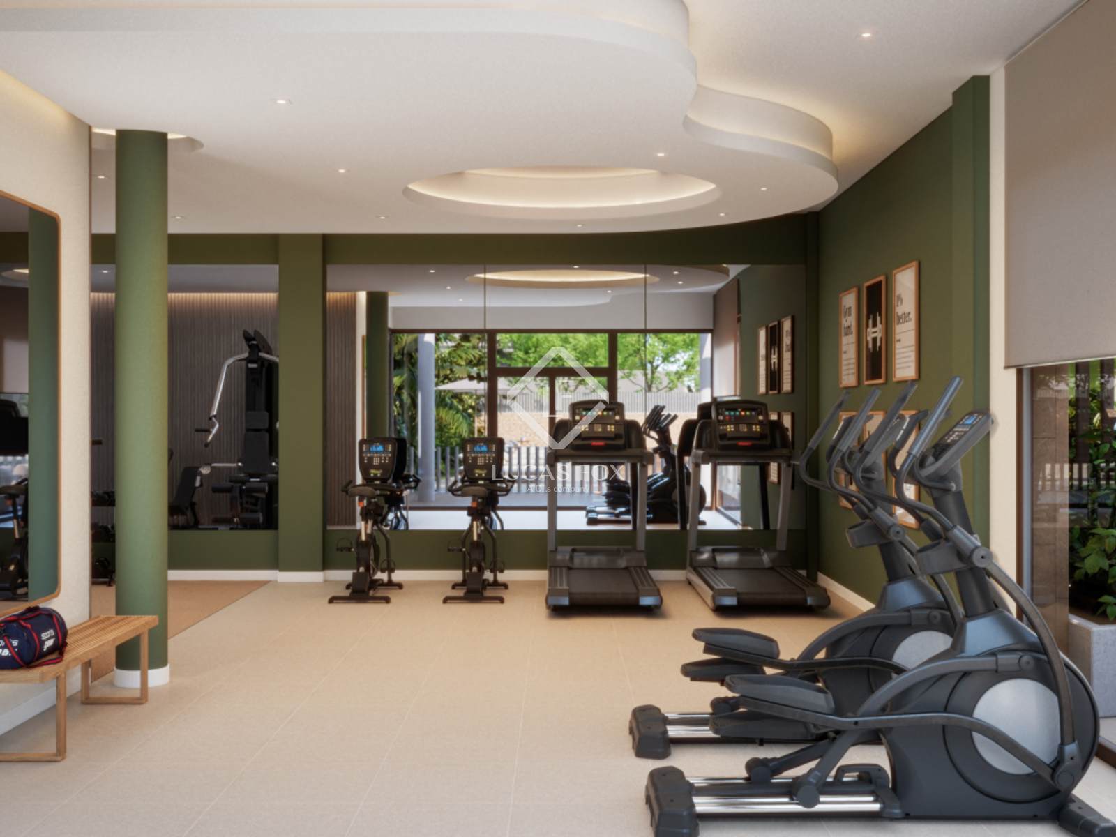 Este exclusivo imóvel no primeiro andar do edifício número 3 tem uma área de 90 m² e um terraço privativo de 18 m². O imóvel dispõe de uma espaçosa sala de estar e jantar com cozinha americana, com acesso direto ao terraço através de amplas janelas que permitem a entrada de bastante luz natural. Há dois quartos e dois banheiros.
