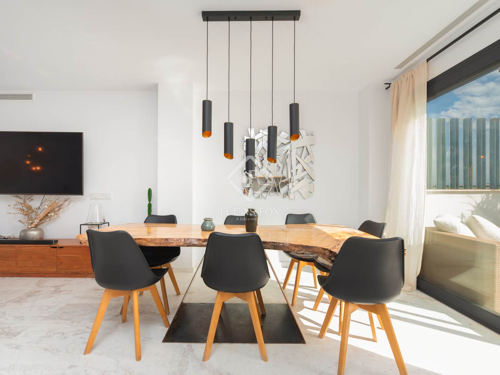 Desde o momento em que entramos, o apartamento impressiona com seus espaços amplos e abundante luz natural. A área social principal, localizada no andar superior, apresenta um layout aberto com uma sala de estar espaçosa, uma aconchegante sala de jantar e uma cozinha moderna totalmente equipada, projetada para aliar estilo e funcionalidade. Este andar também inclui um lavabo. Grandes janelas do chão ao teto se abrem para um belo terraço com vista para a natureza ao redor e as colinas ondulantes de Ibiza, o local perfeito para relaxar, receber amigos ou desfrutar das suaves noites mediterrâneas da ilha.