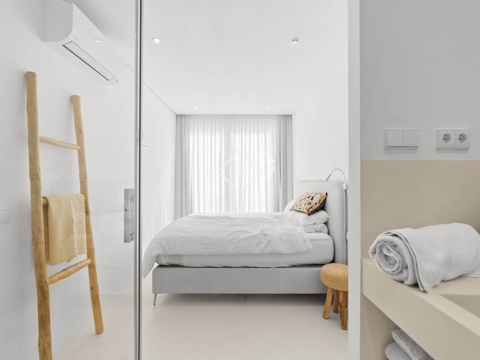 Praia de areia privada — algo extremamente raro em Ibiza.