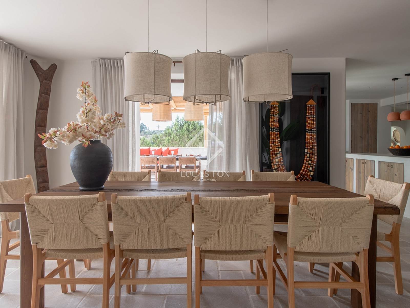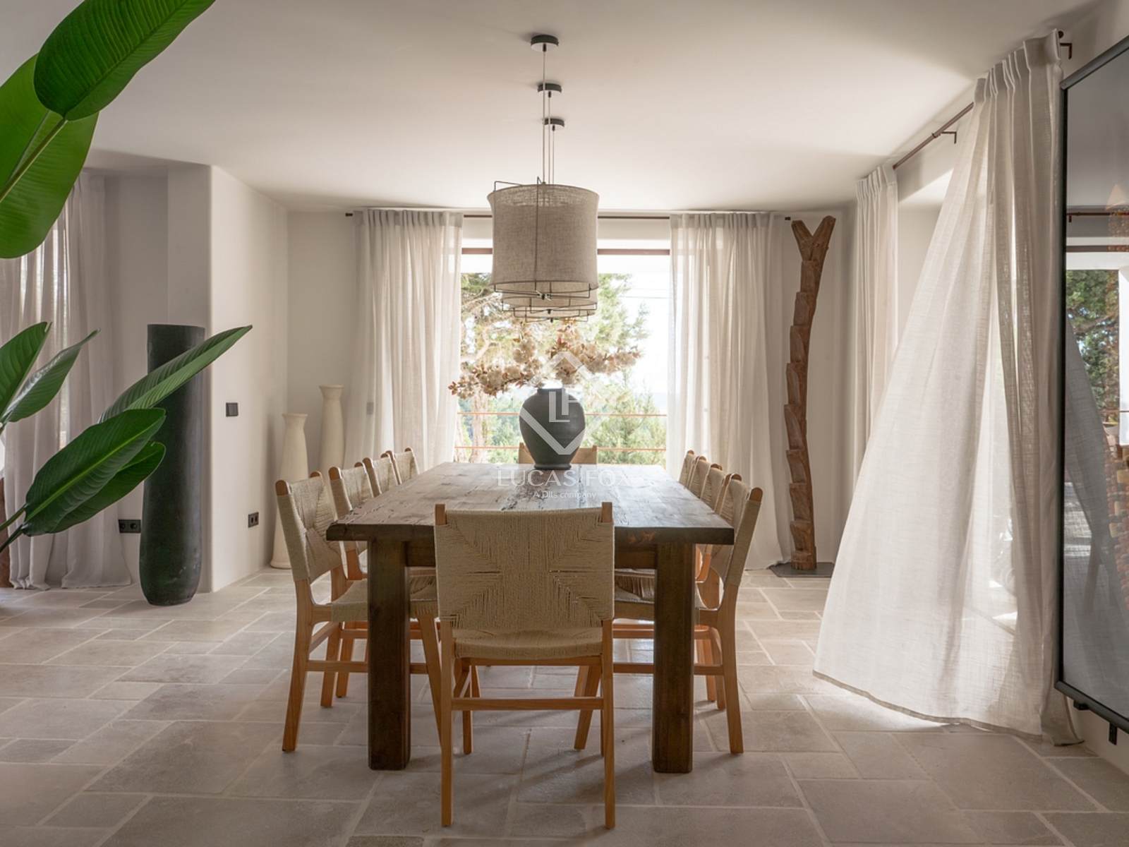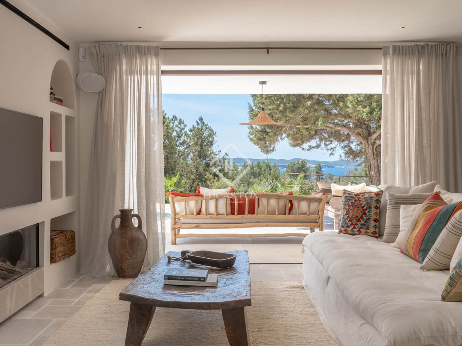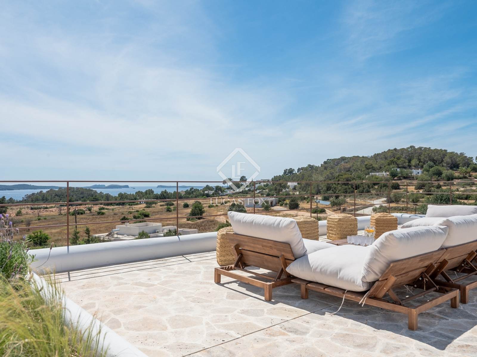 Situada em um terreno privativo de 2.200 m², a vila oferece 330 m² de espaço interno e ostenta vistas panorâmicas espetaculares do mar, da paisagem ao redor e dos famosos pores do sol de Ibiza.